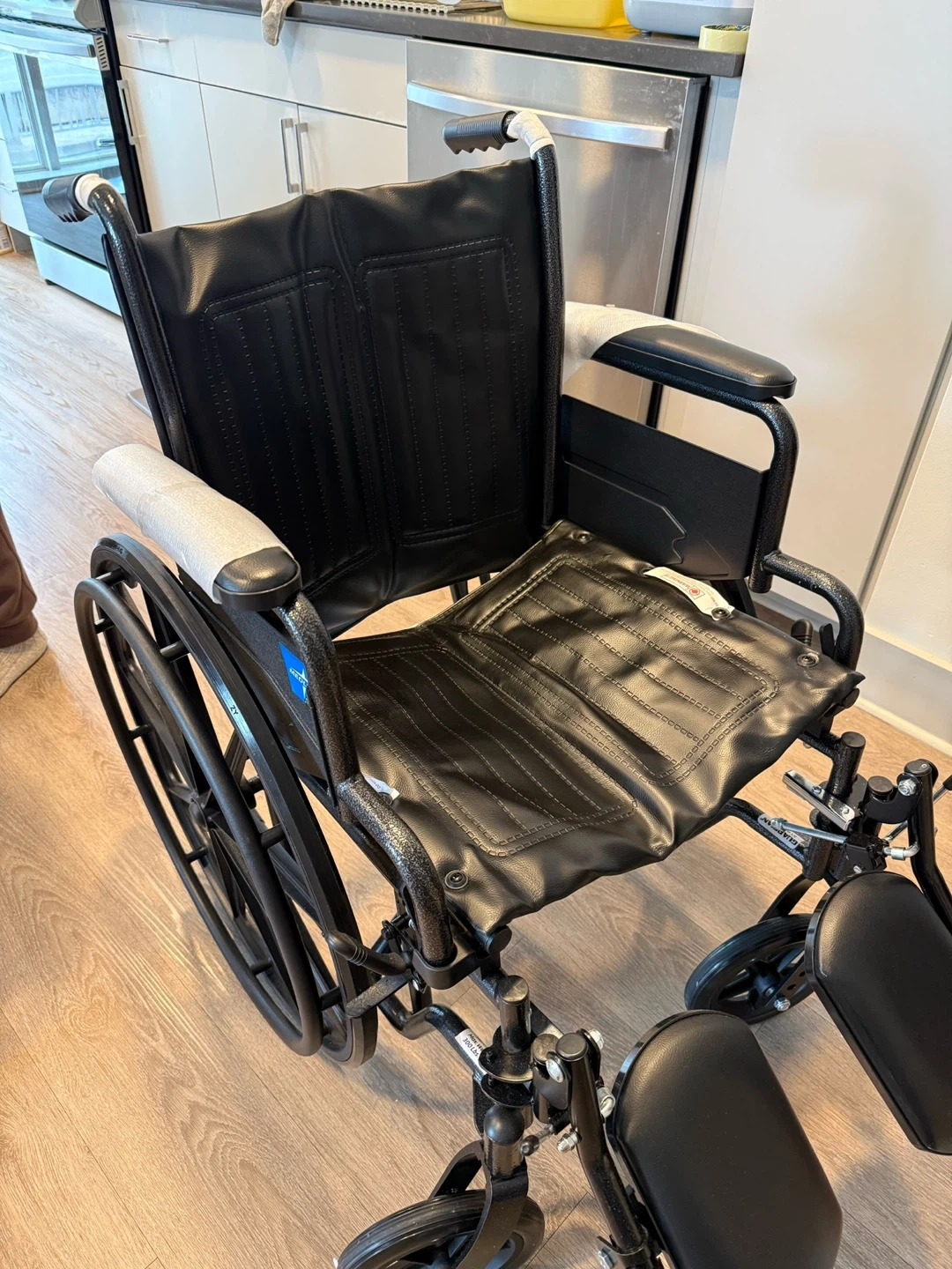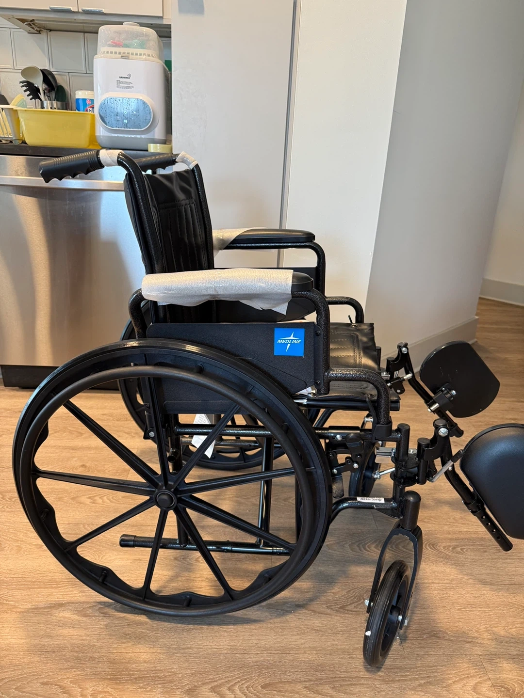 I'm selling a brand new Medline black wheelchair. It's in great condition and ready for a new owner. It has a comfortable seat and sturdy frame for easy mobility.