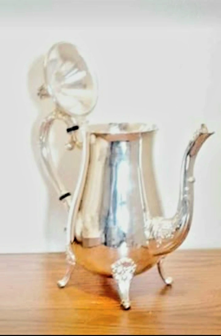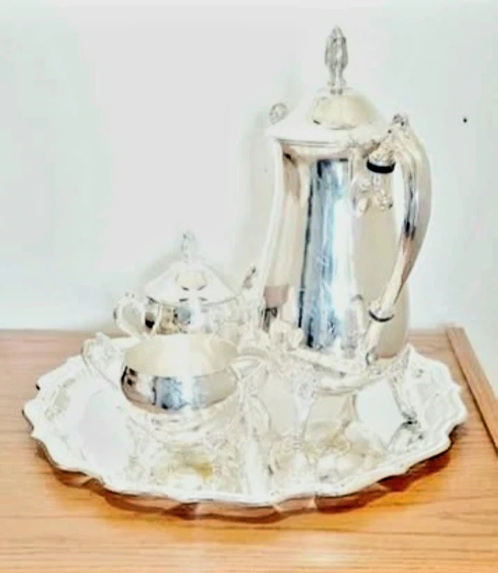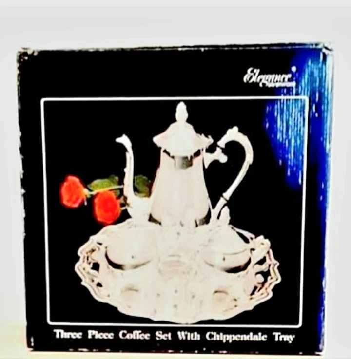 This is a New, four-piece Elegance Silver-plated Brass Coffee Set with a Chippendale tray, perfect for adding a touch of sophistication to your coffee service. This set is brand new, still in its original packaging, and ready to be the centerpiece of your dining collection.