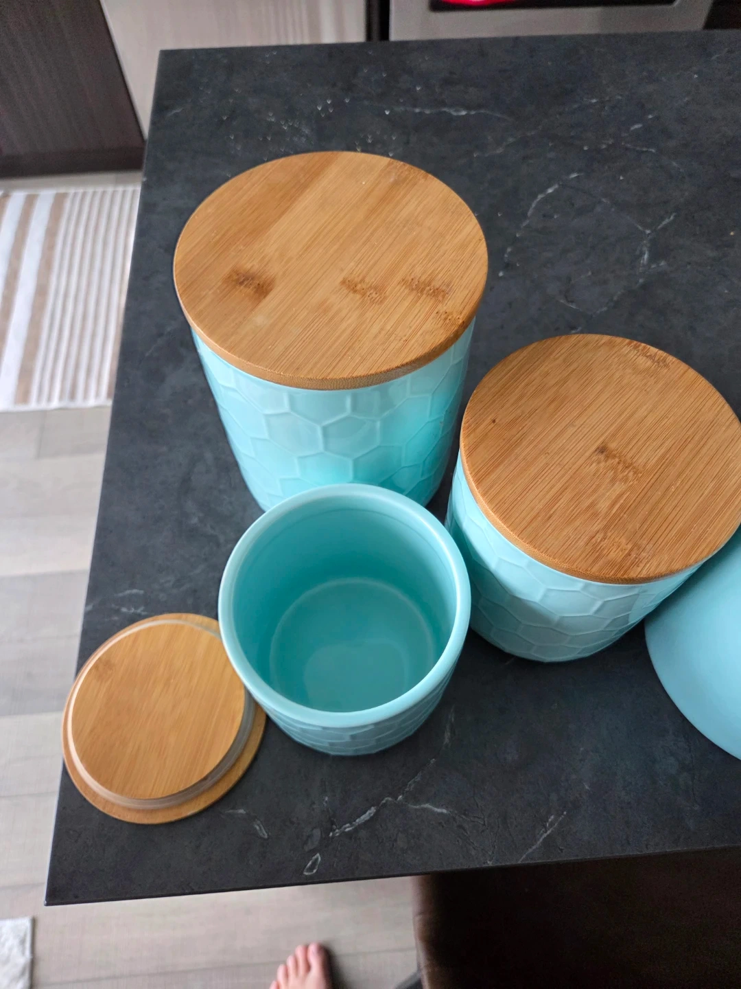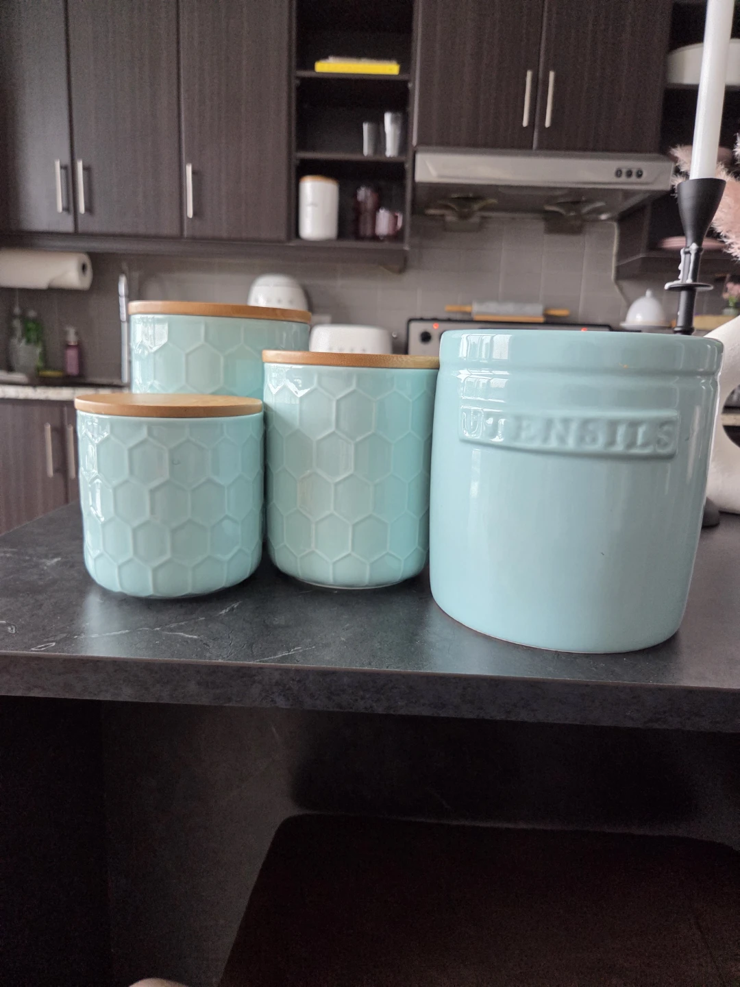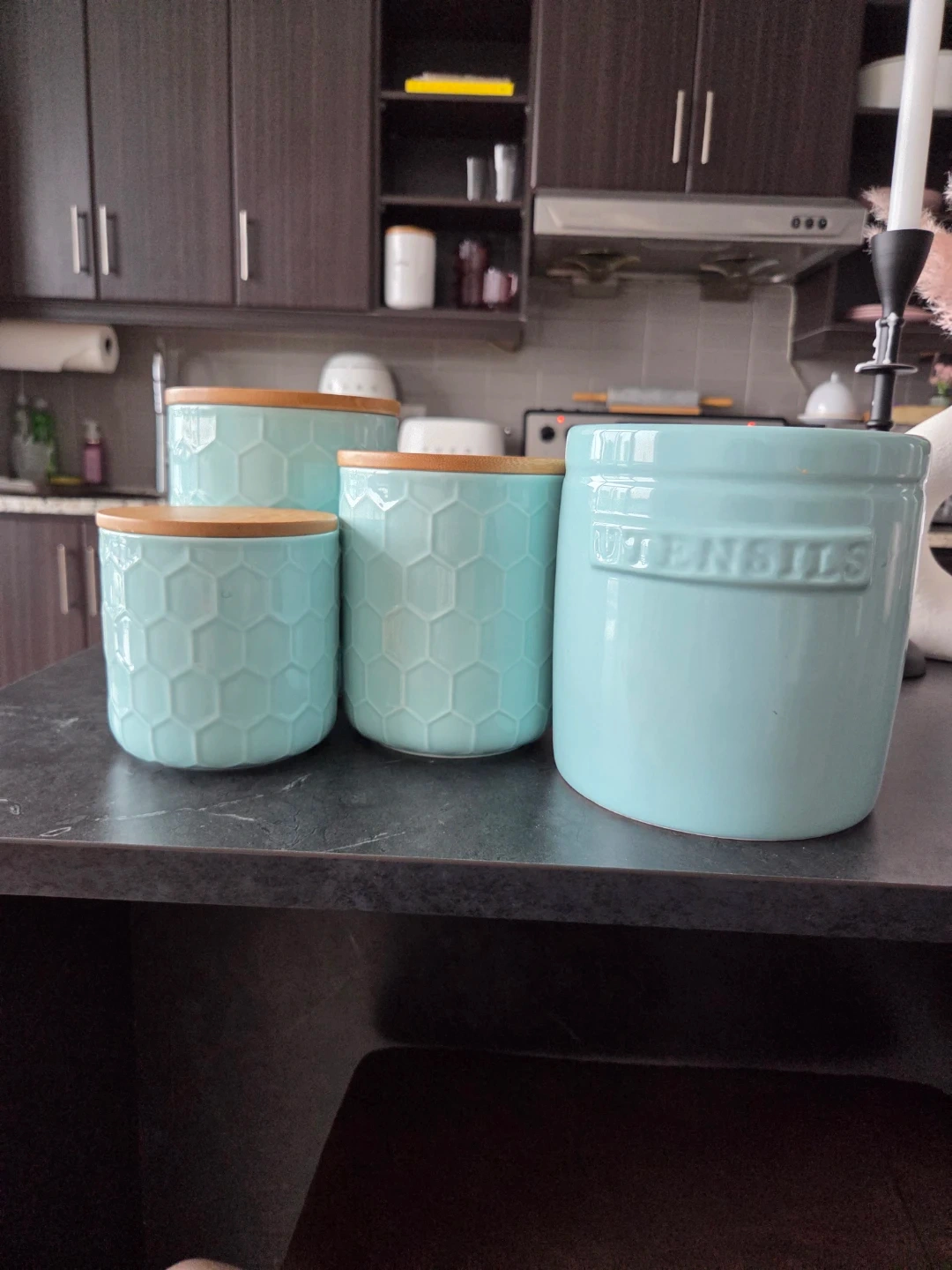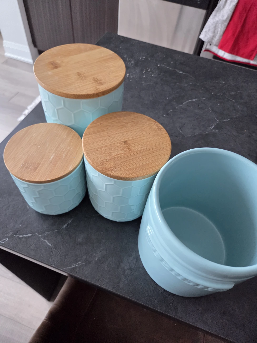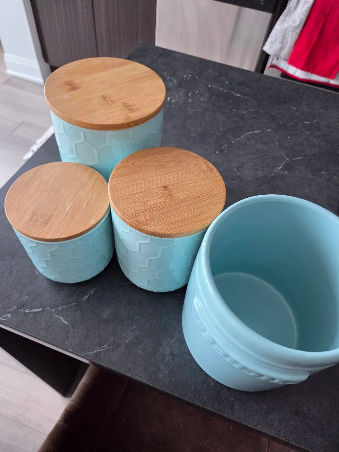 Includes three canisters with wooden lids and one utensil holder. They're in great condition and would look lovely in any kitchen!