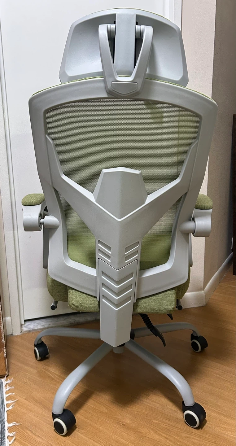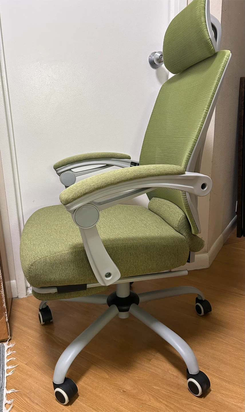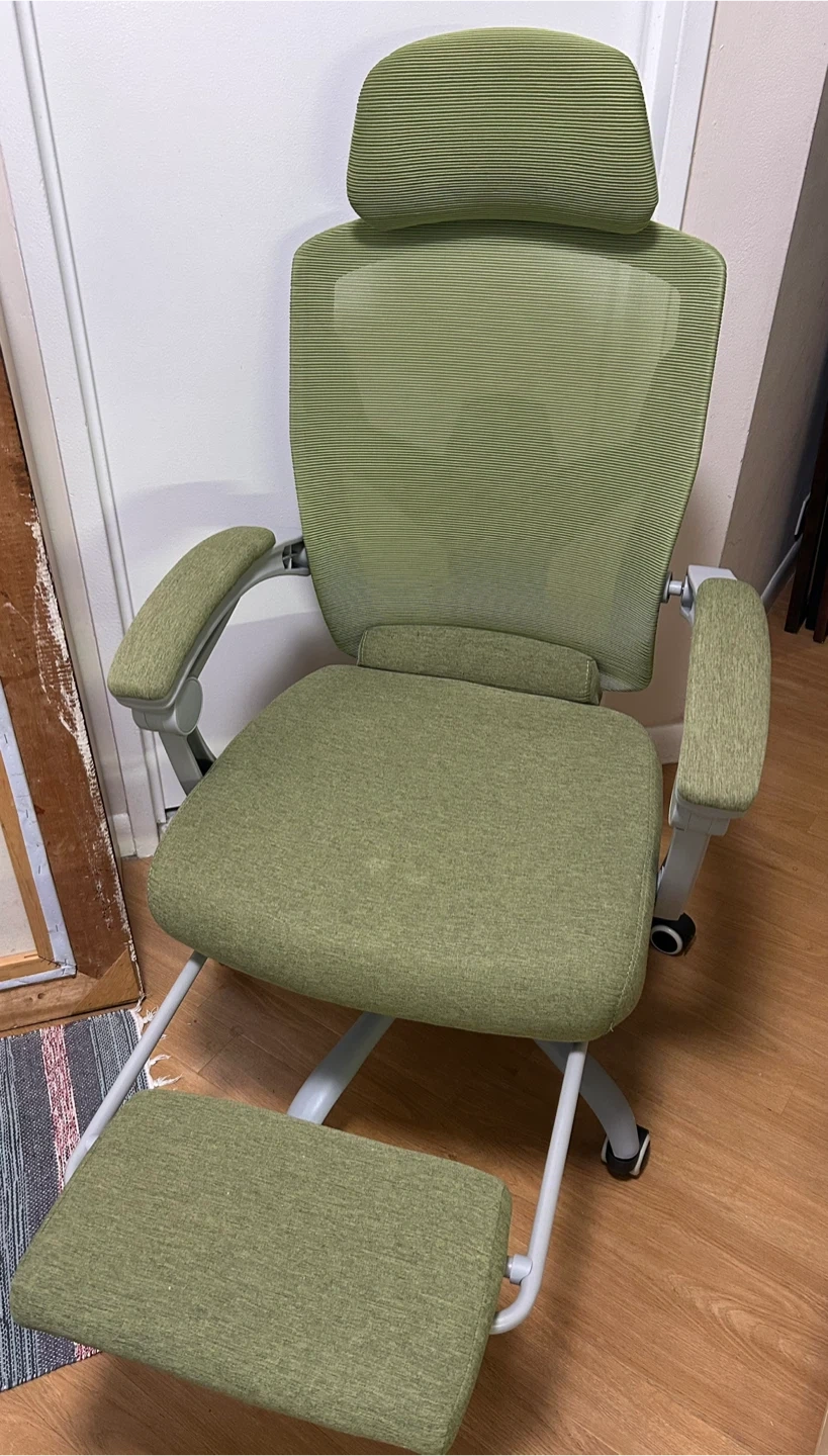 This is a green ergonomic office chair with retractable foot rest. It has a headrest and adjustable armrests. There is some wear on the seat and a small stain (both pictured). These retail new for $90.
