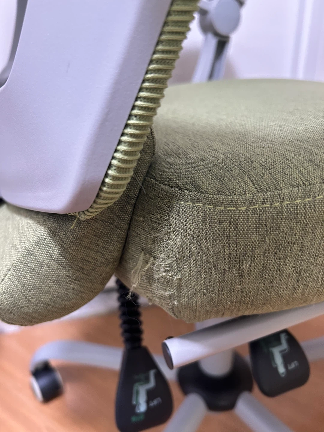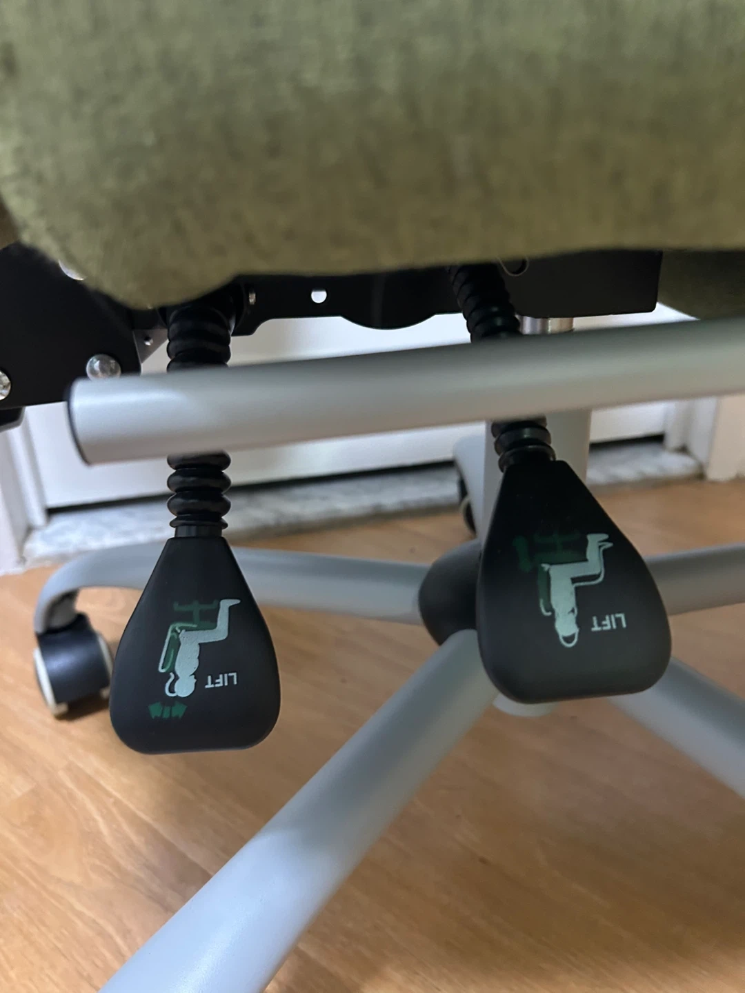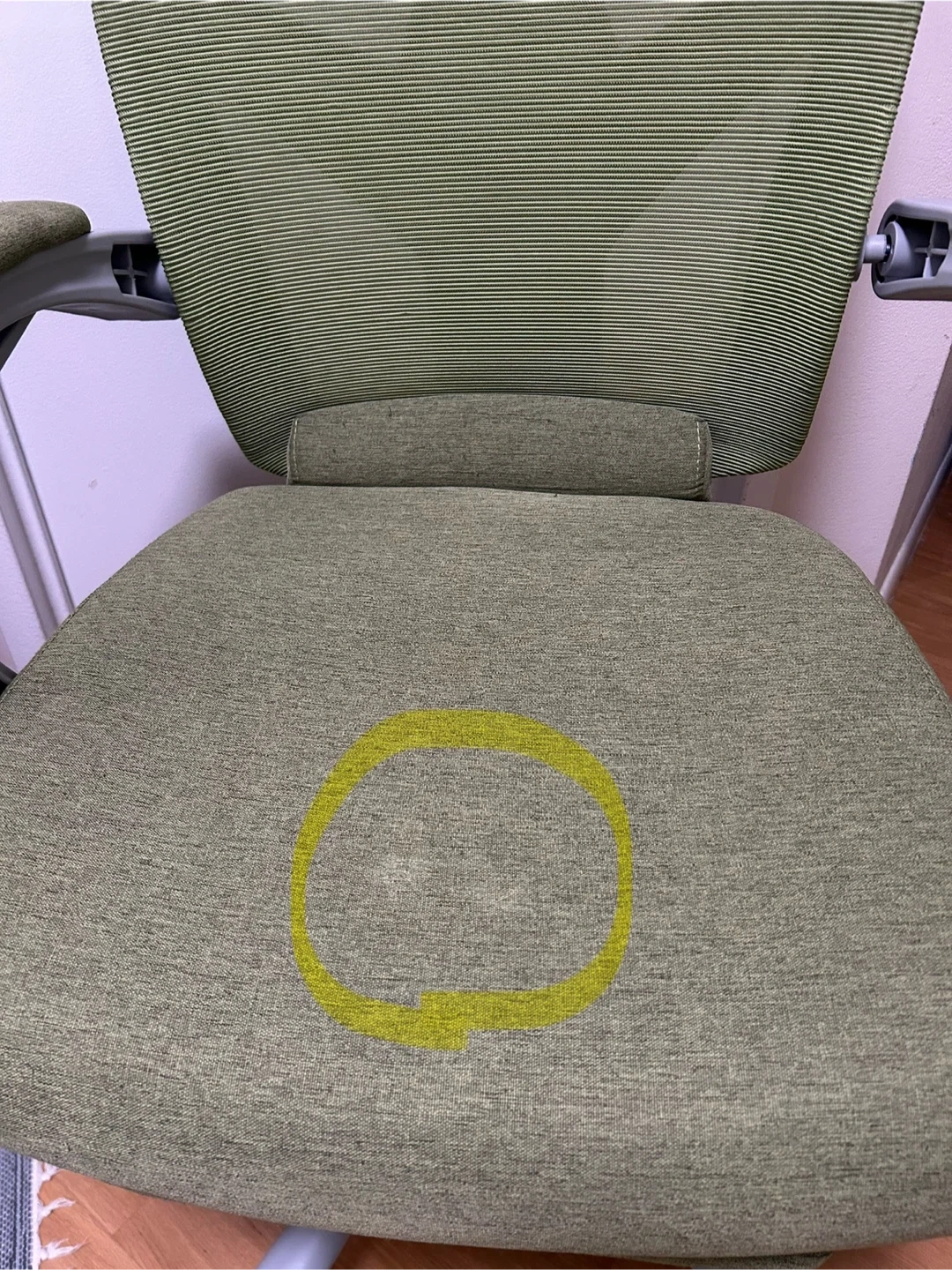 This is a green ergonomic office chair with retractable foot rest. It has a headrest and adjustable armrests. There is some wear on the seat and a small stain (both pictured). These retail new for $90.