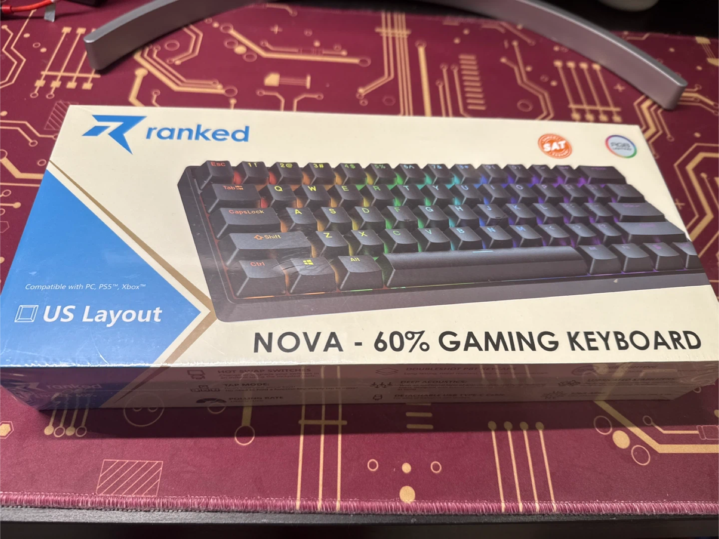 Selling a brand new Ranked Nova 60% Gaming Keyboard - US Layout! It's compatible with PC, PS5, and Xbox. It features hot swap switches, doubleshot PBT keycaps, deep acoustics, and RGB lighting. It also comes with a detachable USB Type-C cable for easy transport and storage