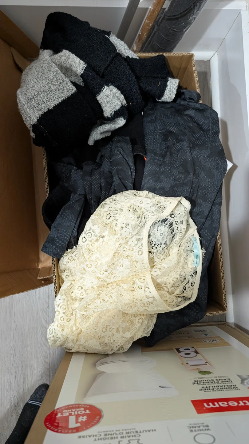 Selling a mixed lot of clothing items. Includes a variety of pieces, such as a black and gray striped knit item and a cream-coloured lace top. Great for someone looking to expand their wardrobe with different styles