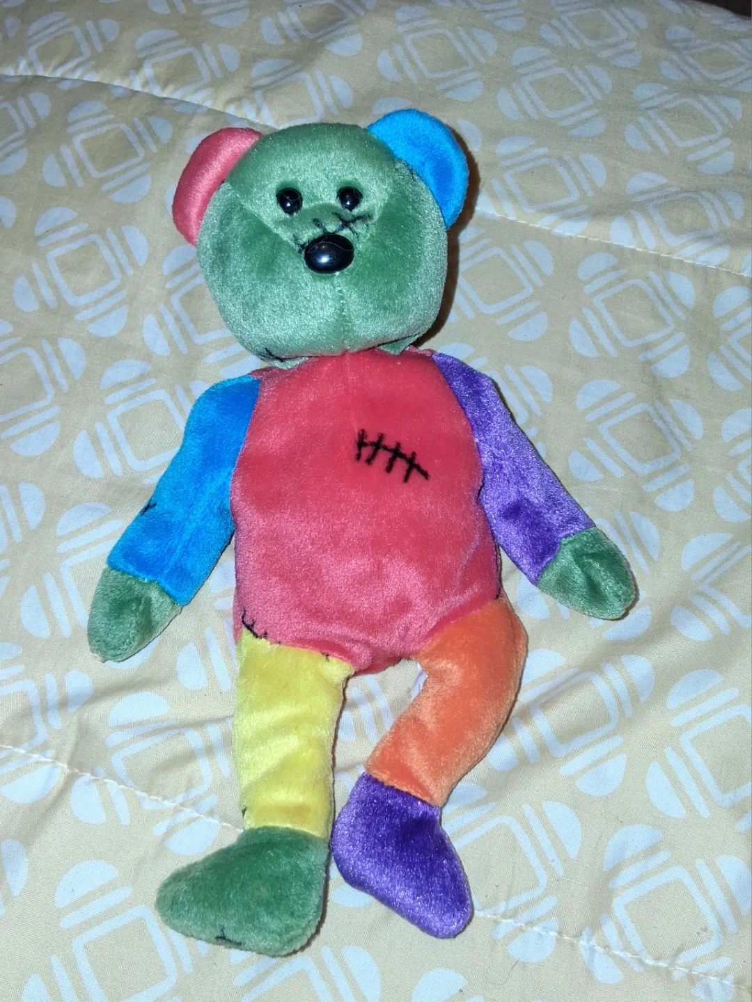 Here's a cute Beanie baby, Frankenteddy teddy bear! It's in great condition and ready for a new home. The bear features a patchwork design with various colours on its head, body, arms and legs. It would be a great addition to any child's toy collection.