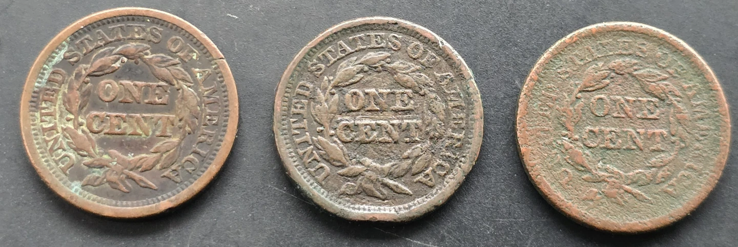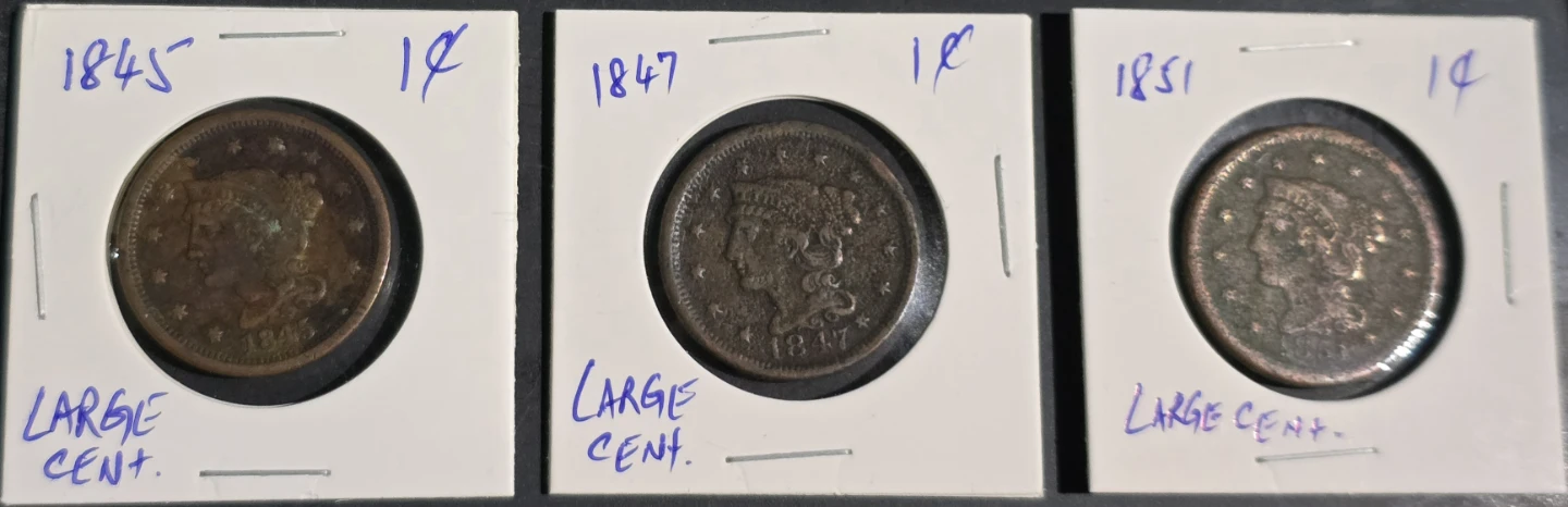 Selling three large cent coins from 1845, 1847 and 1851. They show their age, but are still interesting pieces of history!