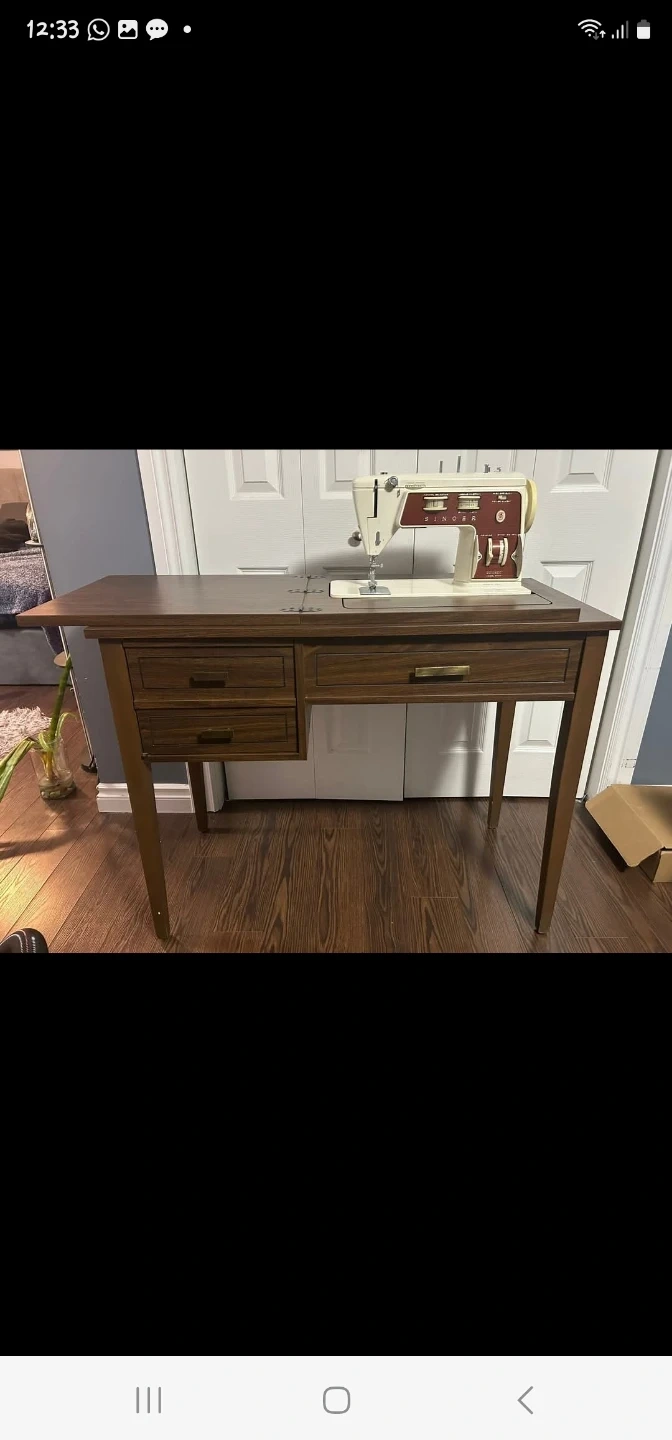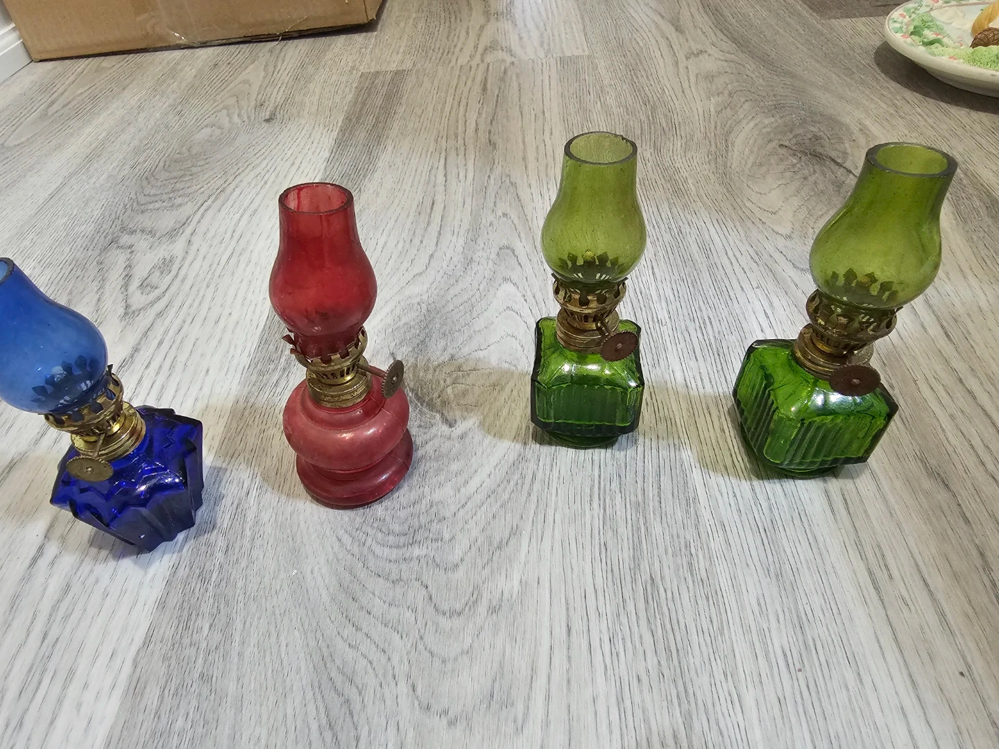 Selling a vintage sewing machine table and a set of four oil lamps. The table has a lovely wood finish with drawers for storage. The oil lamps come in various colours: blue, red, and green. They'd make a charming addition to any room!