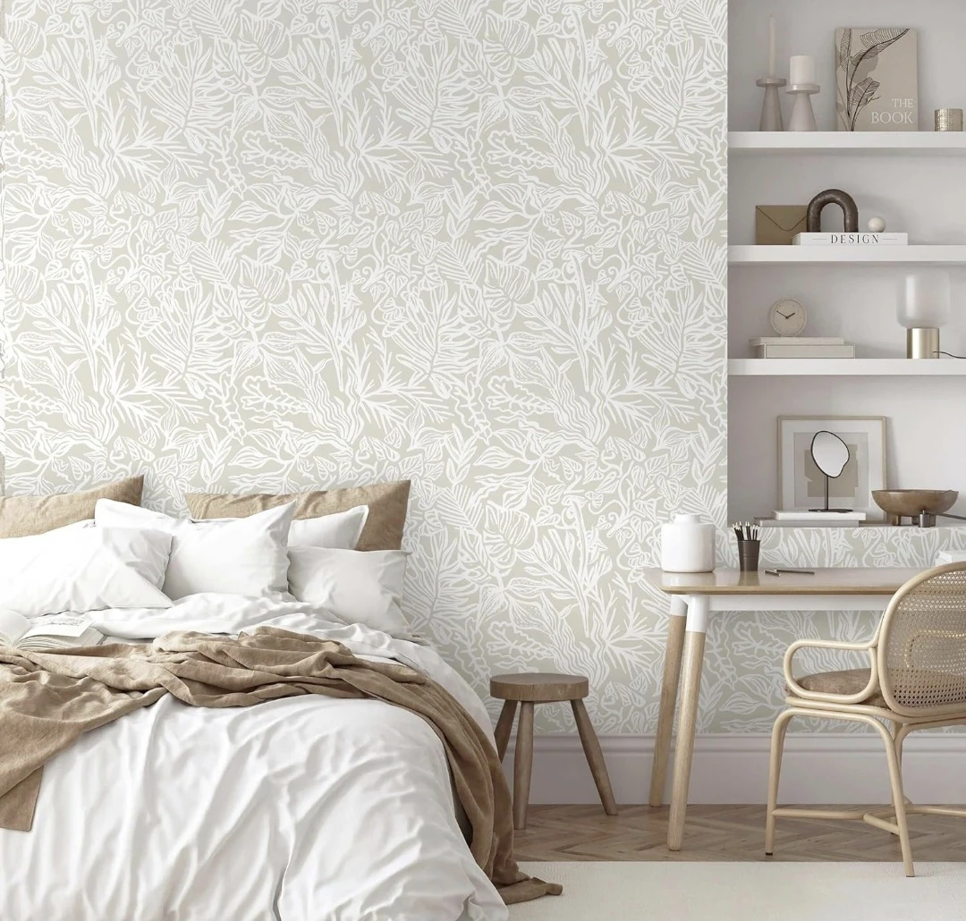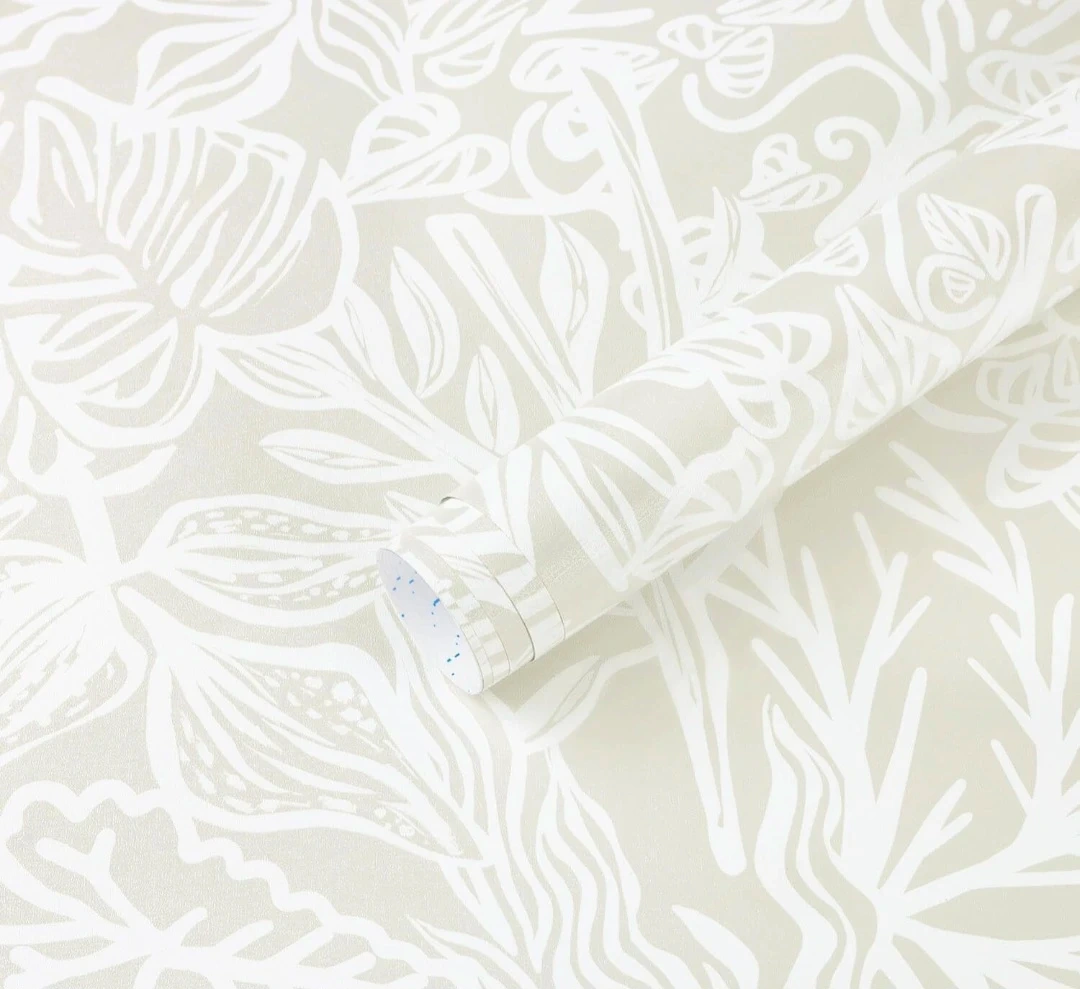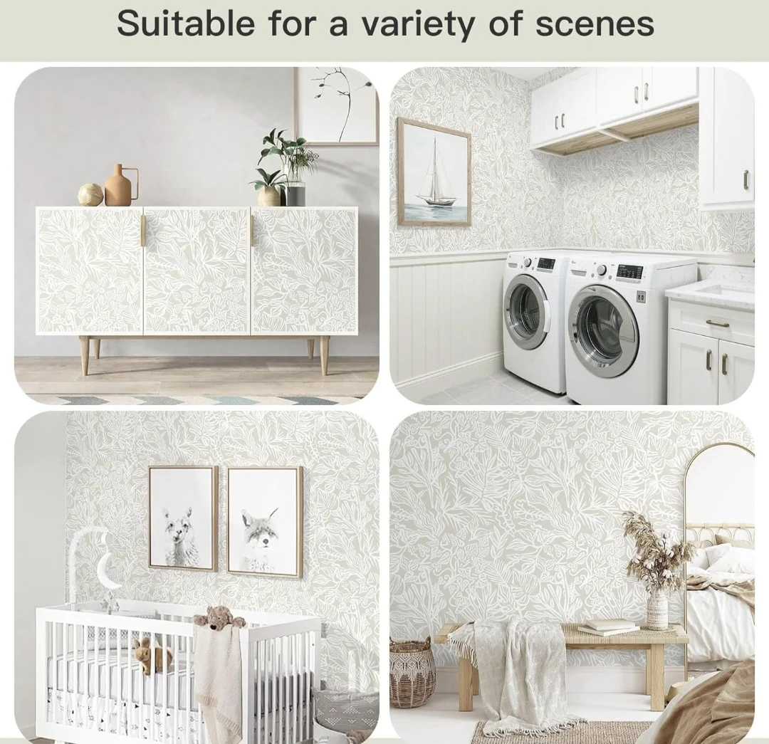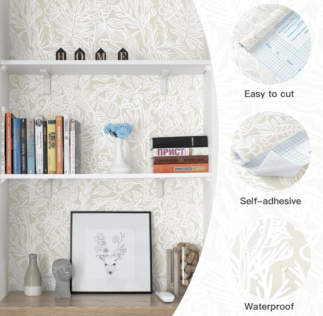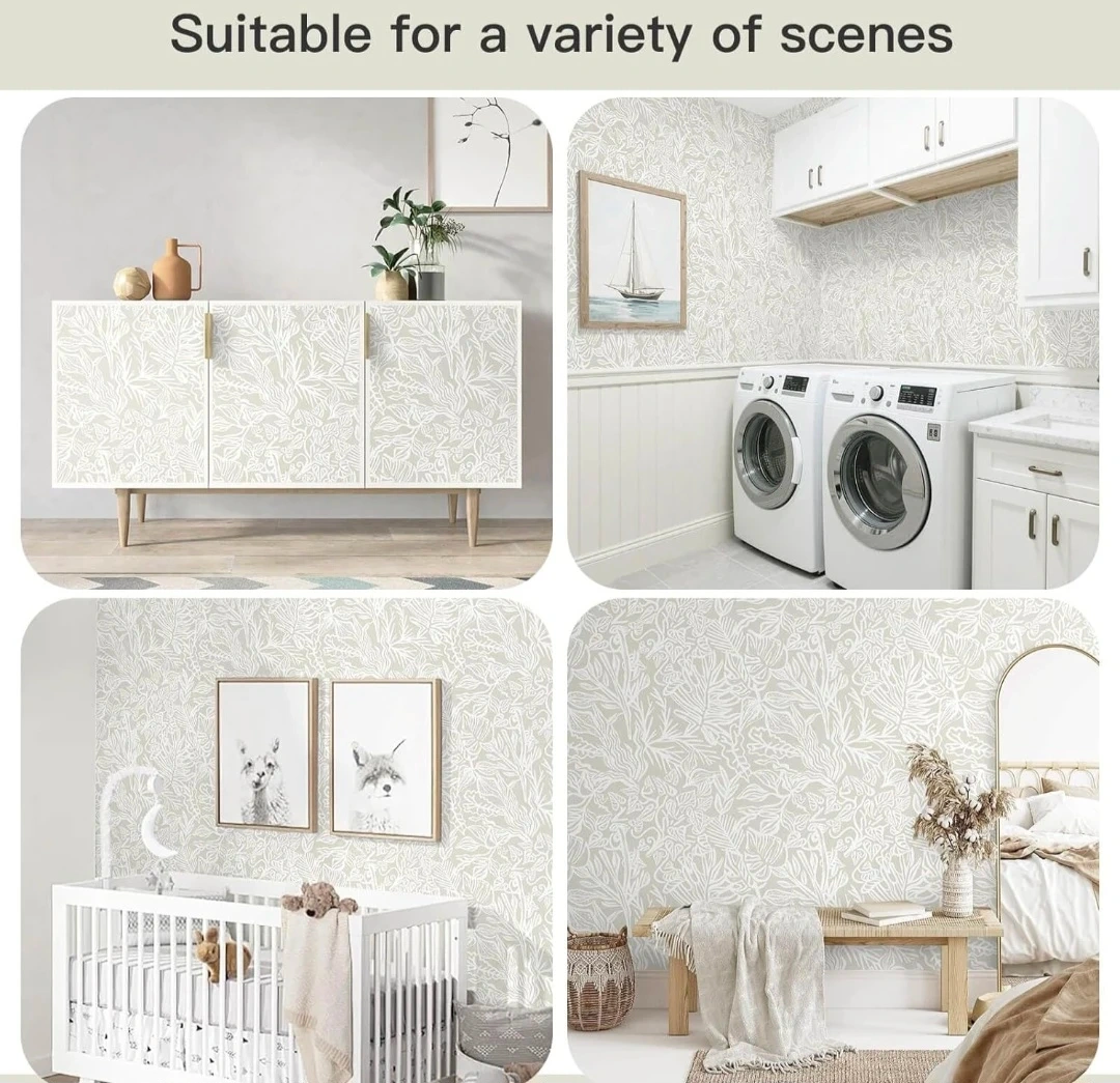 2 rolls of Floral Beige/White Leaf Peel & Stick Wallpaper. New. Each roll is 17.3"x78.7". It's self-adhesive, waterproof, and easy to cut. It's suitable for a variety of scenes!