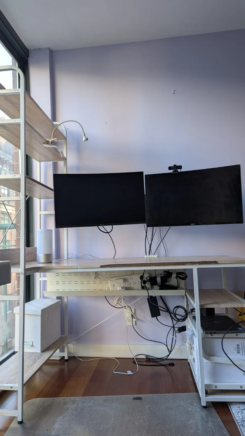 Selling a desk with attached shelving. It's perfect for a home office or study space. The desk provides ample workspace, and the shelves offer plenty of storage for books, supplies, and decor. It is in good condition and ready for a new home.
