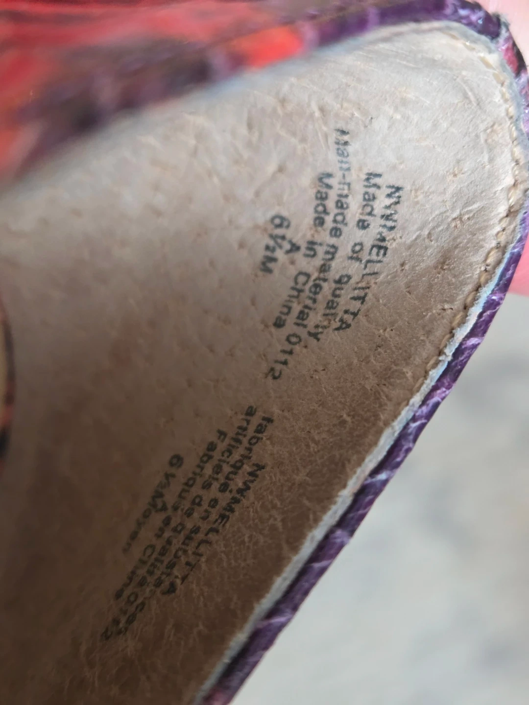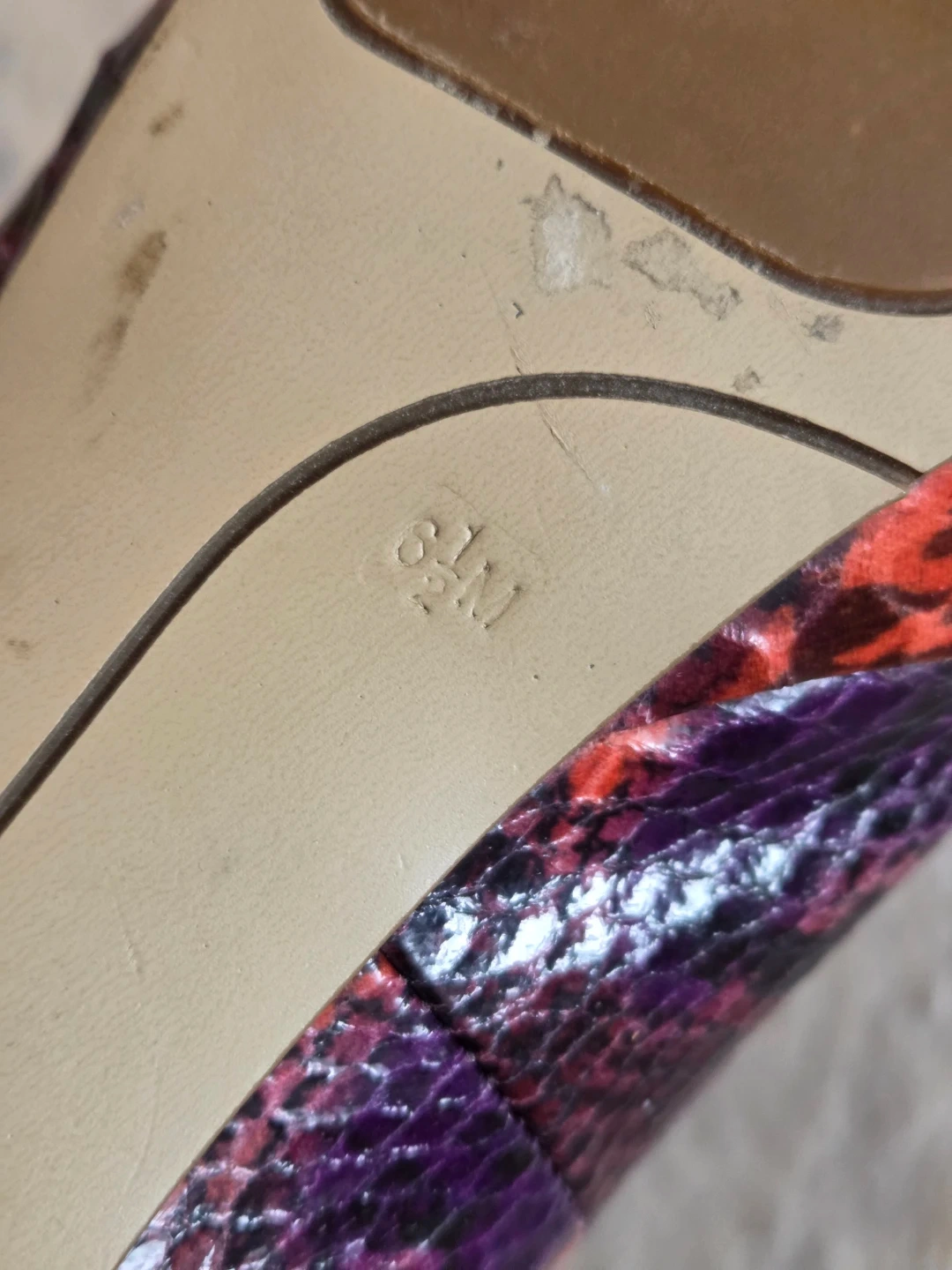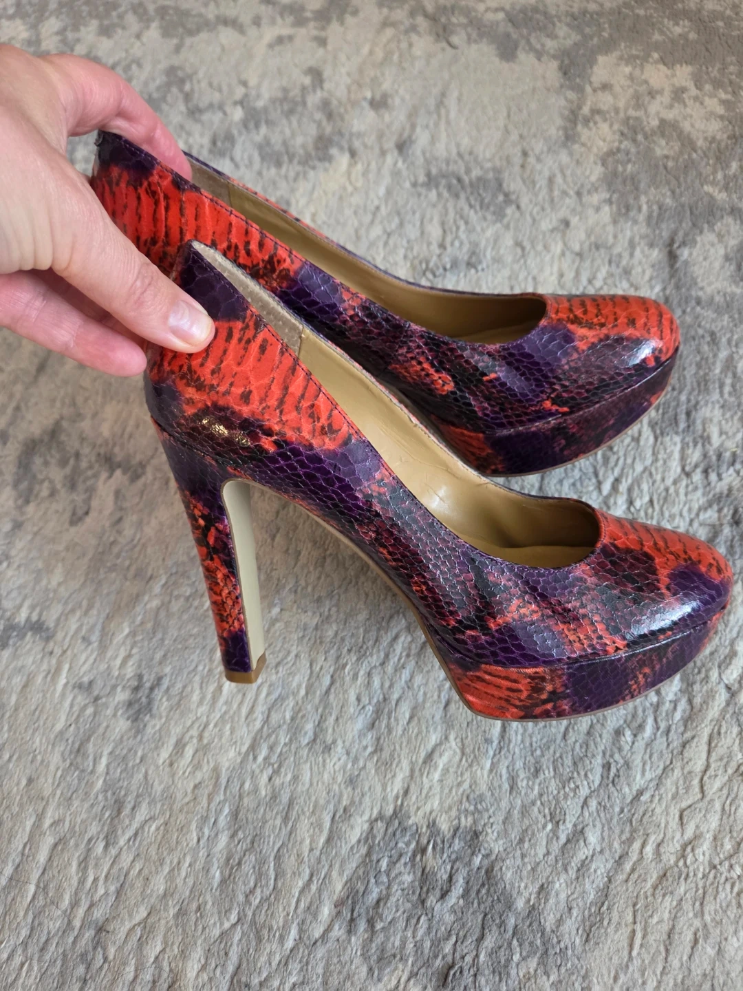 Selling a pair of Nine West NWMELLITTA heels in size 6.5M. They have a cool snakeskin-like pattern with shades of red and purple. Perfect for adding a pop of colour to your outfit!