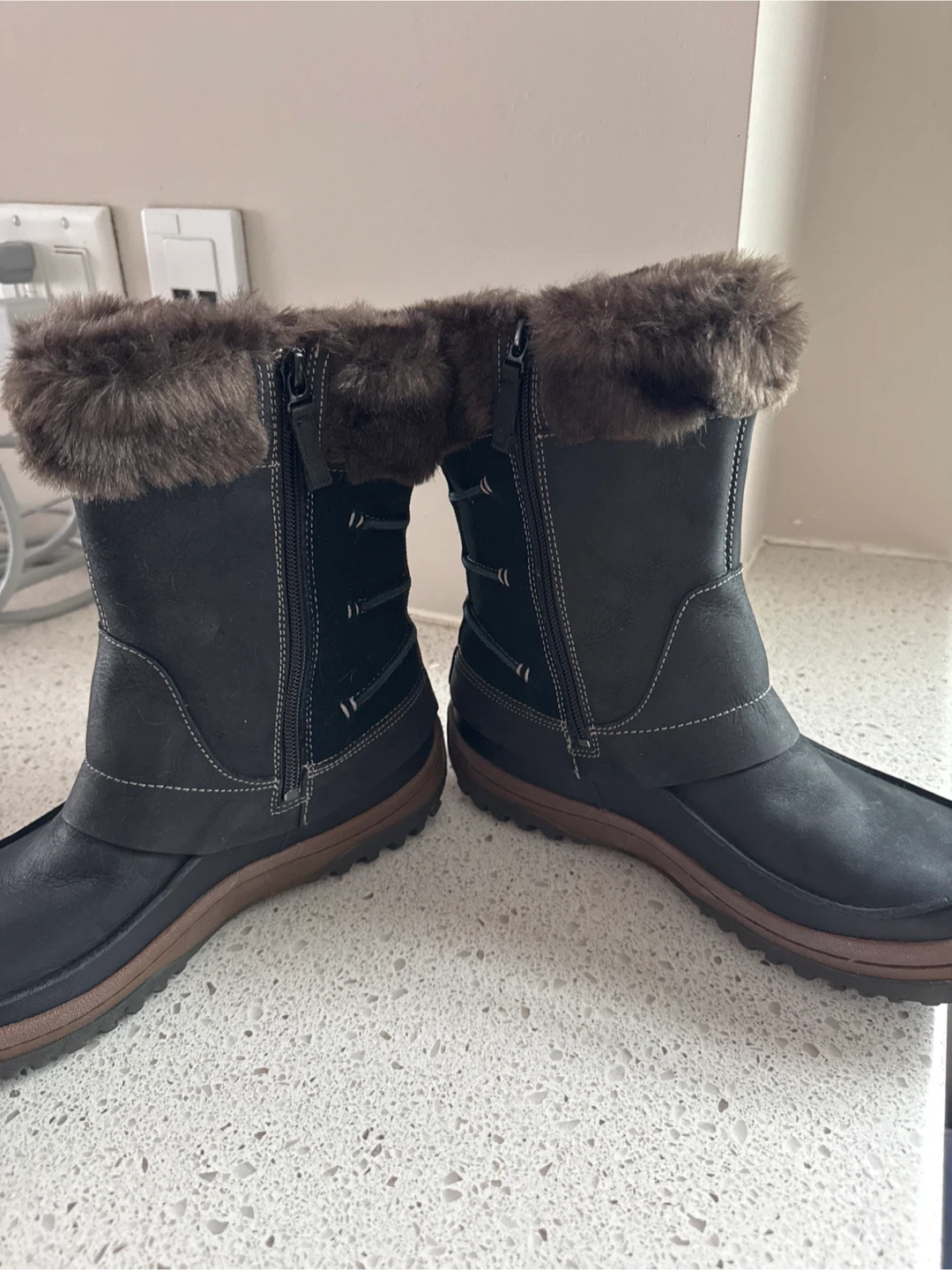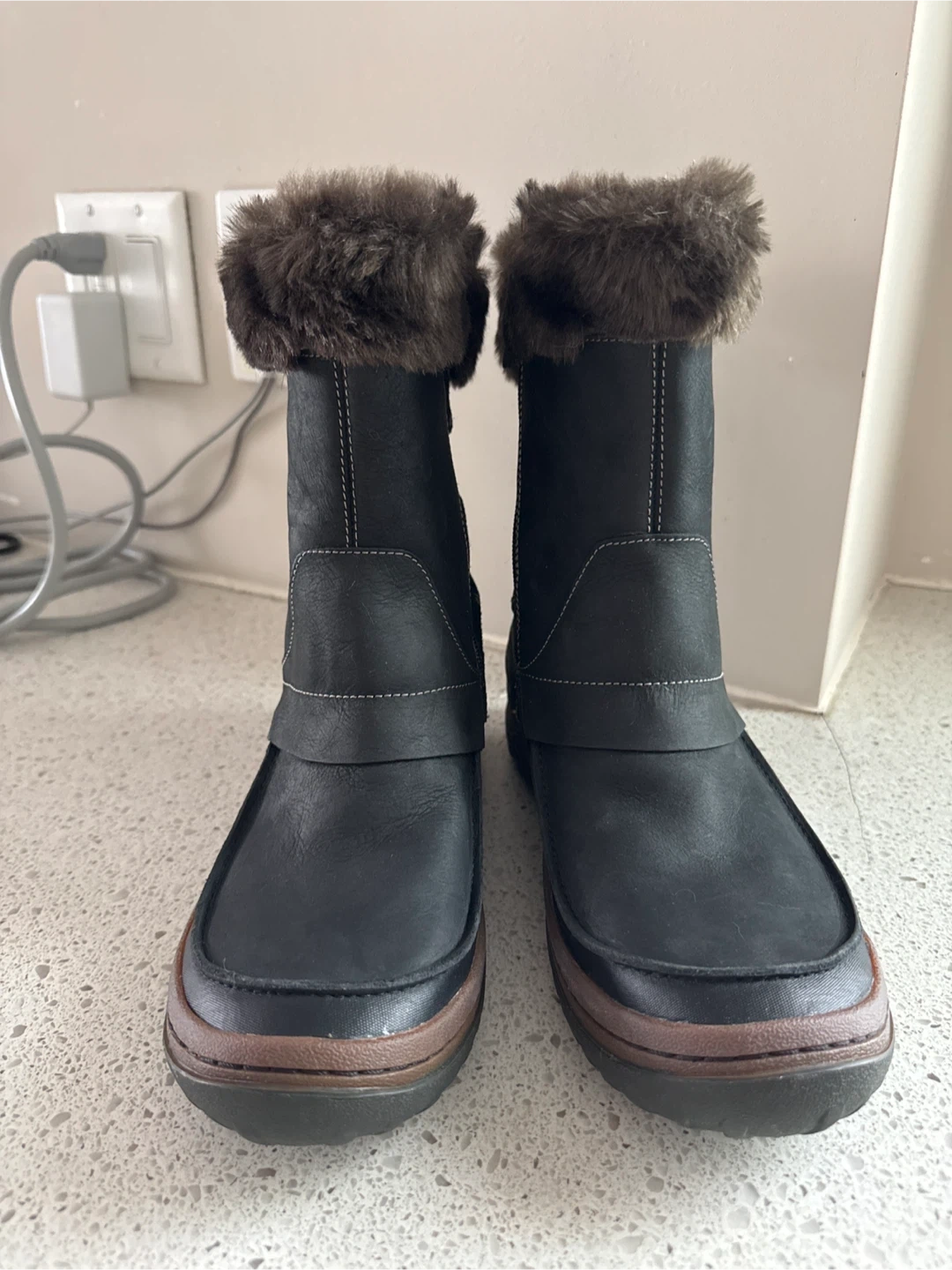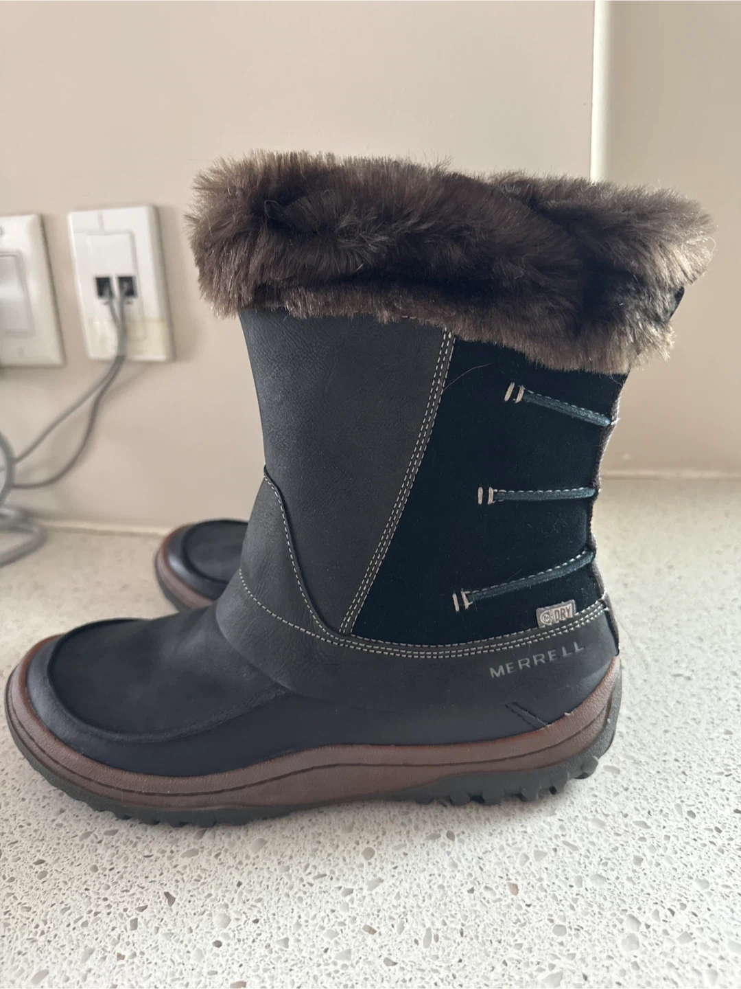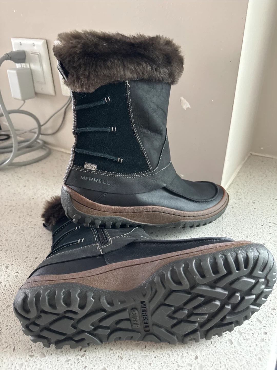 Cozy and stylish Merrell winter boots, perfect for the Canadian weather! These boots are black and feature a faux fur trim. They're in great condition and ready for snowy adventures
