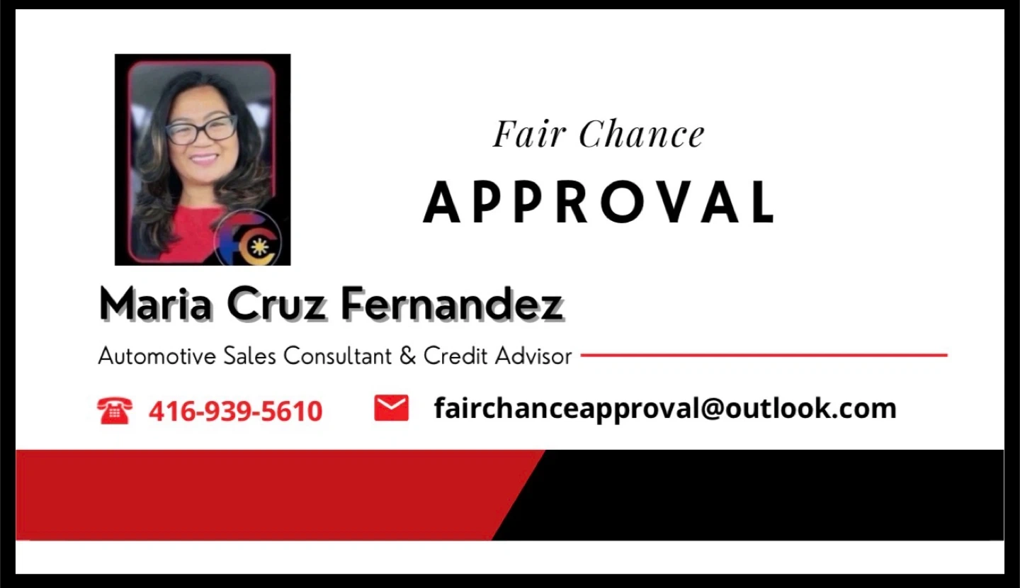 Looking for an automotive sales consultant and credit advisor? Maria Cruz Fernandez from Fair Chance Approval can help! Contact her at 416-939-5610 or via email at fairchanceapproval@outlook.com