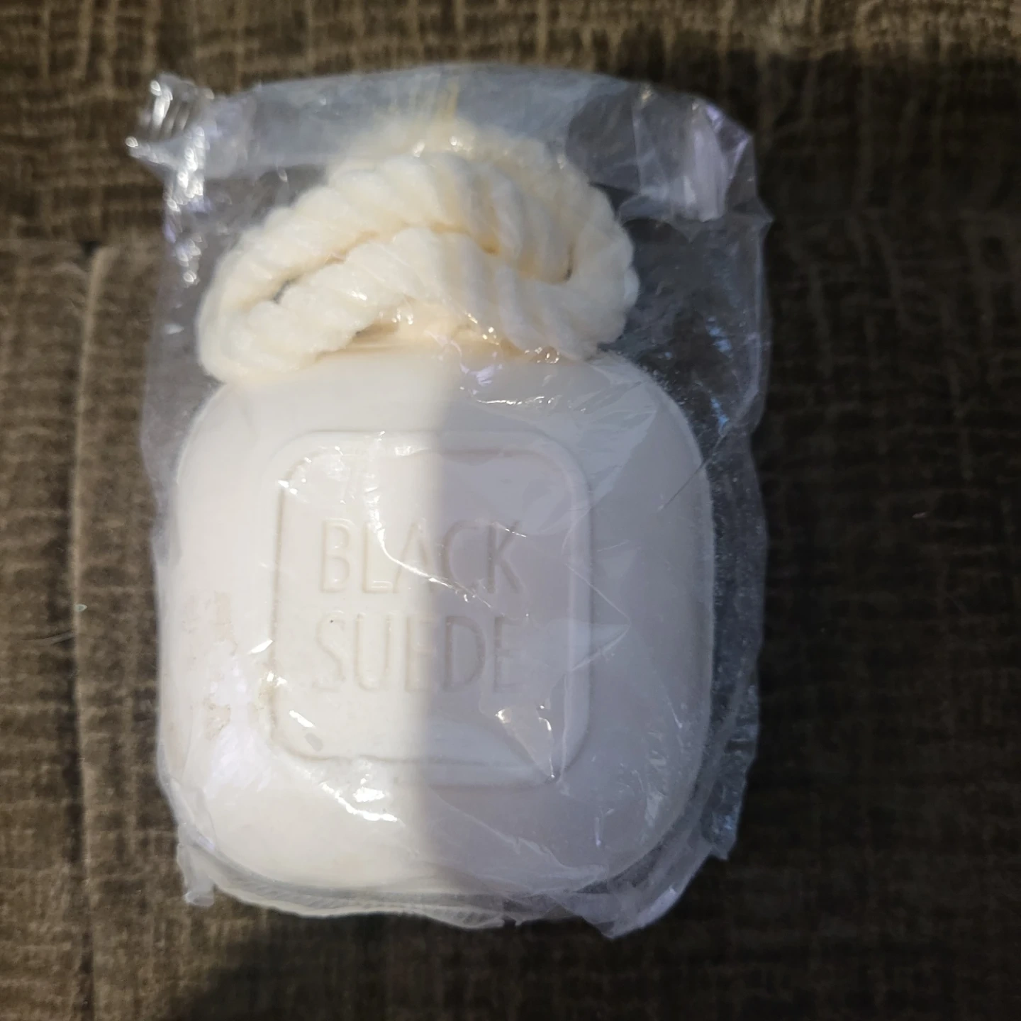 I'm selling a new Avon Black Suede Soap On A Rope. It's still in its original packaging and ready to use. This soap has a rope attached, making it easy to hang in your shower or bath. It's a great addition to your grooming routine!