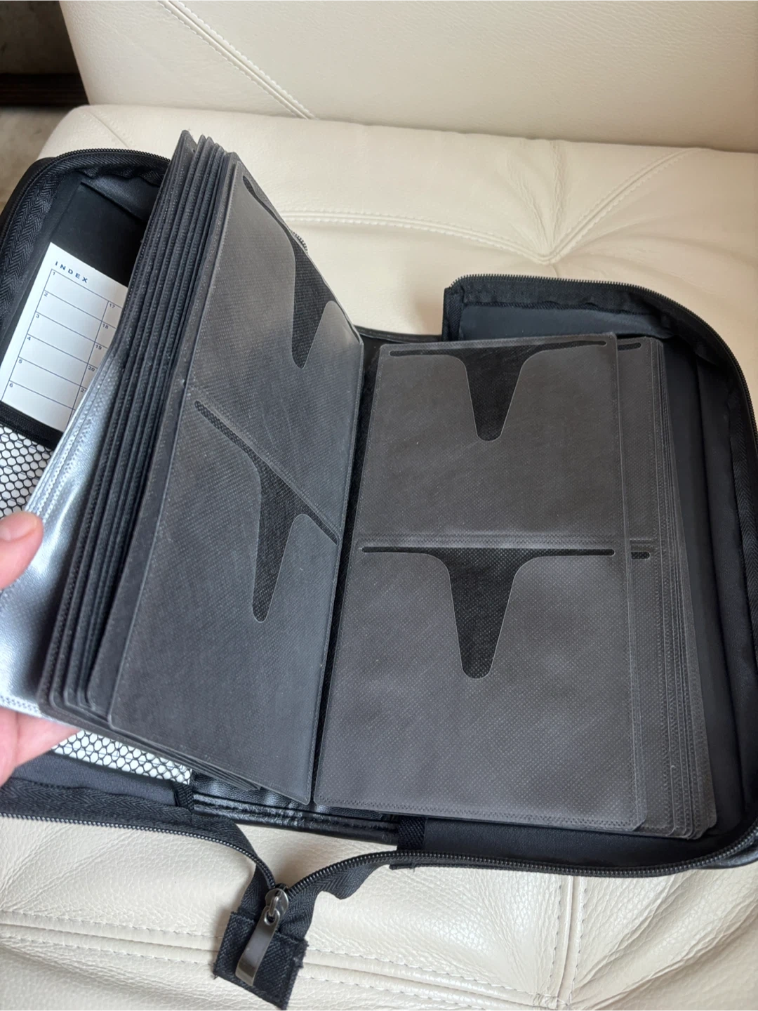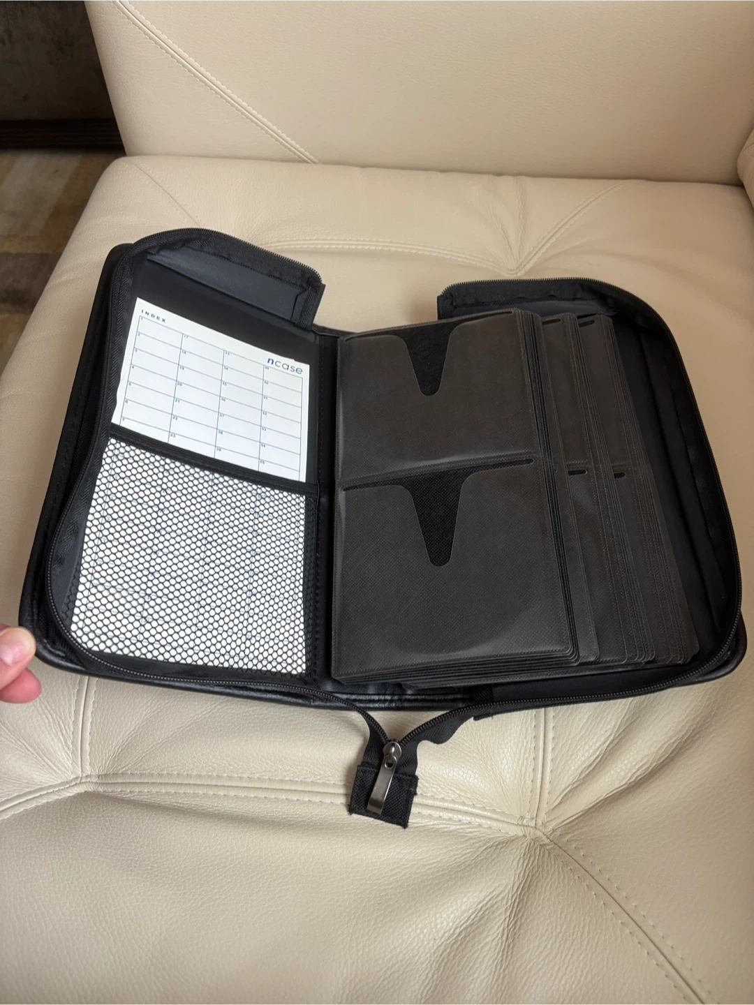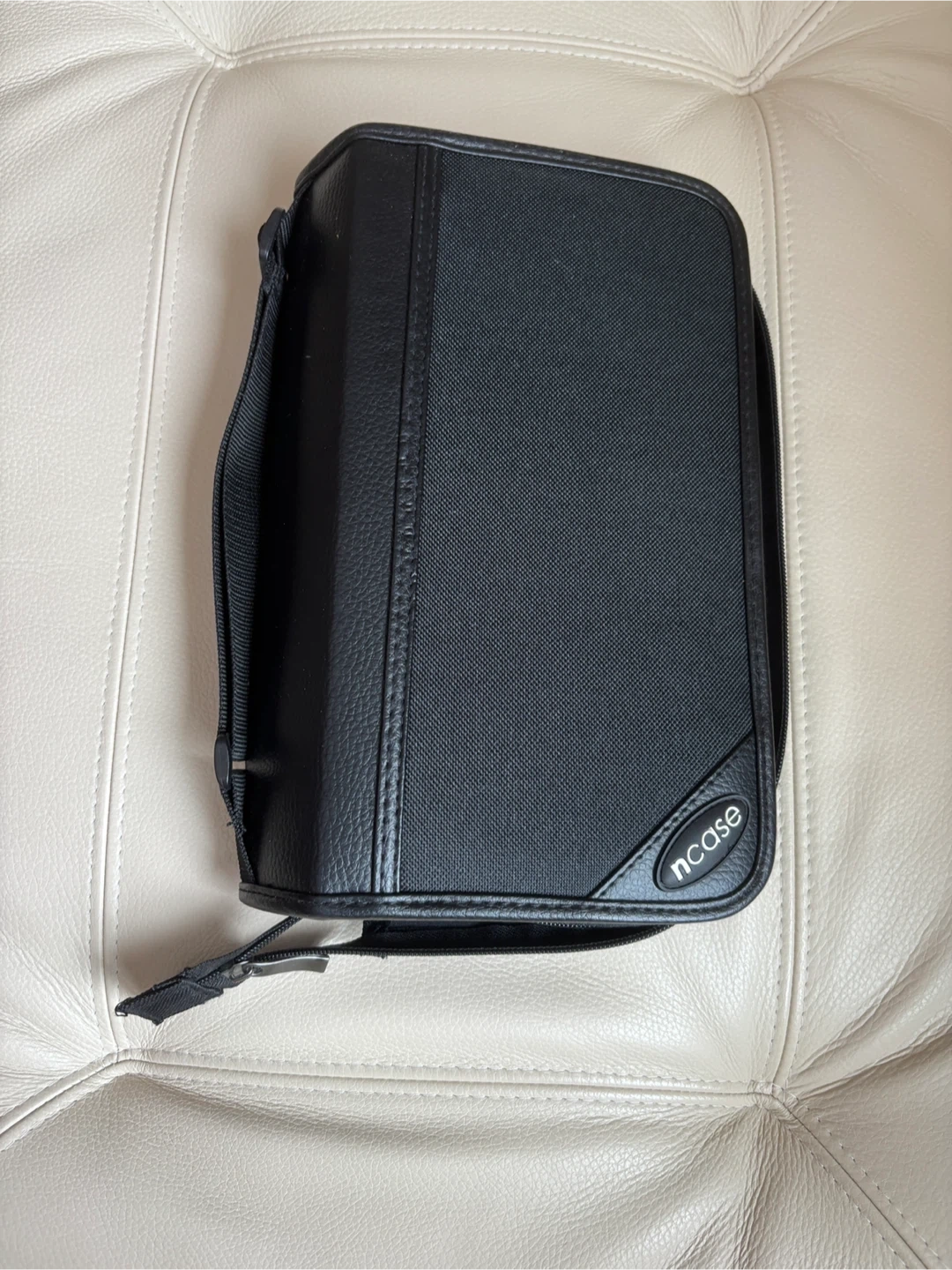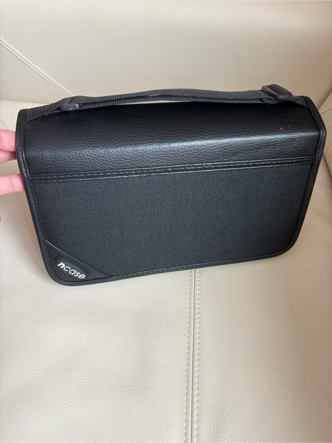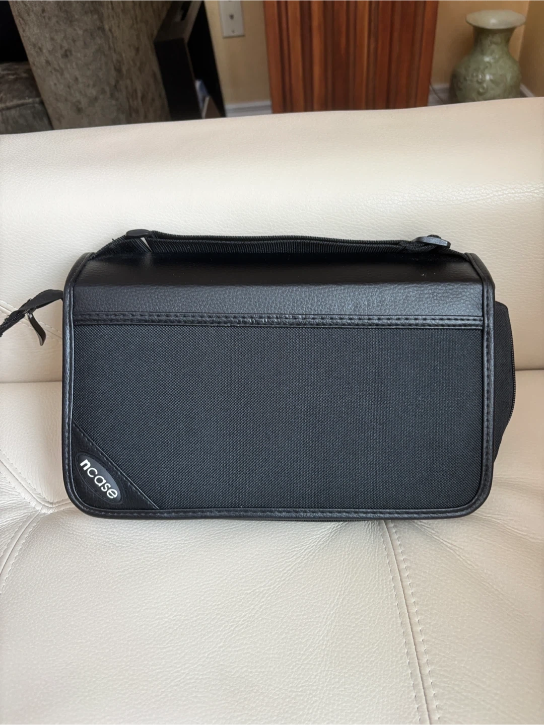 Selling a like new Ncase brand CD/DVD case in black. It's in new condition and ready to store your collection for up to 128 cds. Convenient carrying strap and 2 index cards included. It measures 11 1/2 x 8 1/2 inches.