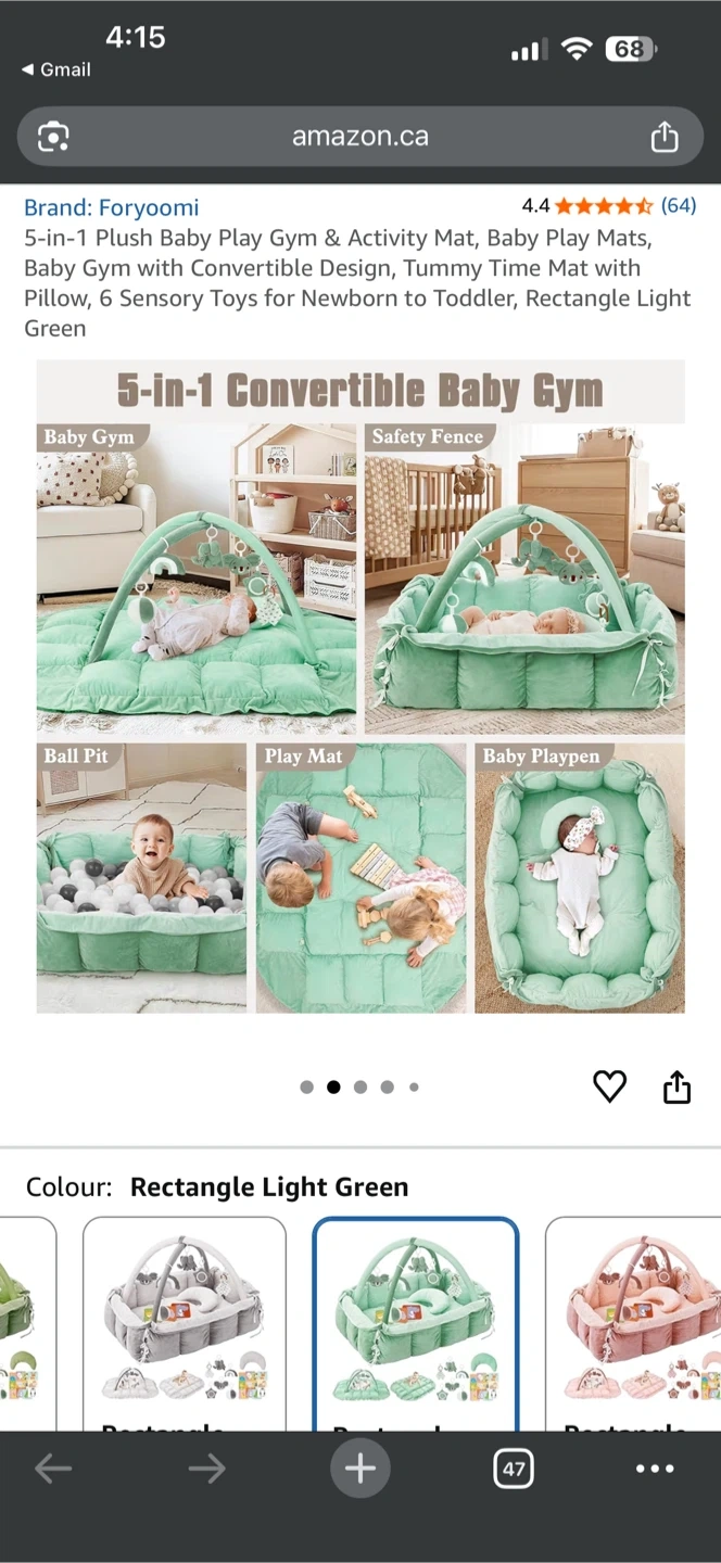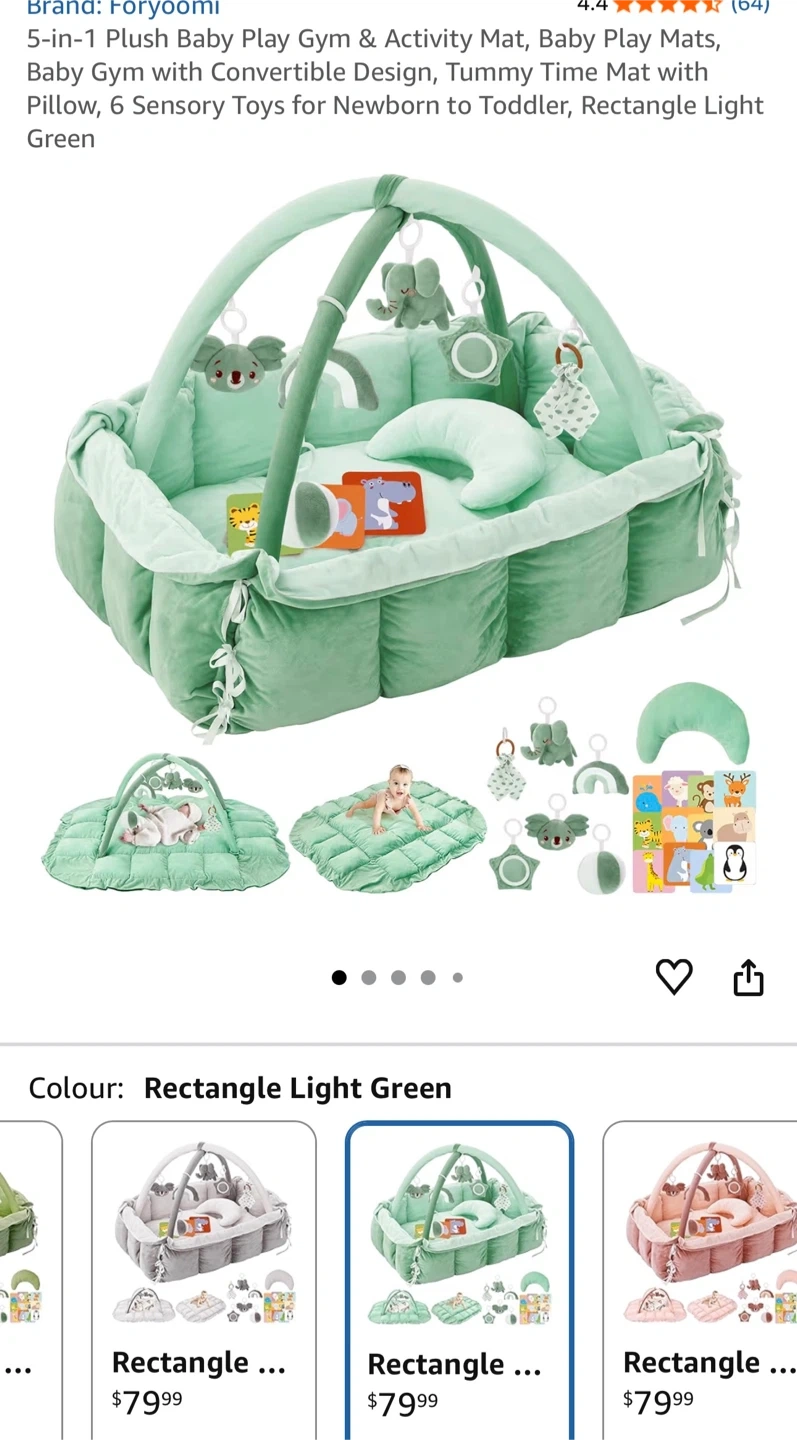 Check out this Foryoomi 5-in-1 Plush Baby Play Gym & Activity Mat! It can be used as a baby gym, play mat, or even a baby playpen. It comes with 6 sensory toys for newborns to toddlers and includes a tummy time pillow. The colour is rectangle light green