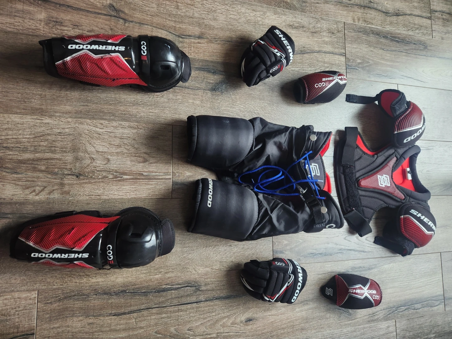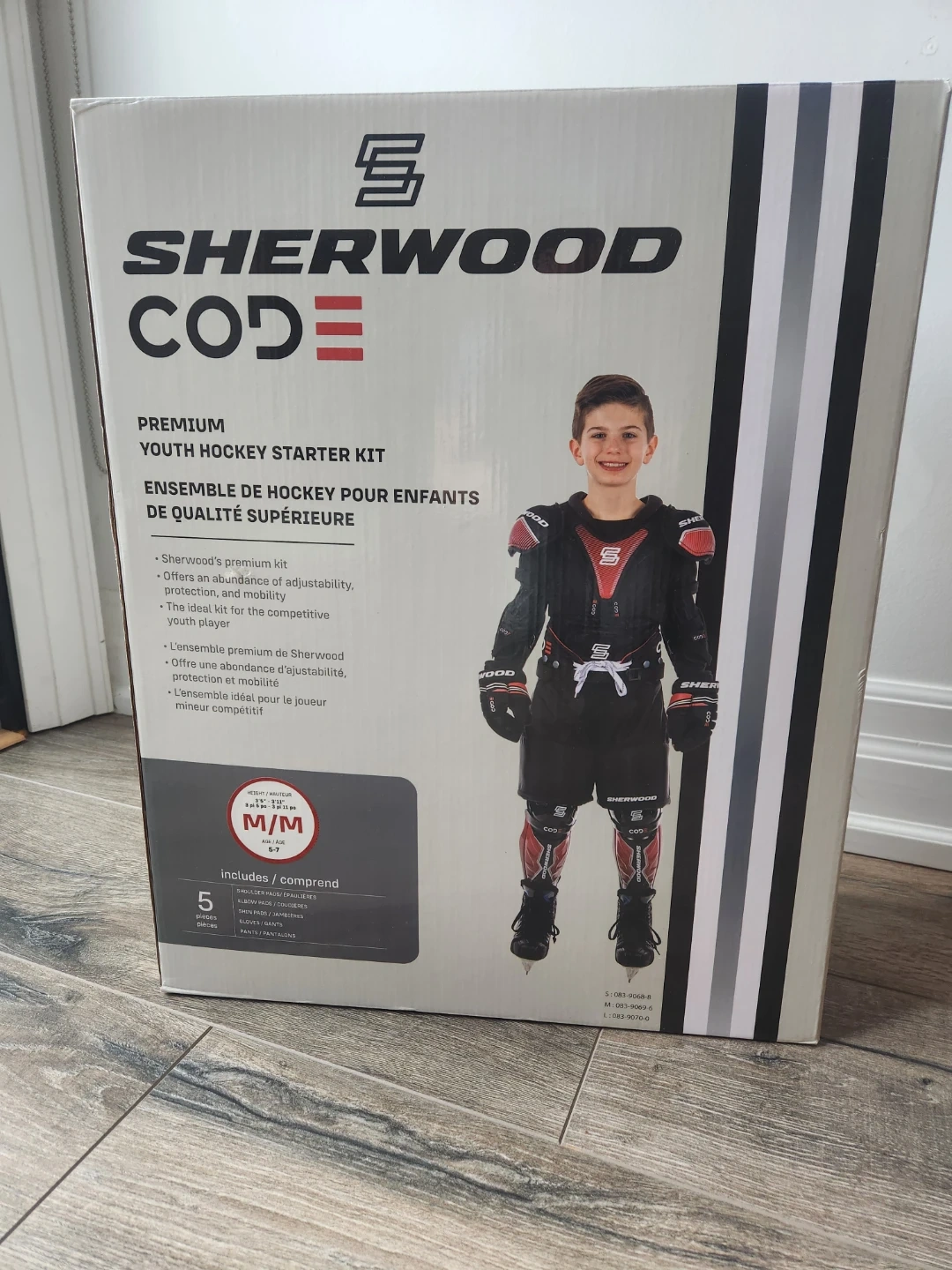 Selling a Sherwood Code Premium Youth Hockey Starter Kit in size M/M. This kit is designed for young hockey players and offers excellent adjustability, protection, and mobility. The kit includes 5 pieces: