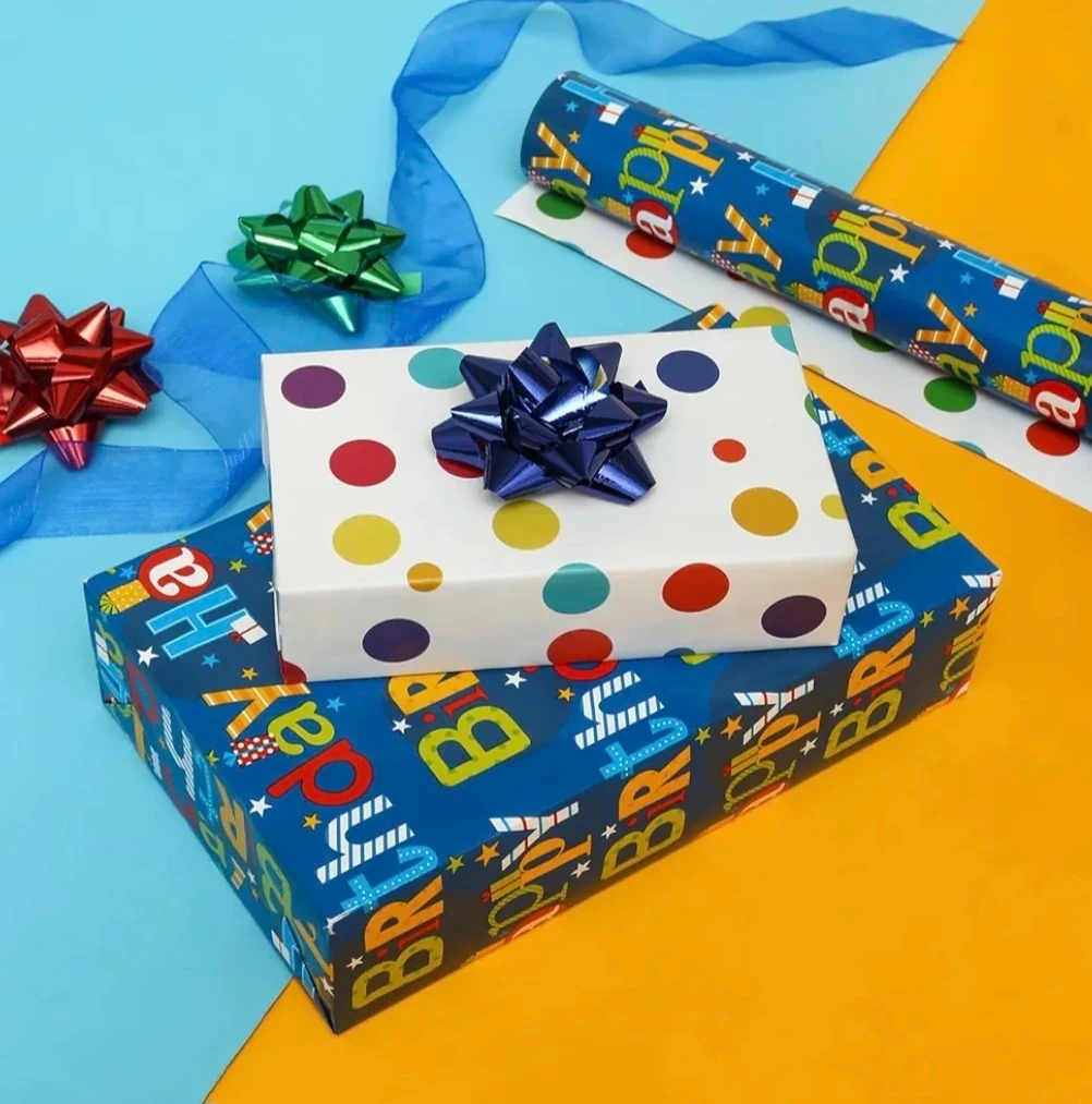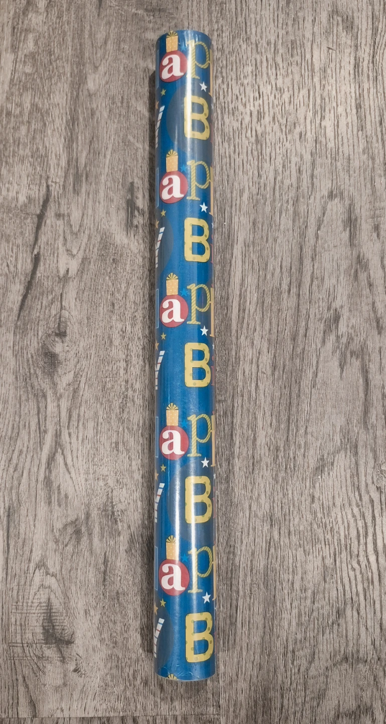 Reversible Happy Birthday Wrapping Paper Roll. Happy Birthday one side, Polka Dots Design on the other. New. Perfect for wrapping gifts for any birthday celebration. 17.7"×394"