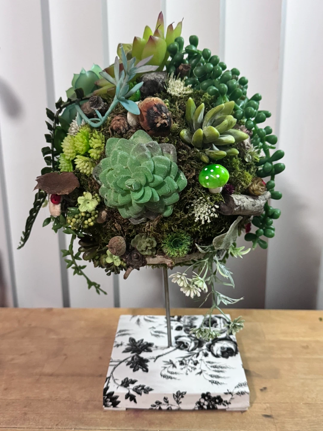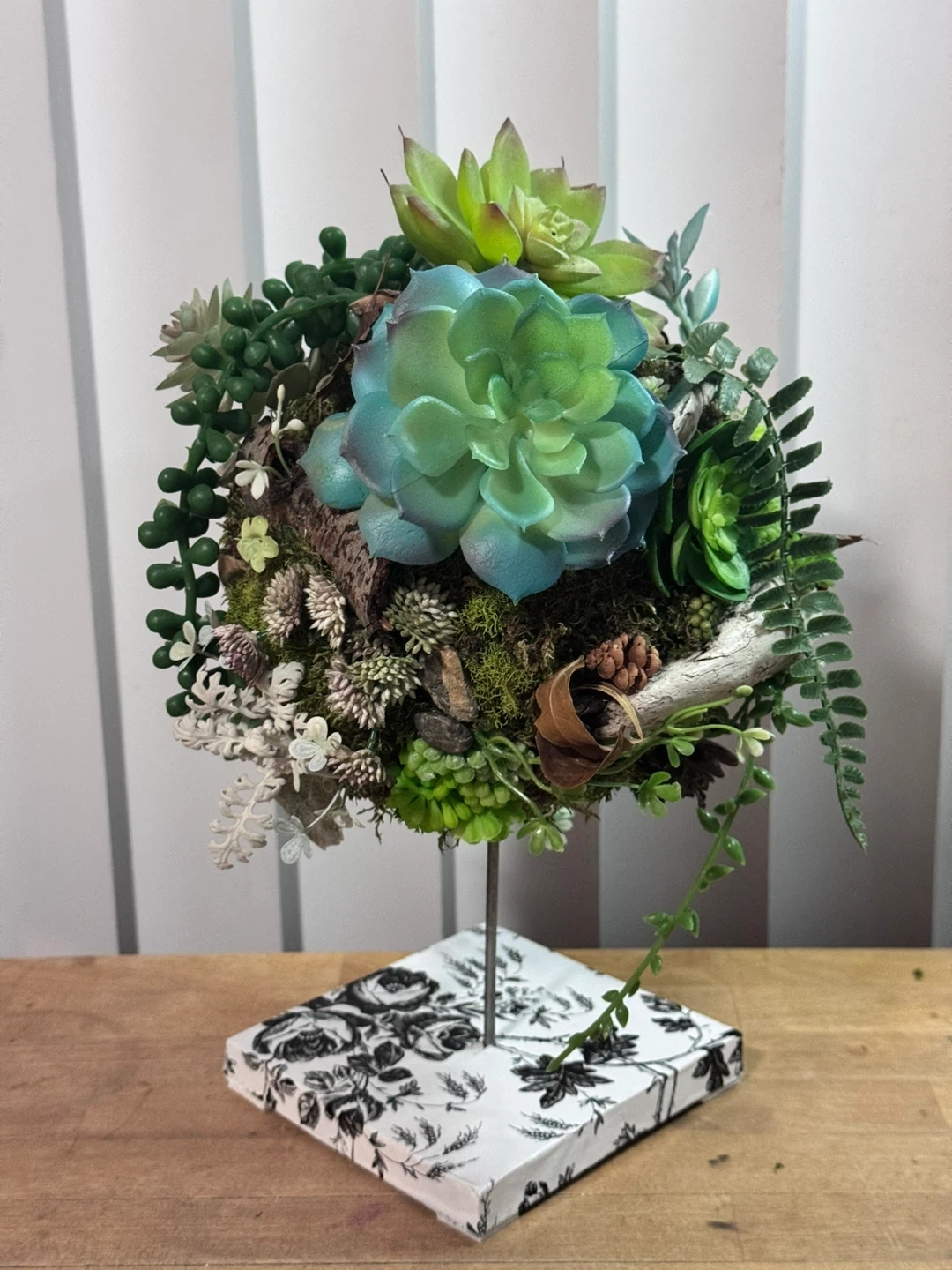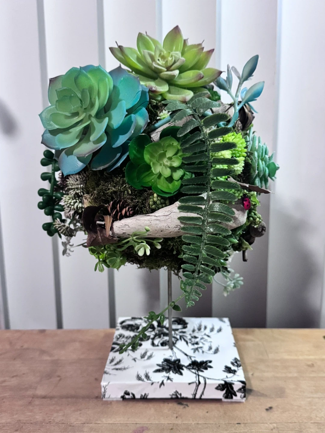 This is a beautiful faux succulent ball plant! It has a variety of different succulents and plants with natural elements like driftwood, stones and dried leaves that are arranged in a sphere. The base is a black and white floral pattern. It would be a great addition to any home or office!