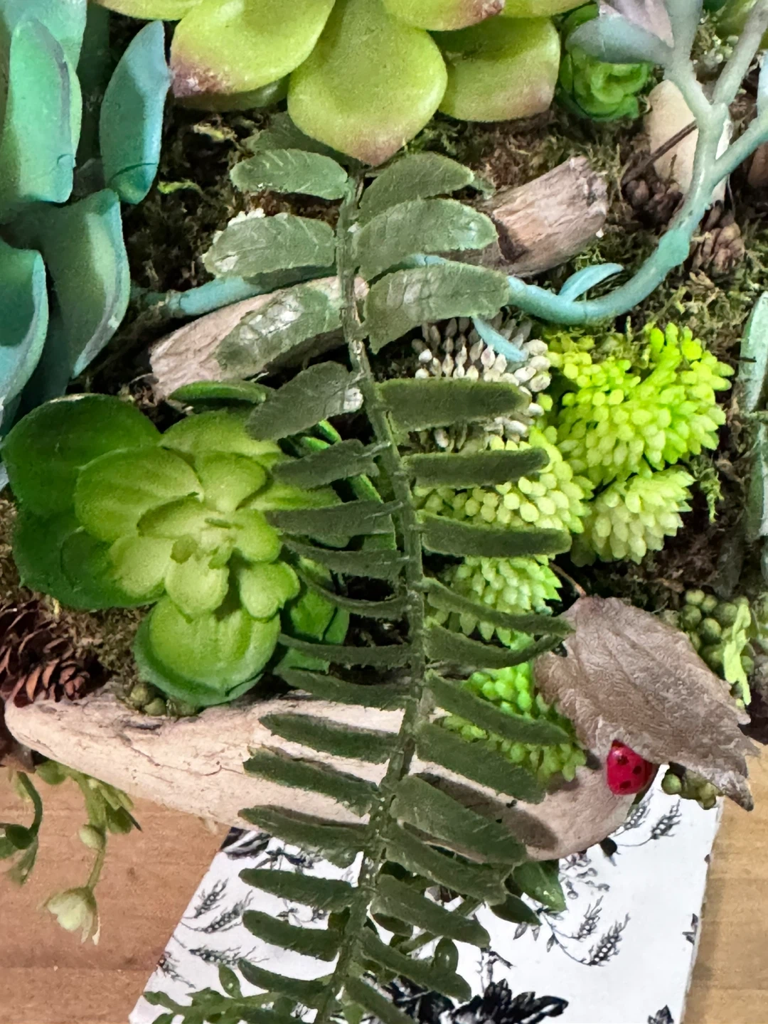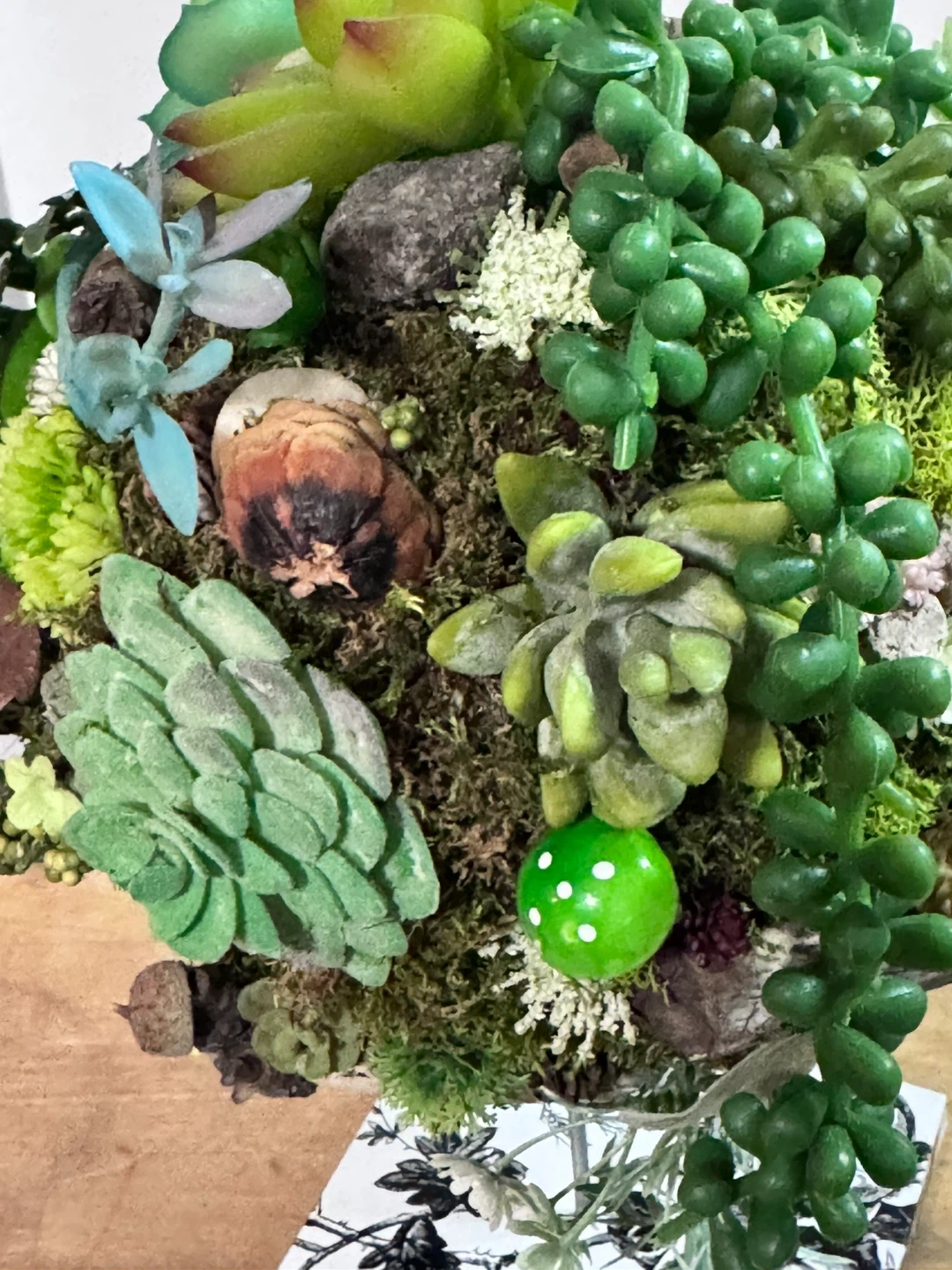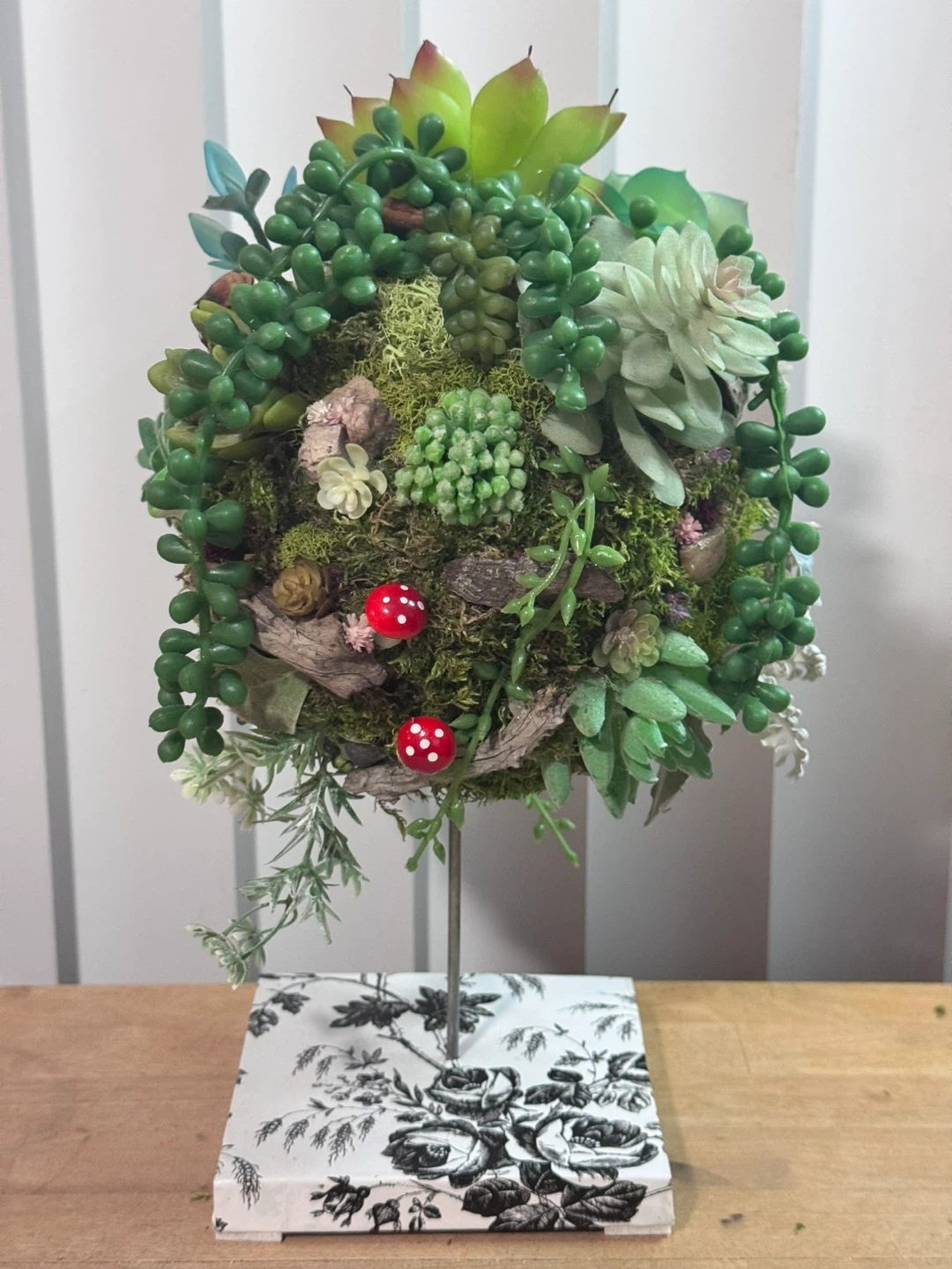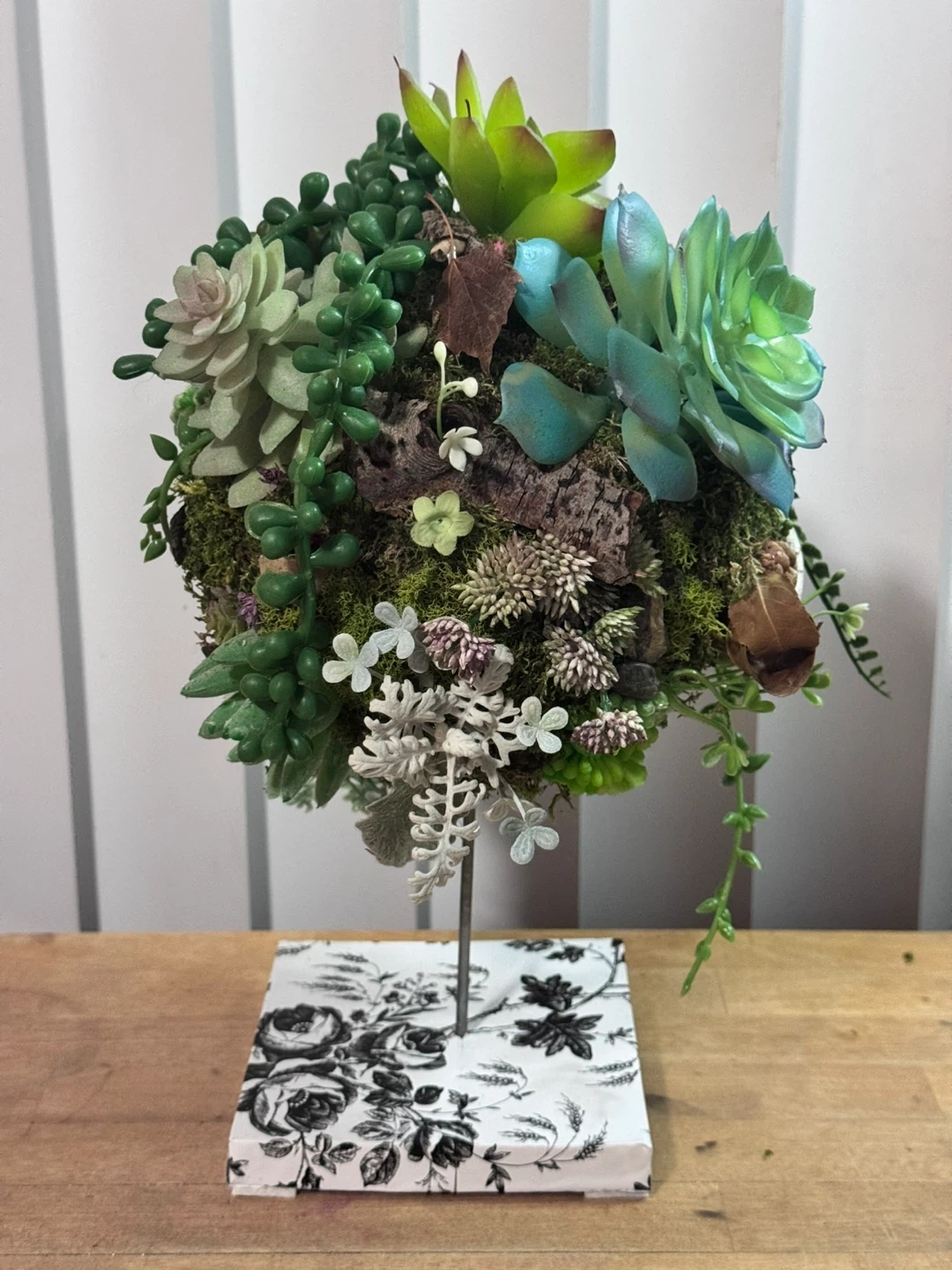 This is a beautiful faux succulent ball plant! It has a variety of different succulents and plants with natural elements like driftwood, stones and dried leaves that are arranged in a sphere. The base is a black and white floral pattern. It would be a great addition to any home or office!