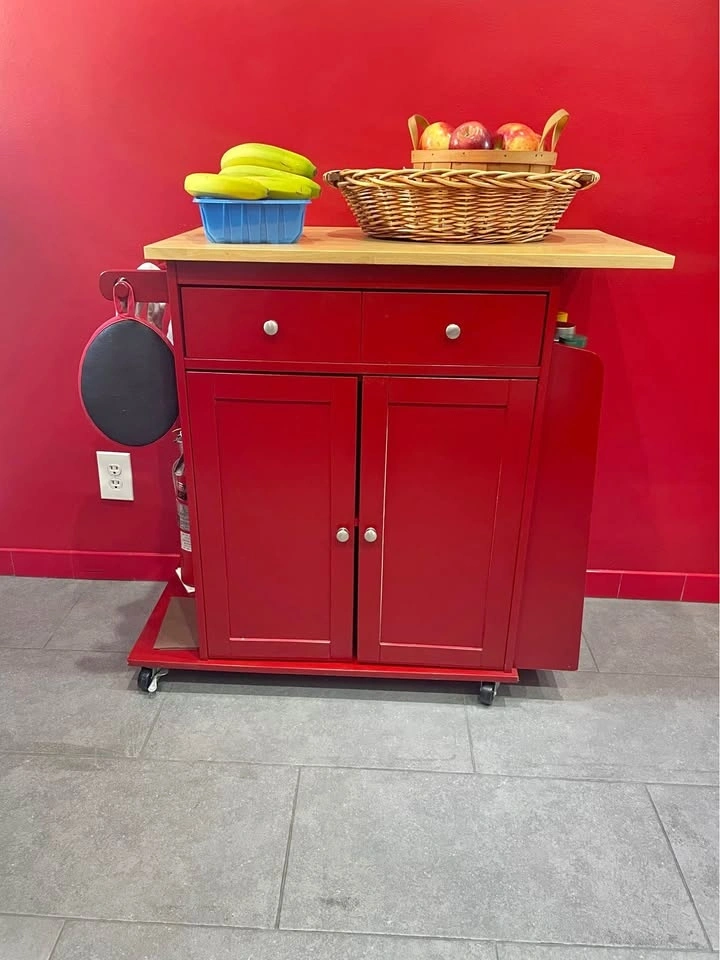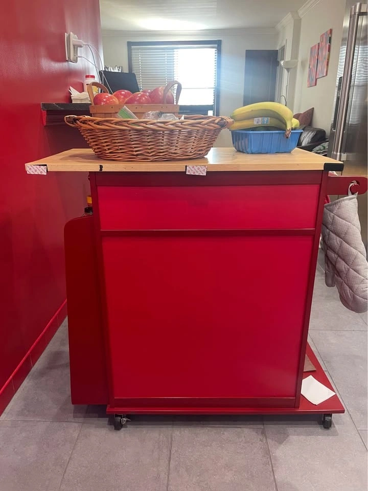 This rolling kitchen island with 4 wheels can be swiveled easily. Two wheels have a brake.