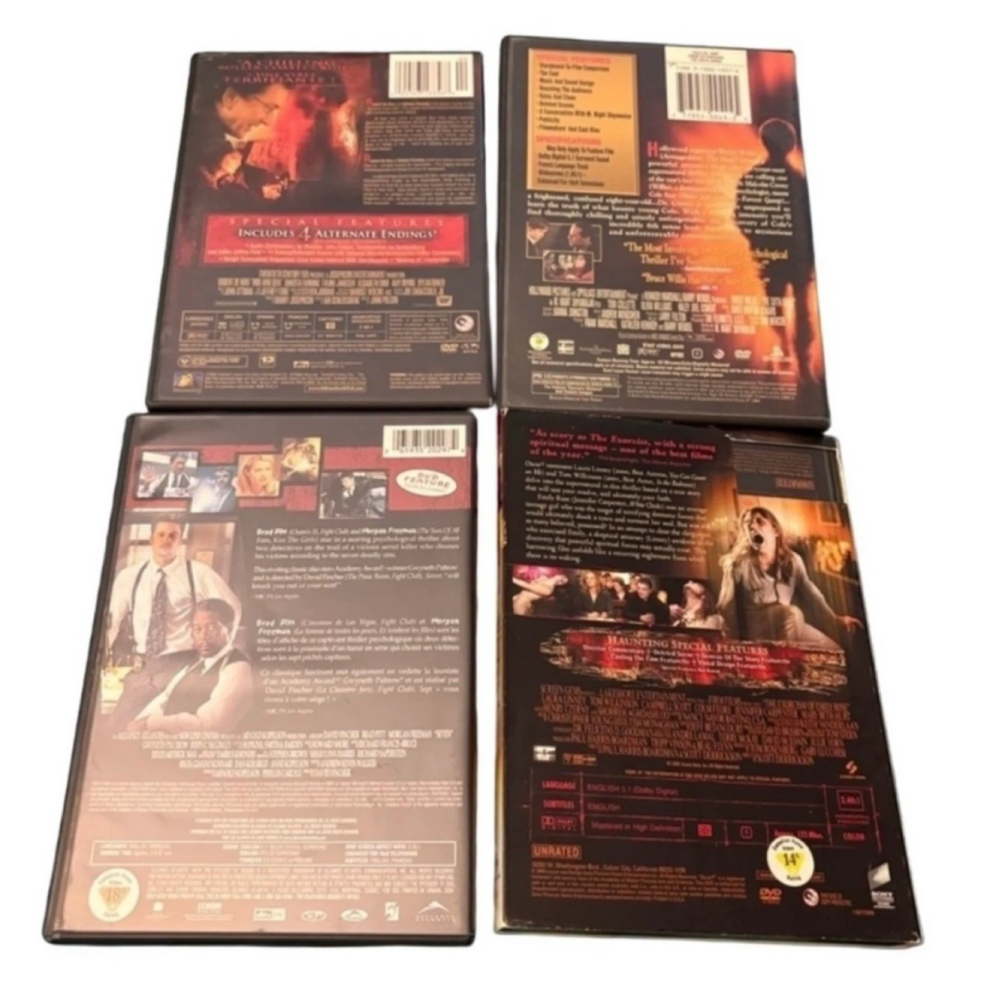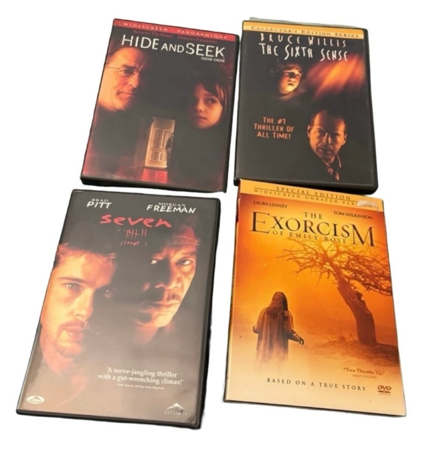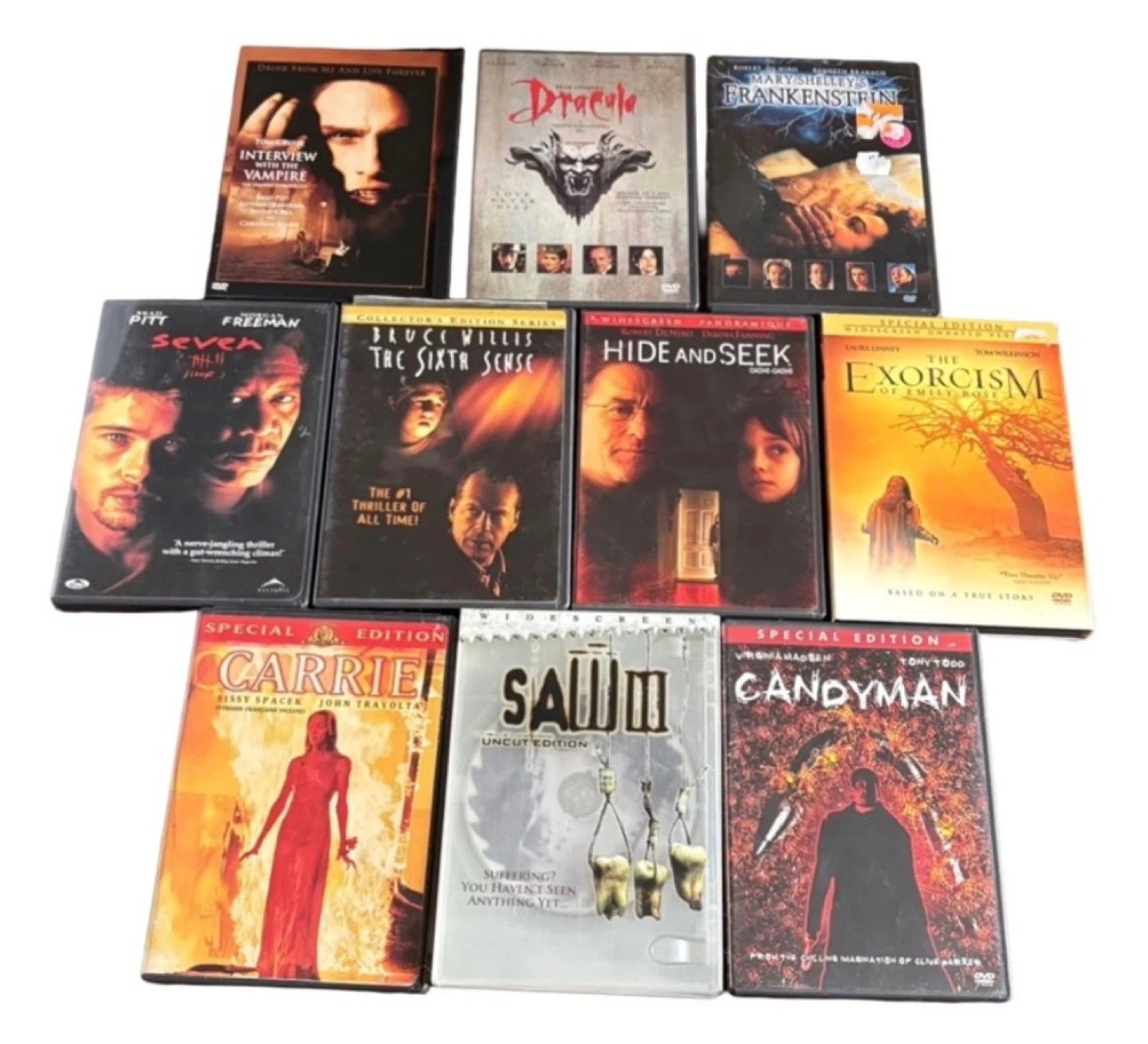 This is a curated collection of 10 essential horror and thriller DVDs, featuring iconic titles from psychological thrillers to supernatural horror. Perfect for collectors or anyone looking to build their physical media library.