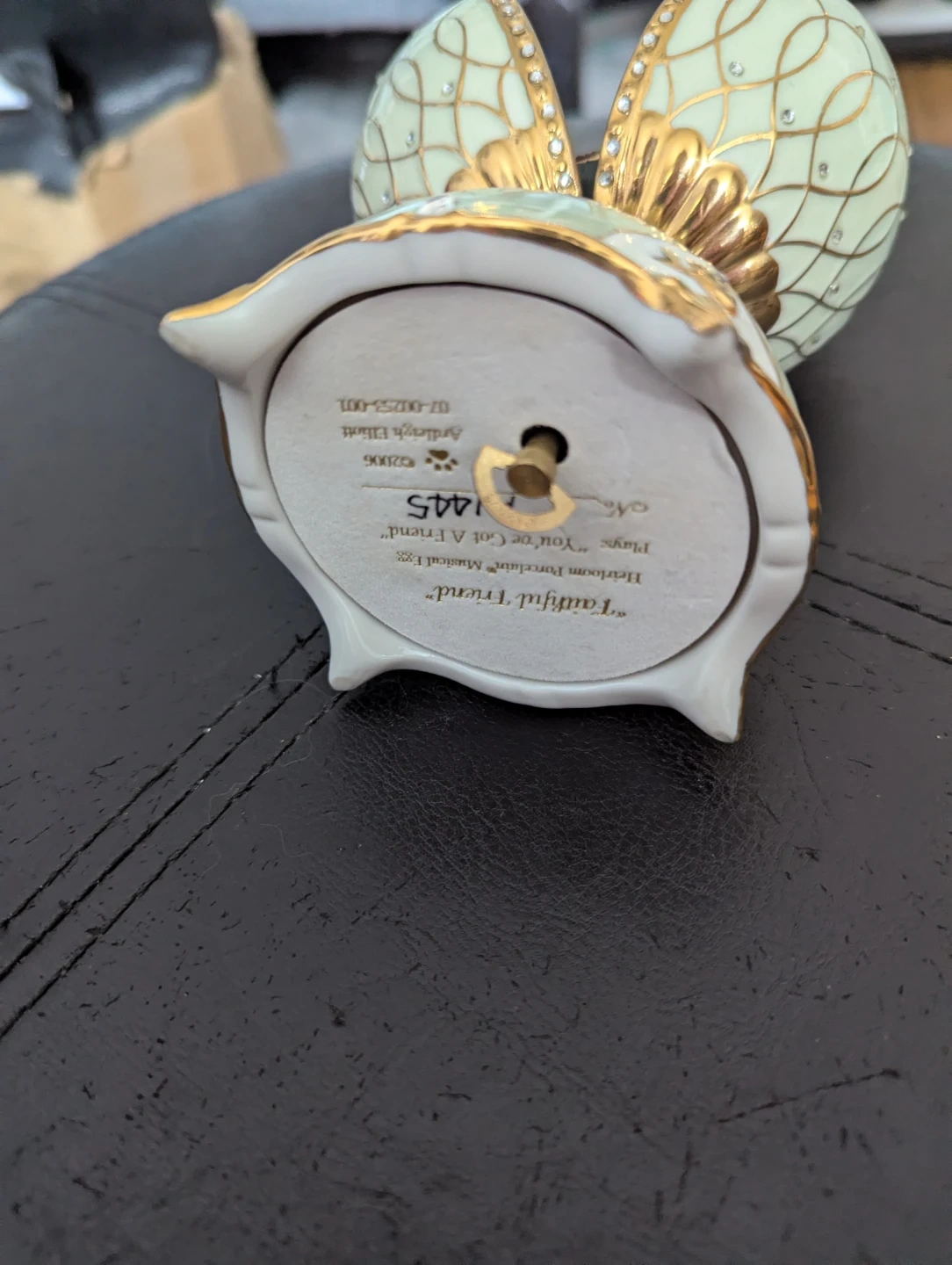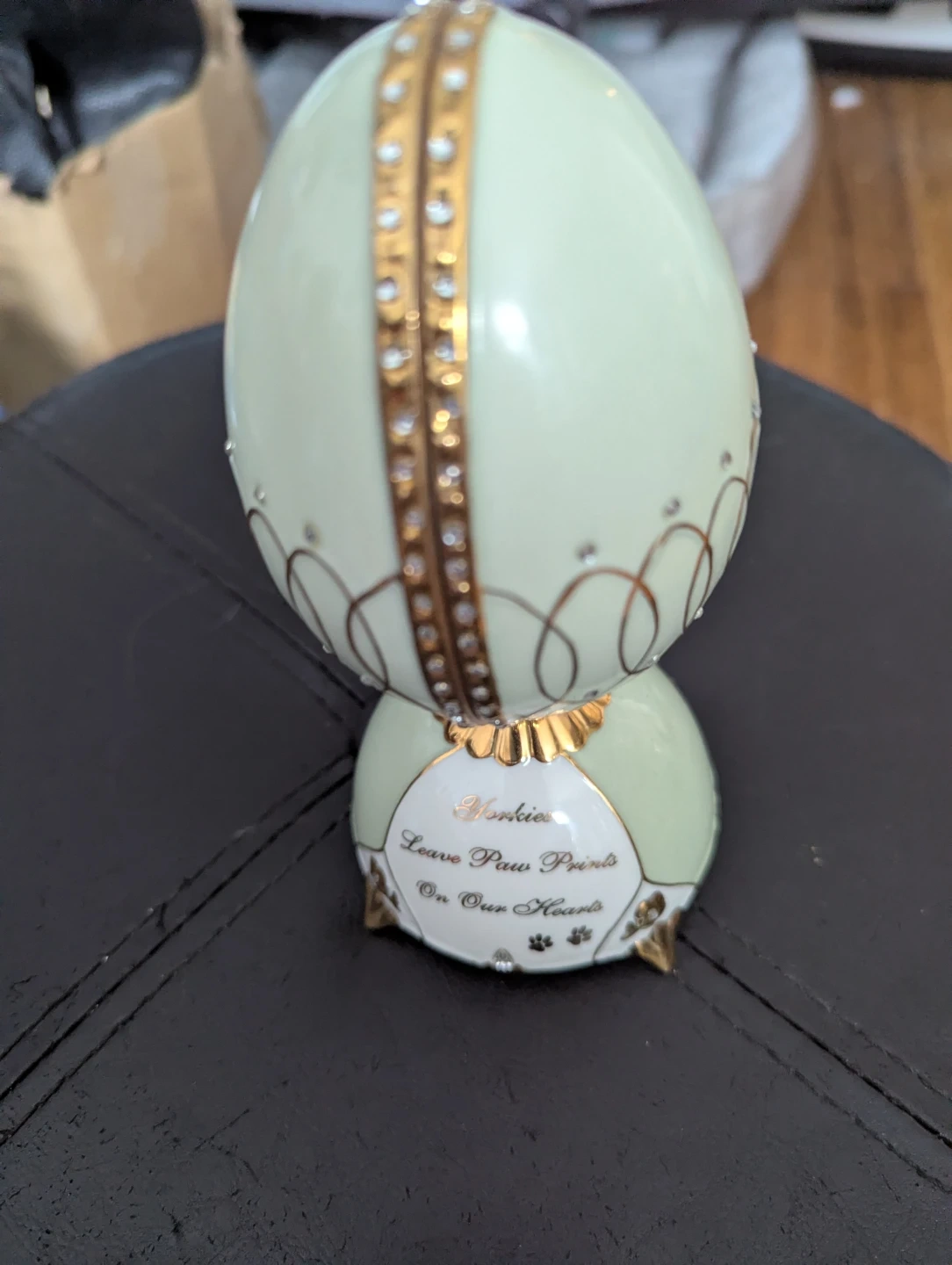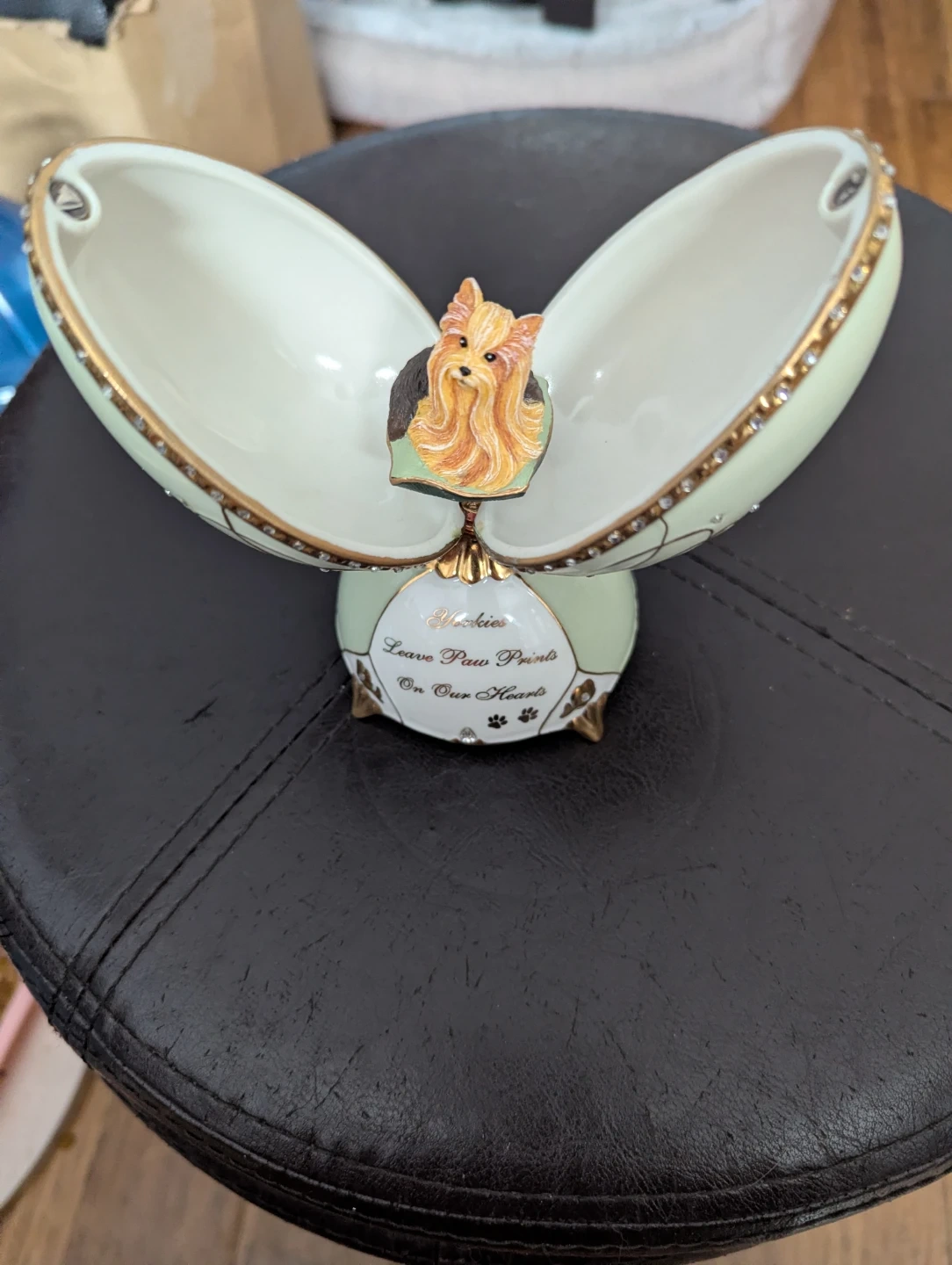 This is a lovely Arleigh Elliott Heirloom Porcelain Musical Egg. It features a Yorkie and plays "You've Got a Friend"