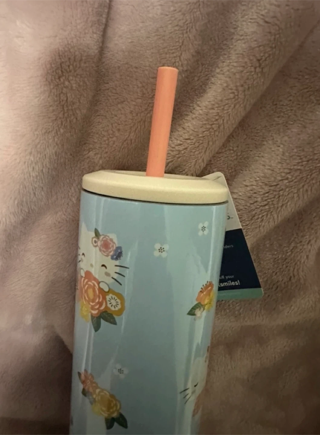 I'm selling a Zak Designs Hello Kitty tumbler! It features a cute floral design on a light blue background and comes with a straw. Perfect for keeping your drinks cold on the go