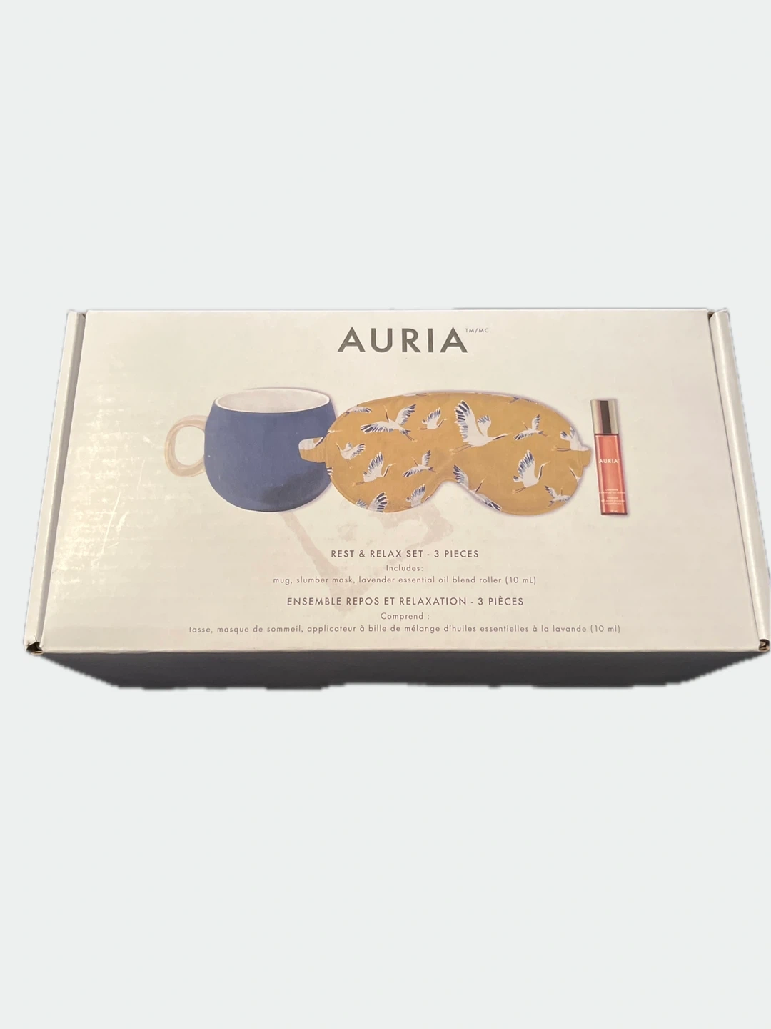 Selling a brand new AURIA Rest & Relax Set! This 3-piece set includes a mug, a slumber mask, and a lavender essential oil blend roller (10 mL). Perfect for creating a relaxing atmosphere at home. Comes in the original box!