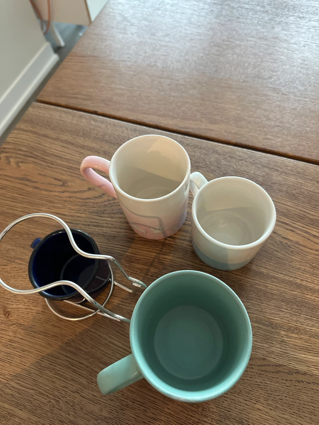 Giving away four mugs in various colours, including a light pink, white, mint green, and dark blue. They come with a convenient metal rack for easy storage and display. Perfect for adding a touch of variety to your morning coffee or tea!
