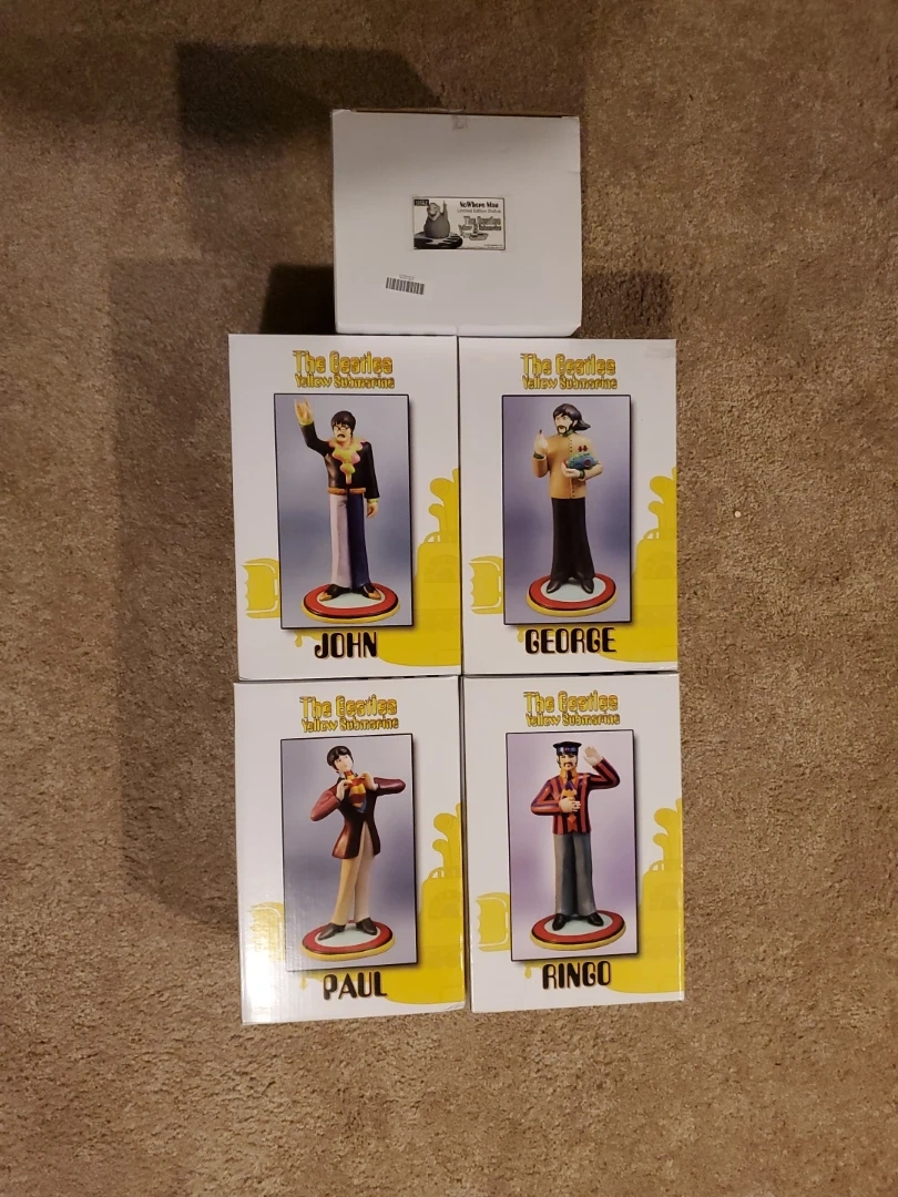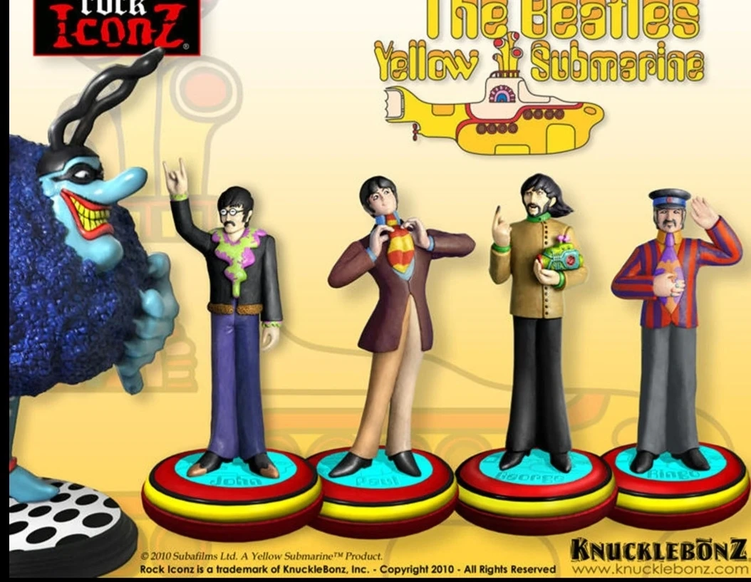 Selling a set of The Beatles Yellow Submarine figures by Knucklebonz! The set includes John, George, Paul, and Ringo, each still in their original boxes. These figures are from the Rock Iconz collection and are in new condition, ready to be displayed! Has the bonus "No Where Man" only available to the first 500 sets.