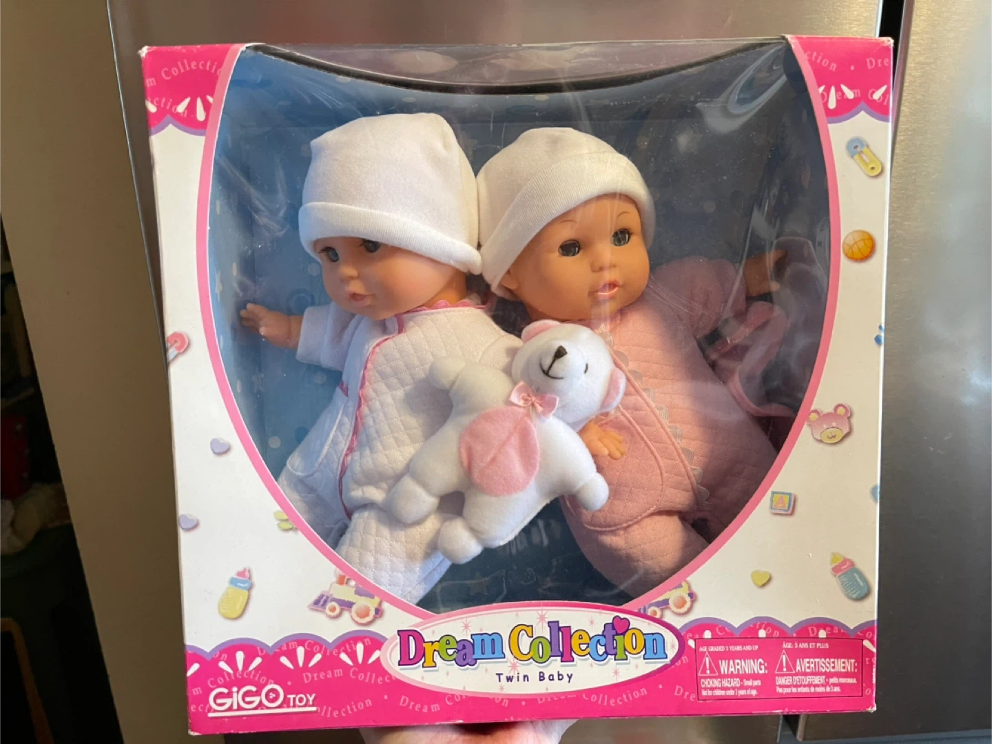 Selling a Dream Collection Twin Baby doll set! It's still in its original packaging. The box indicates it's suitable for ages 3 years and up. Comes with a cute little teddy bear accessory too