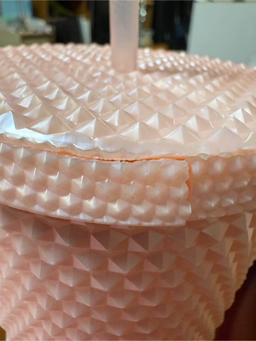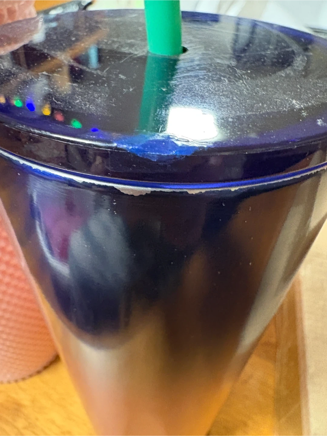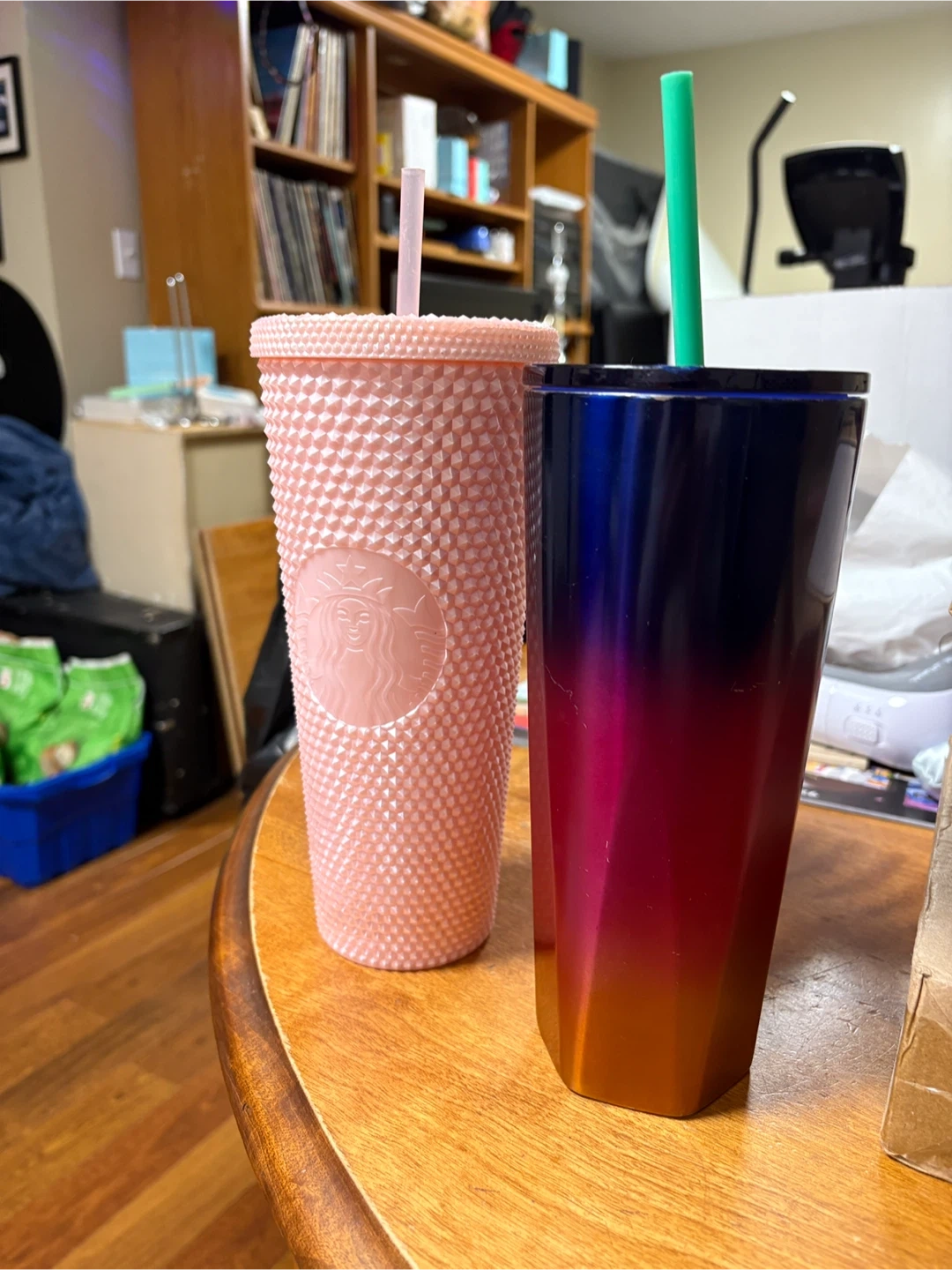 Starbucks tumblers. One is a pink studded tumbler, and the other is a blue/purple/red gradient tumbler. Both show signs of wear and tear, as shown in the photos.