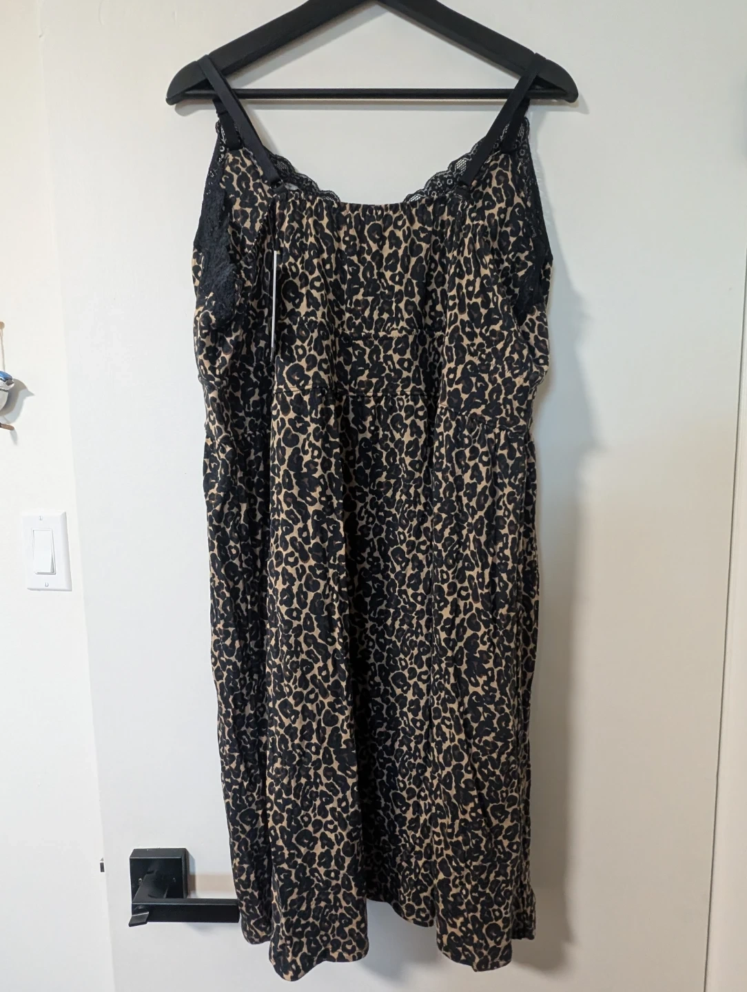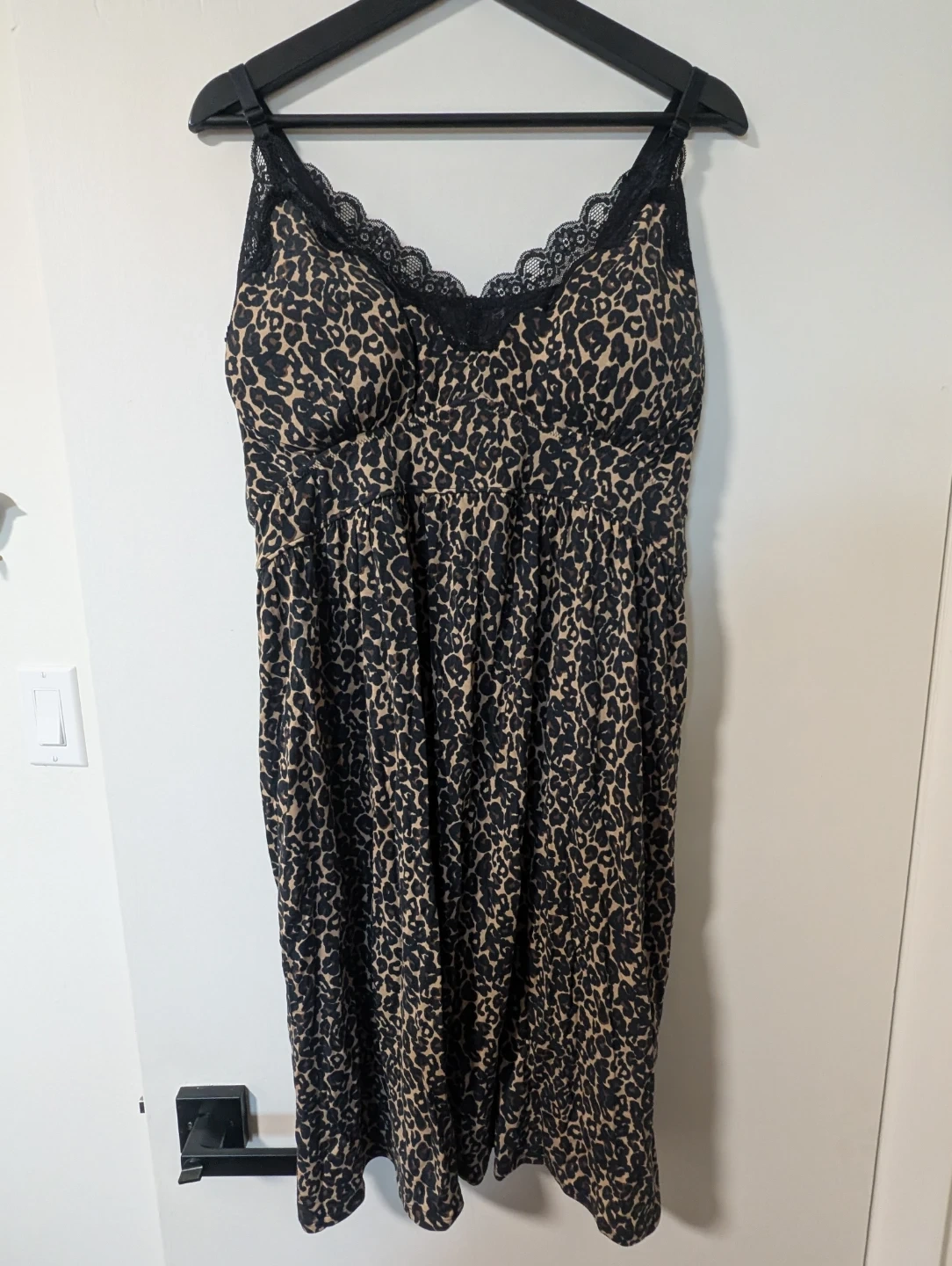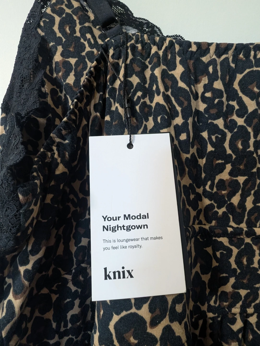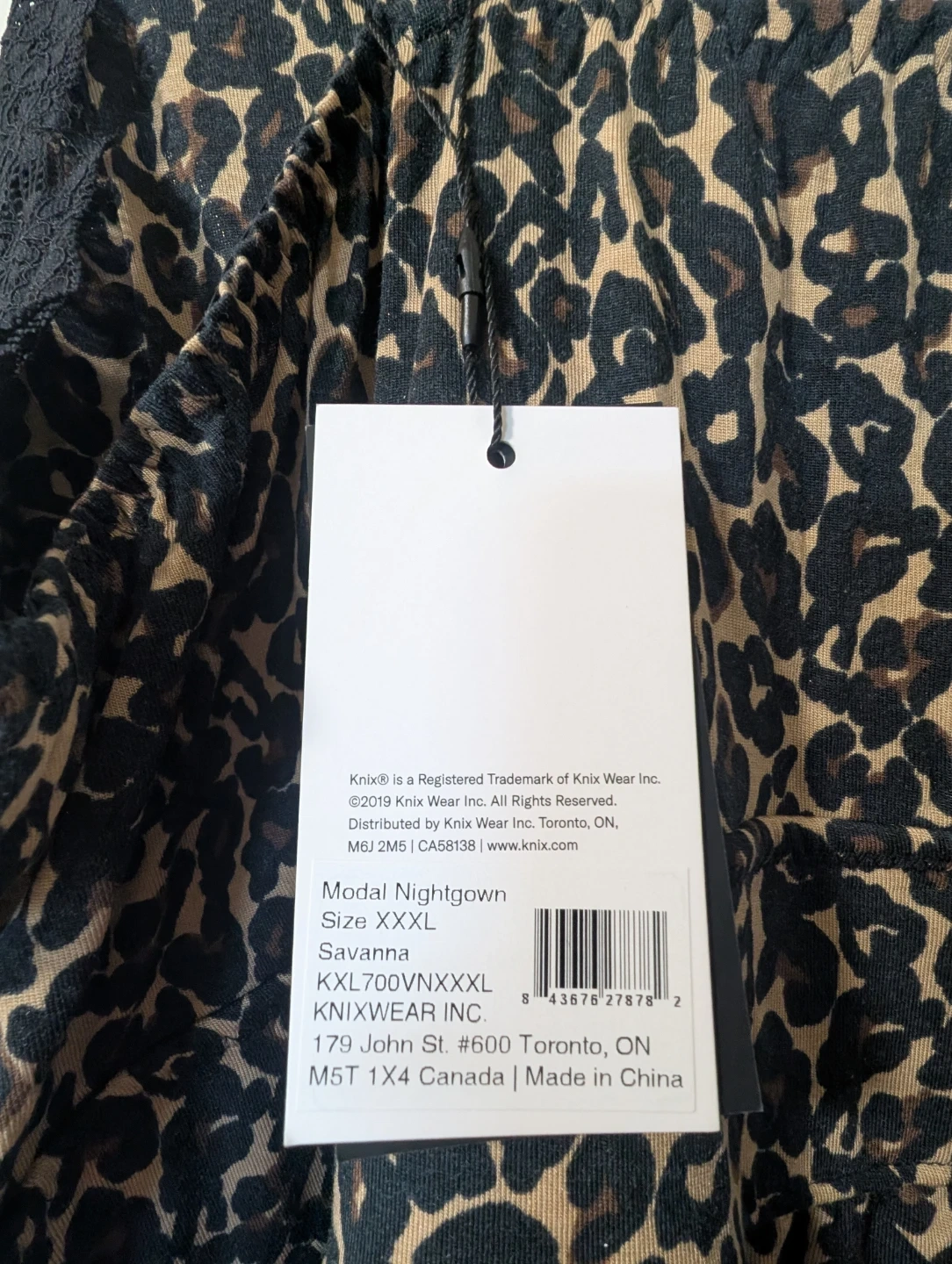 Knix Savanna modal nightgown in size XXXL. It features a stylish leopard print and delicate black lace trim. The material is super soft and comfortable for a perfect night's sleep!