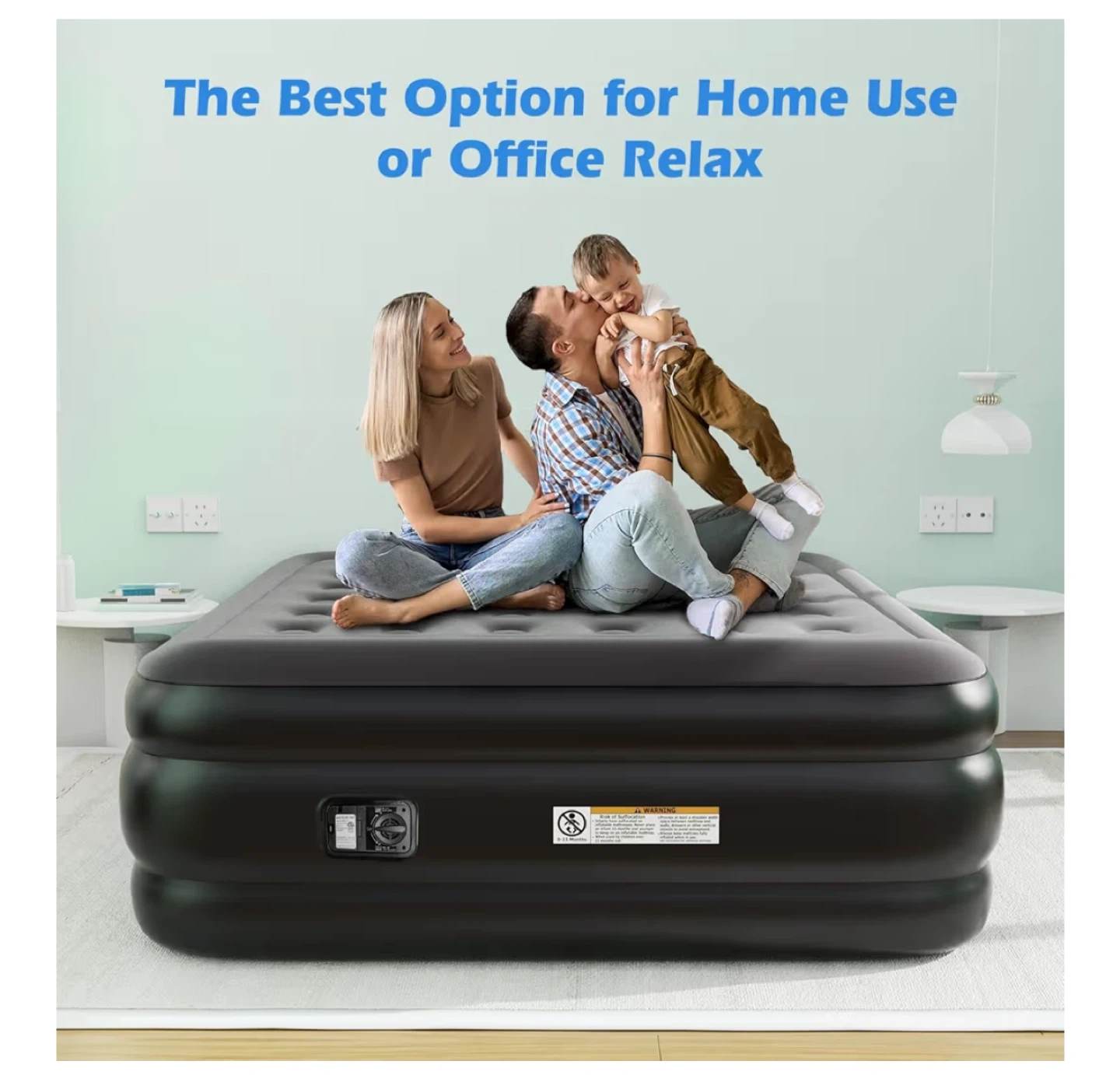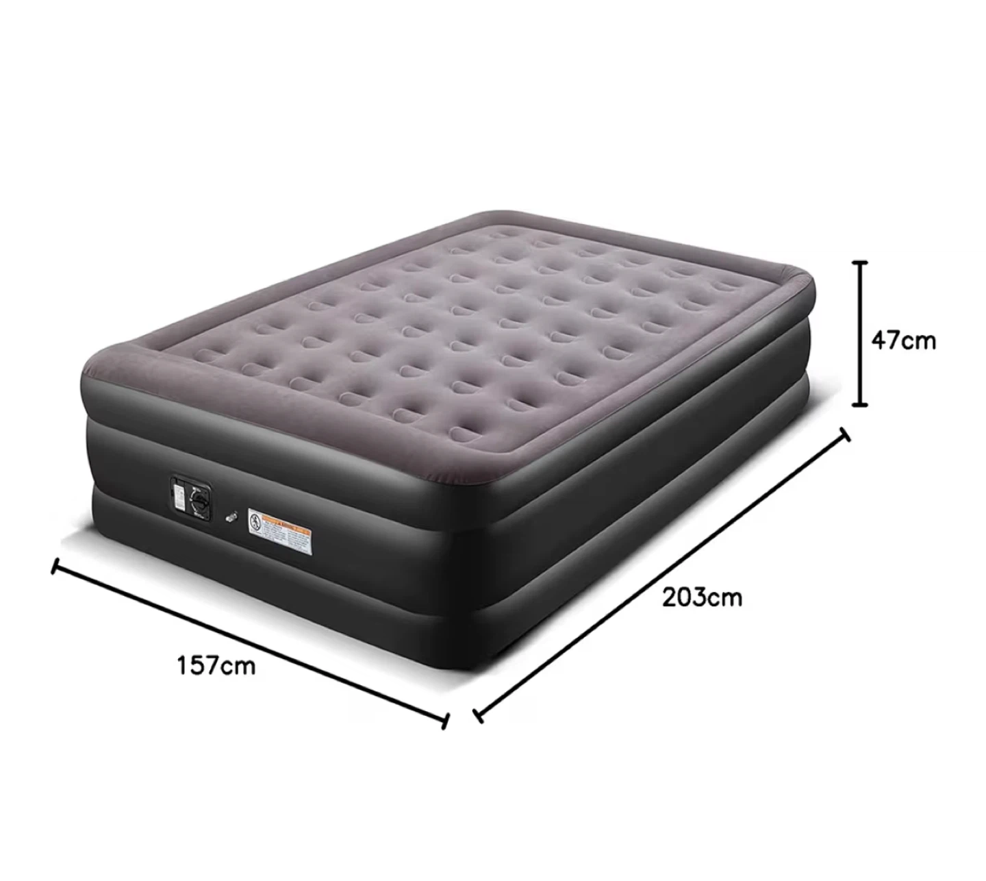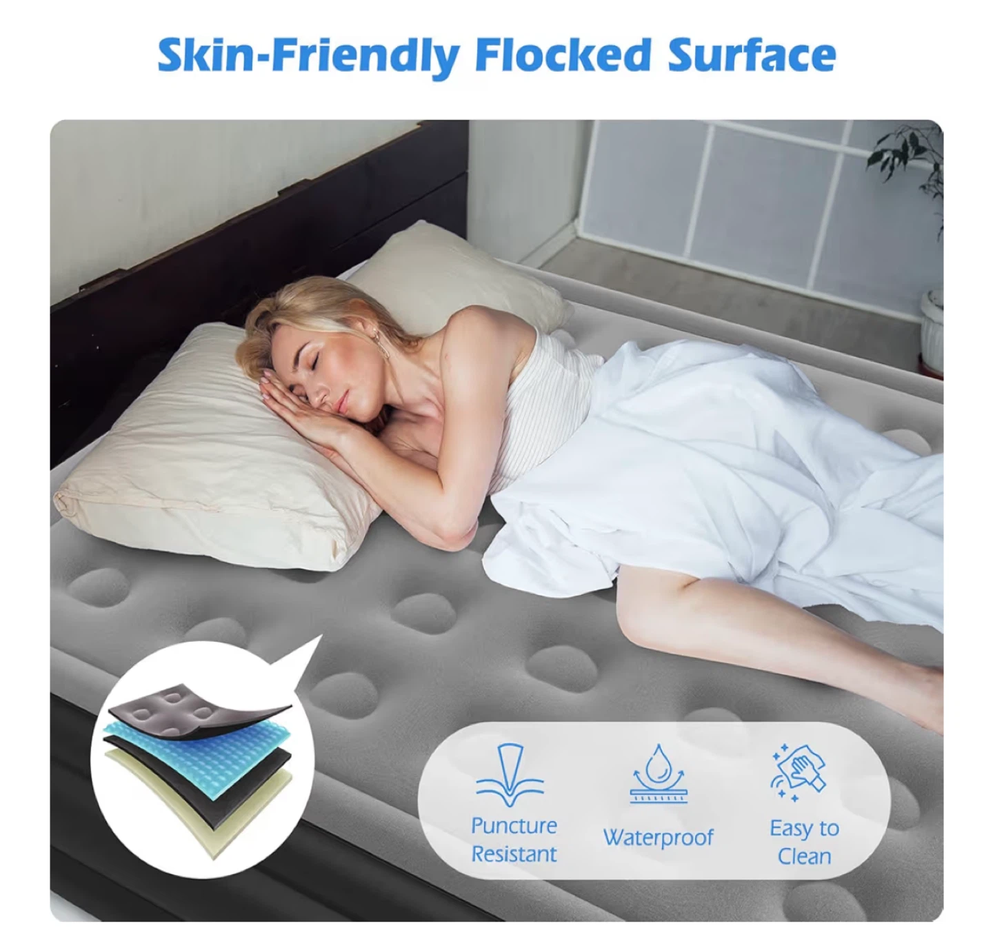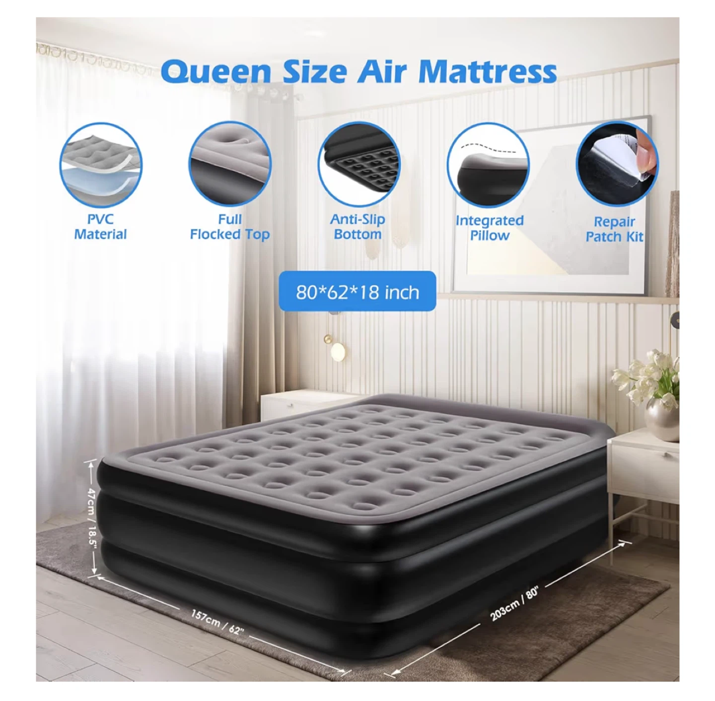This is a queen size air mattress by SENNOUL. It features a full flocked top and an anti-slip bottom. It's made with PVC material and includes an integrated pillow and a repair patch kit. The dimensions are 80*62*18 inches.