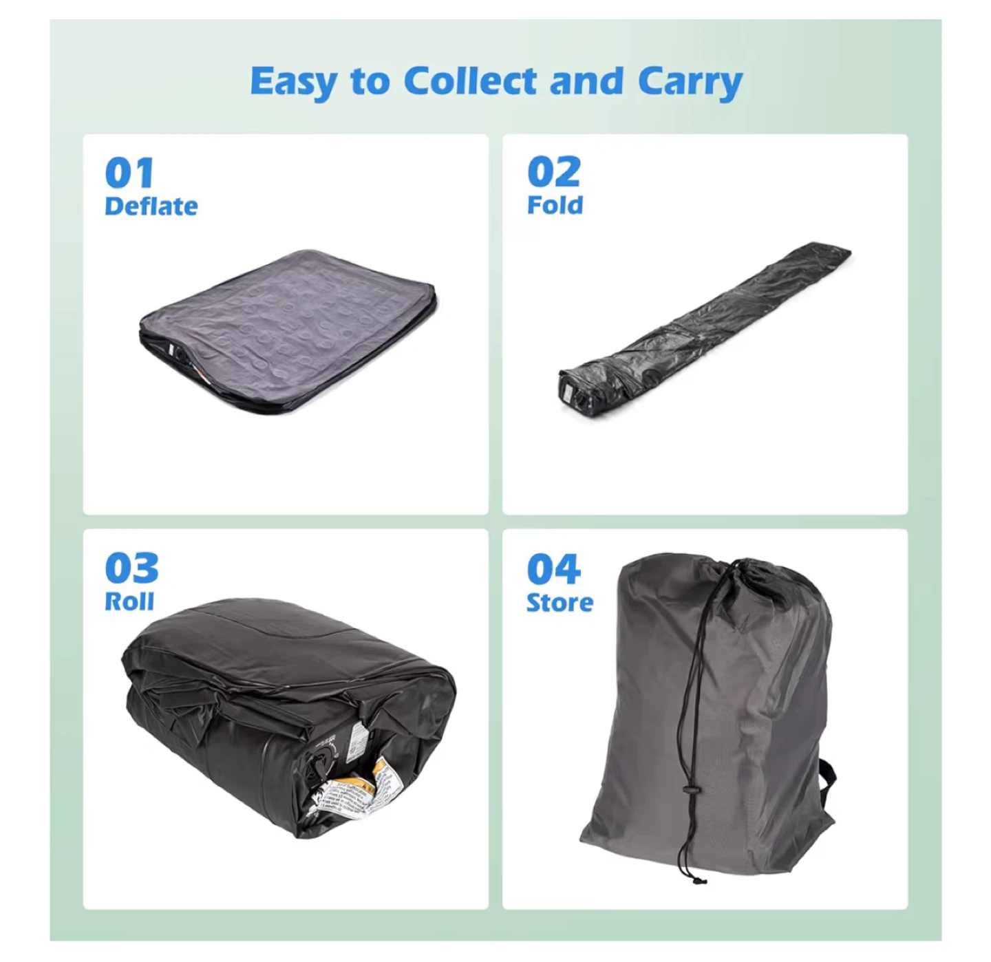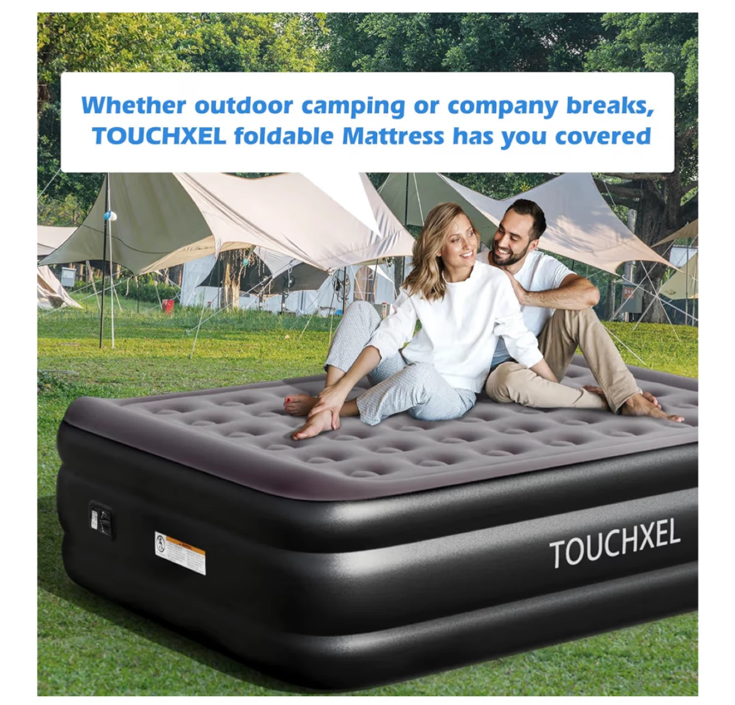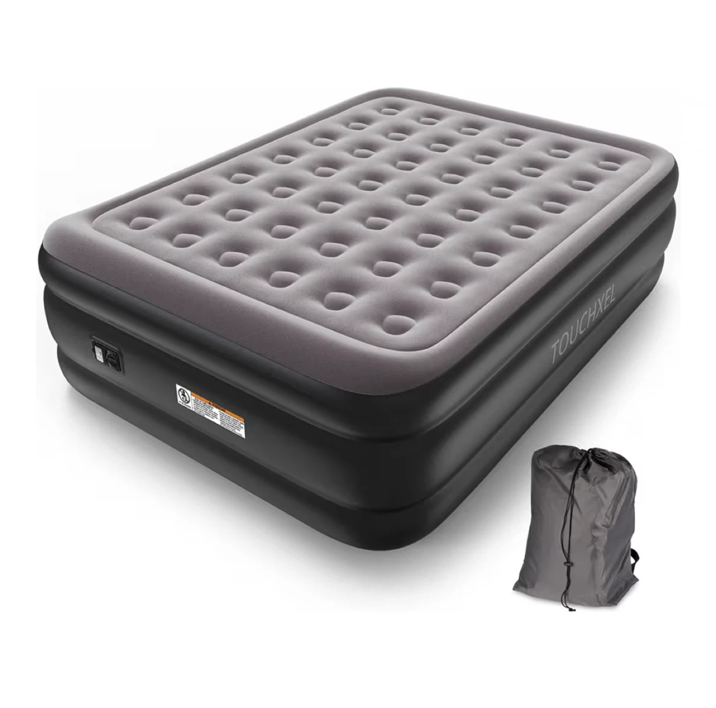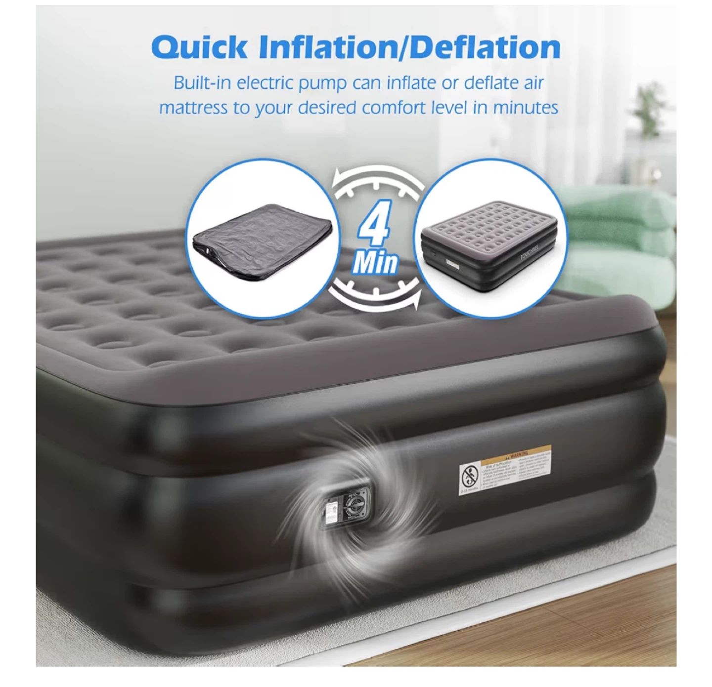 This is a queen size air mattress by SENNOUL. It features a full flocked top and an anti-slip bottom. It's made with PVC material and includes an integrated pillow and a repair patch kit. The dimensions are 80*62*18 inches.