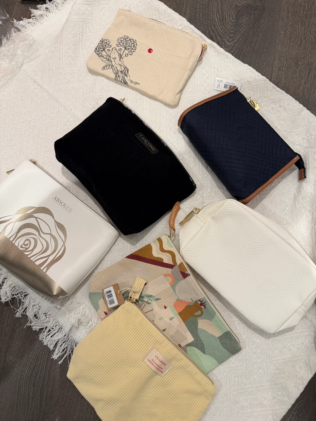 Selling a collection of cosmetic bags from various brands! You'll find bags from Lancome, Shiseido, Clarins, and Absolue. They're perfect for storing your makeup and skincare essentials. They're brand new !