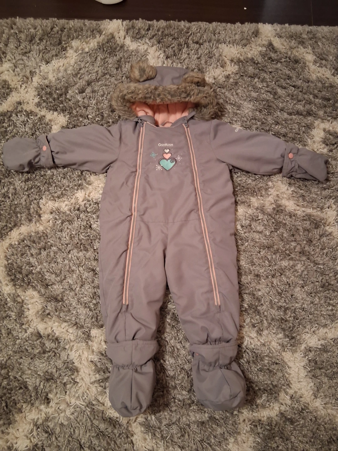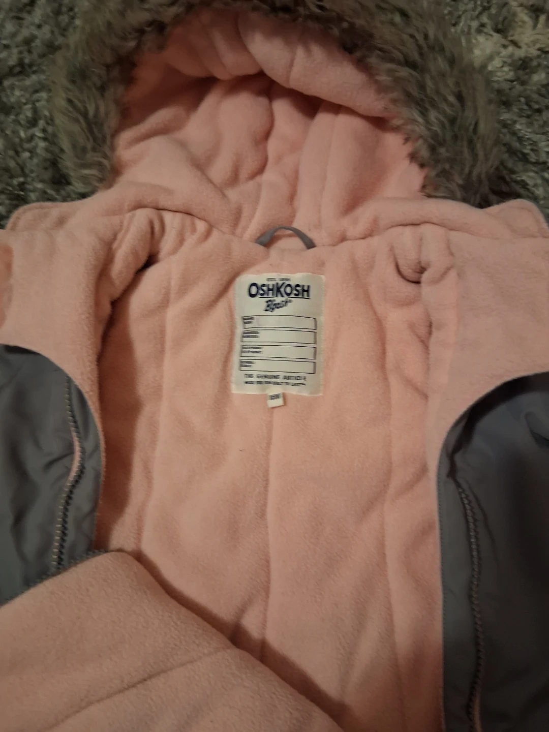 Selling a super cute OshKosh B'gosh snowsuit in size 18M! It's grey with pink accents and a cozy fur-trimmed hood. Perfect for keeping your little one warm and snug during the winter months.