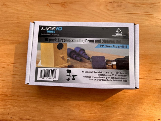 Line 10 Tools -16 Pack Blue Zirconia Sanding Drums and Sleeves Set for Drill $10 each box. 6 boxes for $50 Many Available!!! Product details - Extra long rubber drum sanding set with each drum mounted on a 1/4 inch shank which converts your drill or drill press into a mini spindle sander - Great for Woodworking and metal fabrication: Sanding sleeves are made of blue zirconia heavy-duty abrasive that will last 10x more than standard brown aluminum oxide, Free of iron, sulfur, and chlorinated fillers which makes it suitable for stainless steel fabrication as well as fine woodworking - Ideal for smoothing out rough round profile edges, contours, and curved cuts, Great for sanding the inside surfaces of up to 2-inch deep drilled holes, deburring curved cuts in metal and wood. - Cleans up saw marks from your jigsaw, bandsaw or hole saw and any other contour cut - Kit contains: 4 drum diameters in 1/2 in, 3/4 in, 1 in, and 1-1/2 inches, with 12 sanding sleeves in 60, 80 and 120 grits