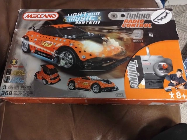 Meccano Tuning Remote Control Orange Racer, brand new, open box. A super hot Meccano Tuning Streetcar Racer that you can build and tune to your own specifications. This orange remote control car features lights, music and some really cool effects. For Children 8 to 99 years. Made in China by Meccano. This RC Tuning Racing Car can be build into any 3 styles and include more than 368 pieces. This fully functioning radio controlled Meccano Tuning Street Racing Car produces sounds and lights. With realistic sound effects of screeching tires when it goes round corners and a 'Vroom' roaring engine when you accelerate. It also has a music player that plays two music styles, Rock and Hip Hop. Using optic fibers the Meccano Tuning RC Car has fully working flashing headlights and rear lights and even a neon lighting under the chassis.