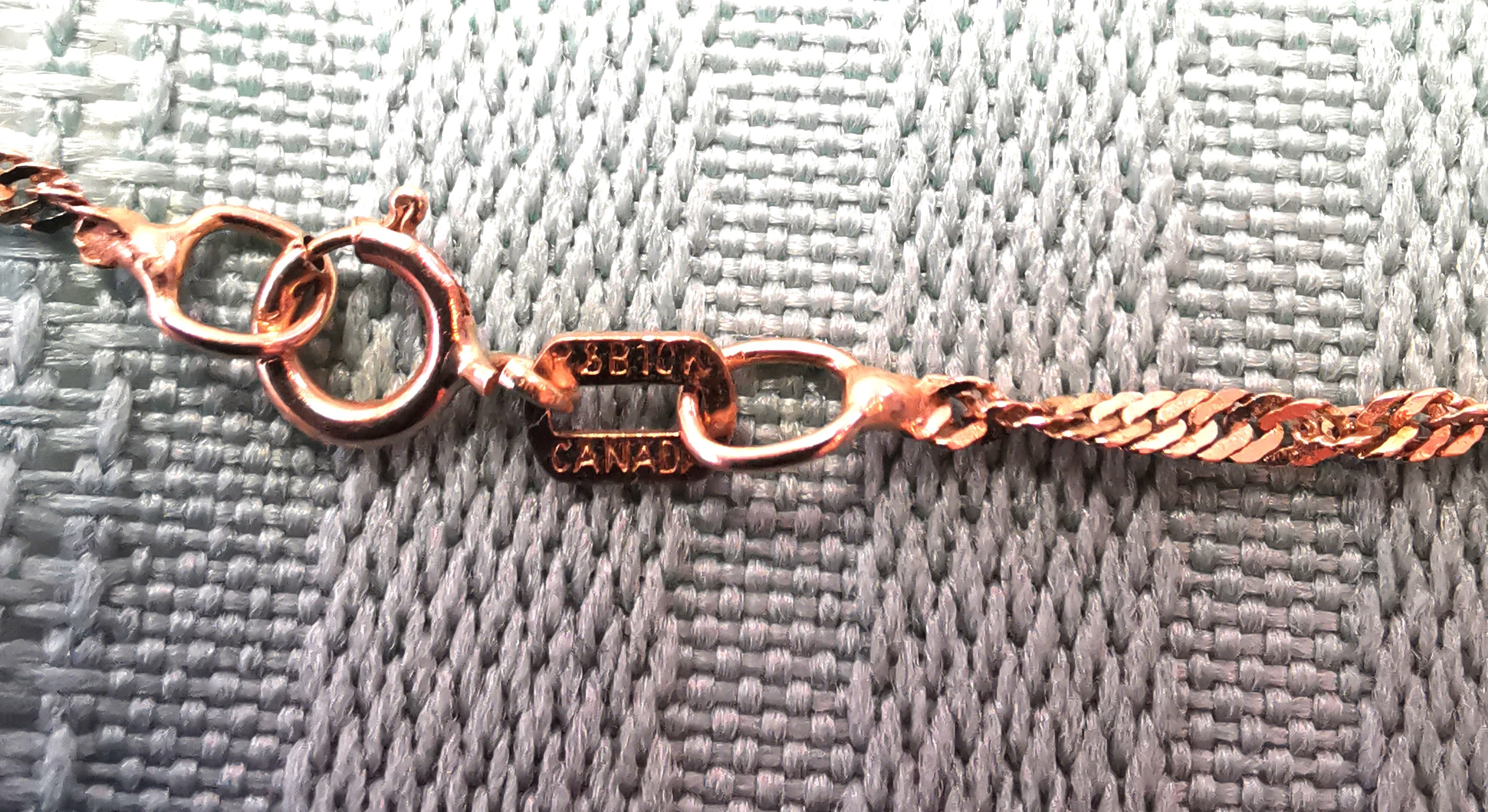 The chain is very fine and lightweight, designed for minimalist wear or layering. It is not a thick or heavy chain and is best suited for delicate use rather than supporting heavy pendants. The gold purity and origin are confirmed by the stamped hallmarks “SB / 10 KT / CANADA.”