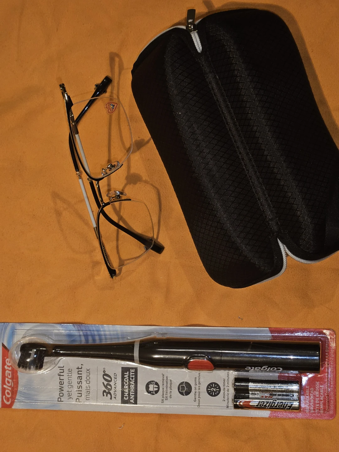 Selling a Colgate 360 Advanced Charcoal Anthracite toothbrush. It's powerful, yet gentle. Also including a Prescription pair of glasses with a strong flax plastic, impact resistant. Can be used for all types of Prescription. Brand new.