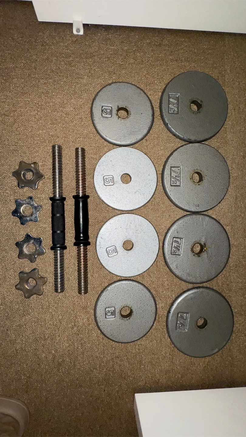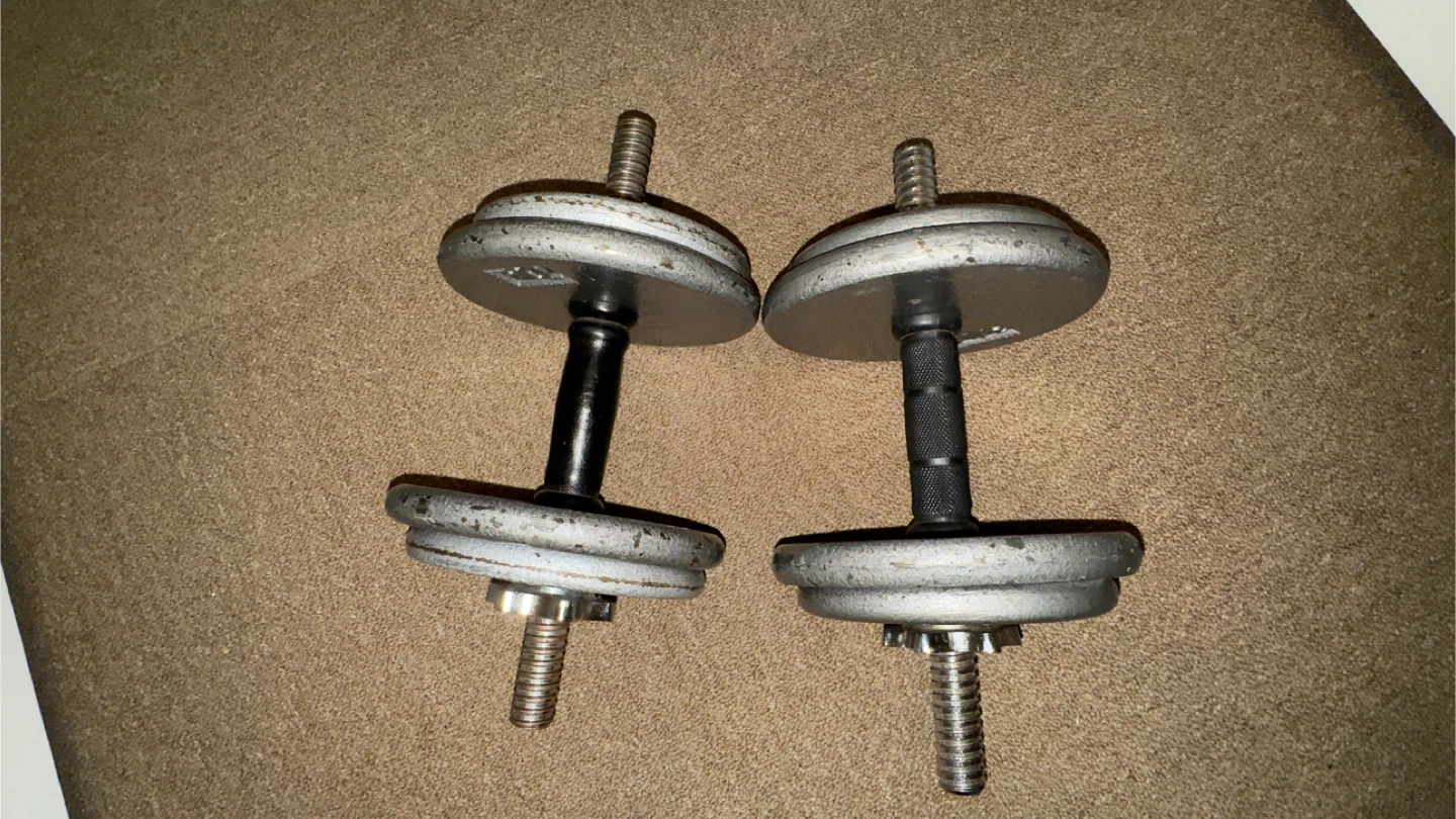 Selling a set of adjustable dumbbells, each with a maximum weight of 30 lbs. They're in good condition and ready for your home workouts. Perfect for anyone looking to add some strength training to their routine!