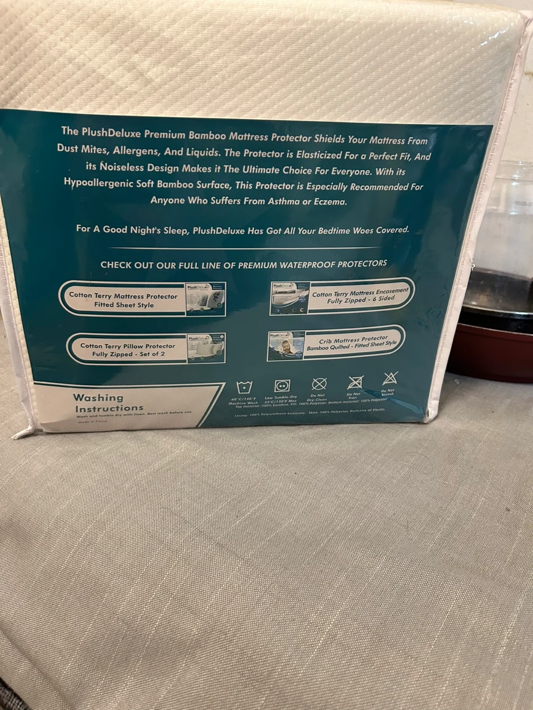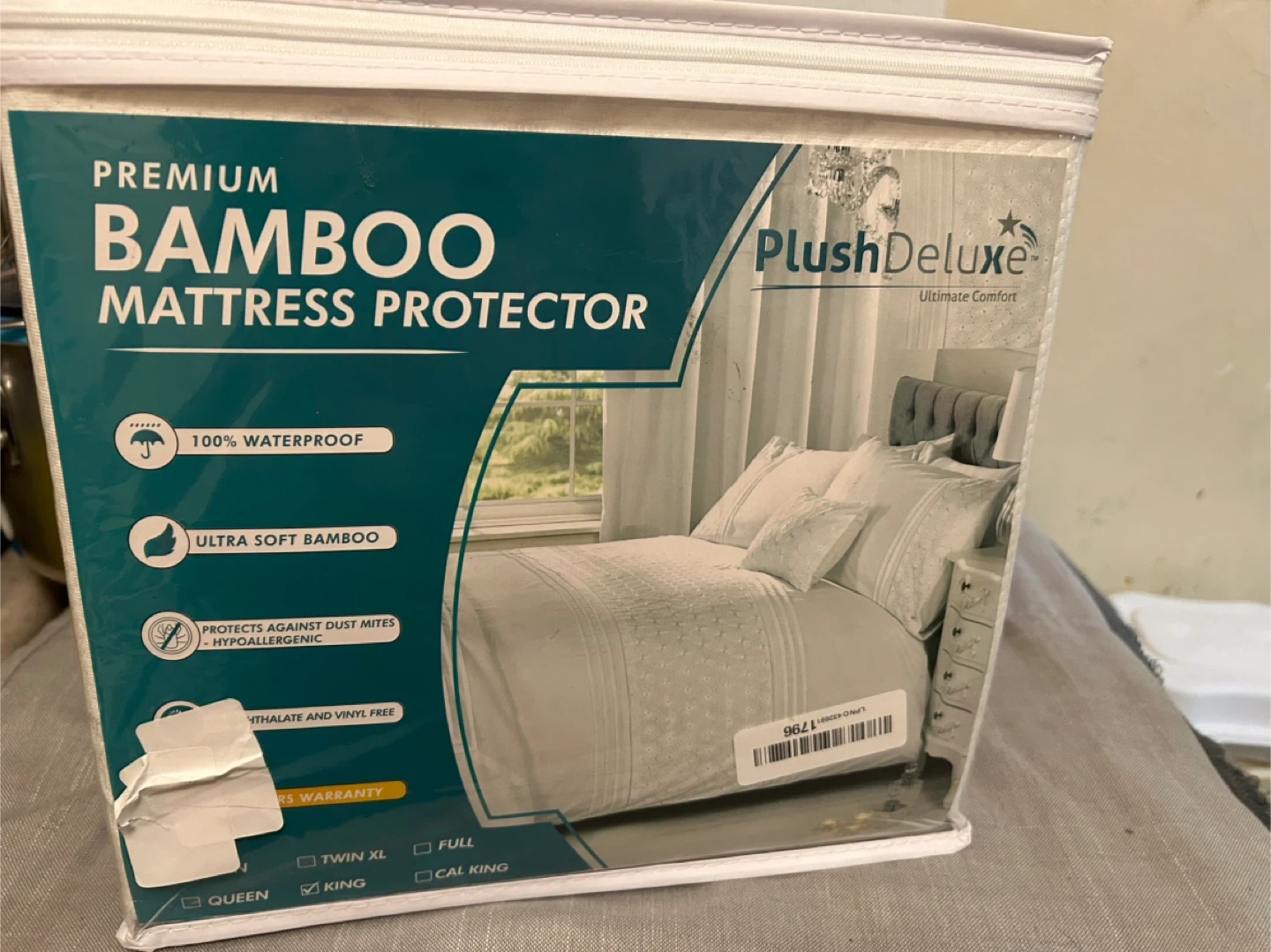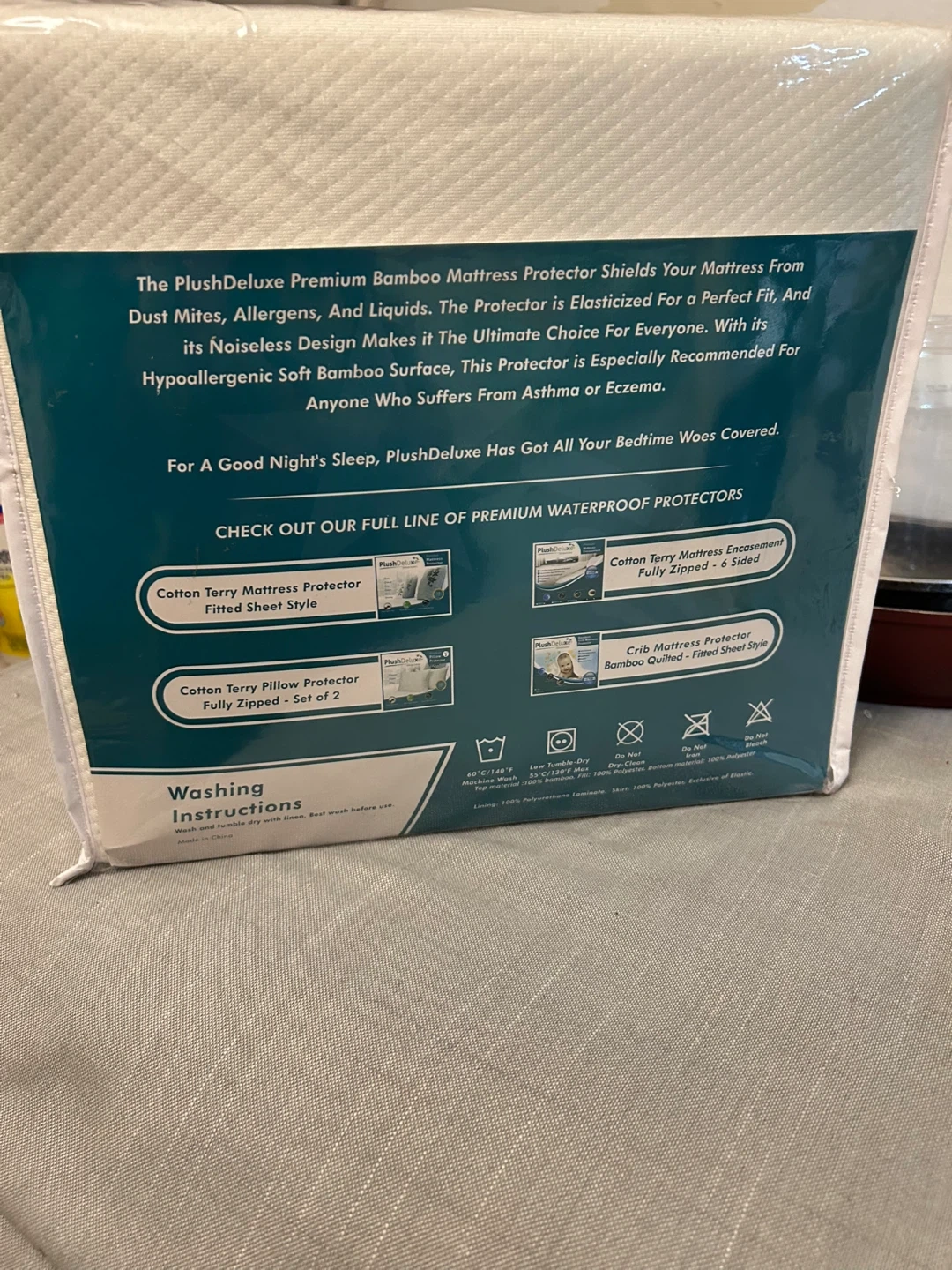 Selling a brand new PlushDeluxe Premium Bamboo Mattress Protector! It's designed to shield your mattress from dust mites, allergens, and liquids, ensuring a good night's sleep.