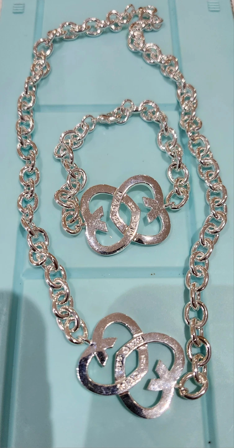 Selling a Interlocking G silver necklace and bracelet set. The set features the iconic interlocking G logo. Both pieces are made of 925 silver plated. They are in good condition and ready to wear!