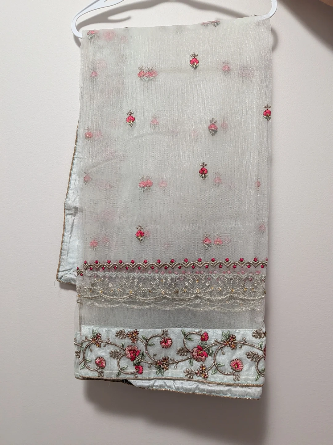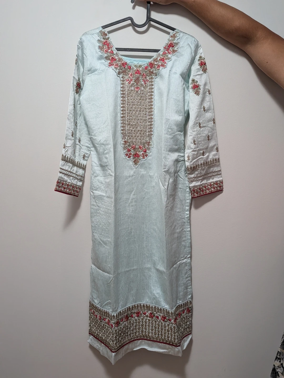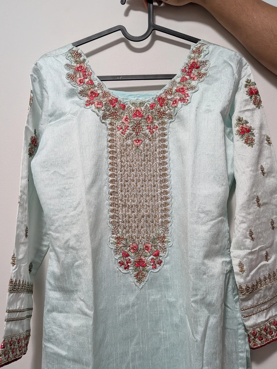 Beautiful light blue shalwar kameez with intricate embroidery. The set includes a long kurta (tunic), pants, and a matching dupatta (scarf). Perfect for a special occasion!