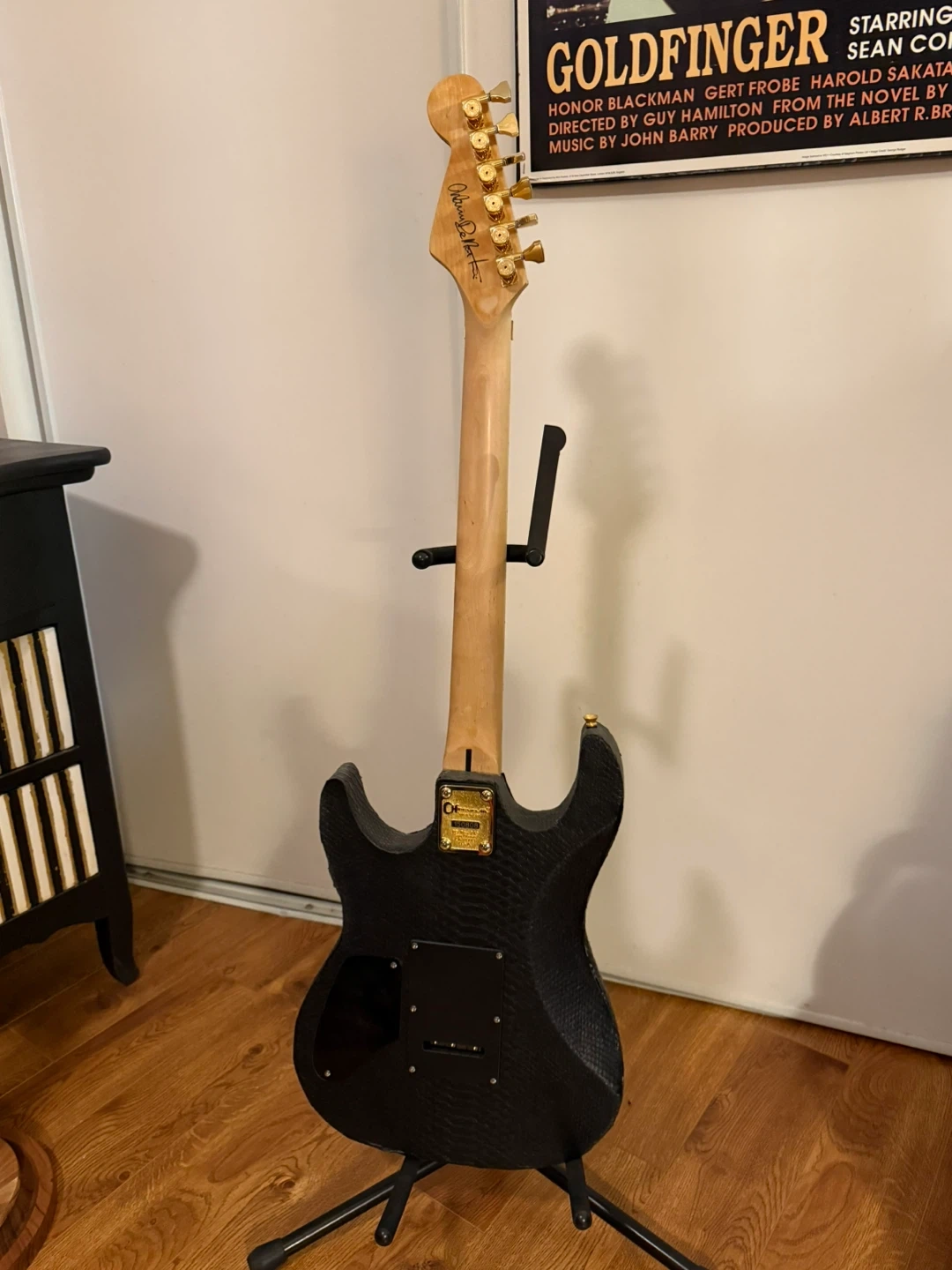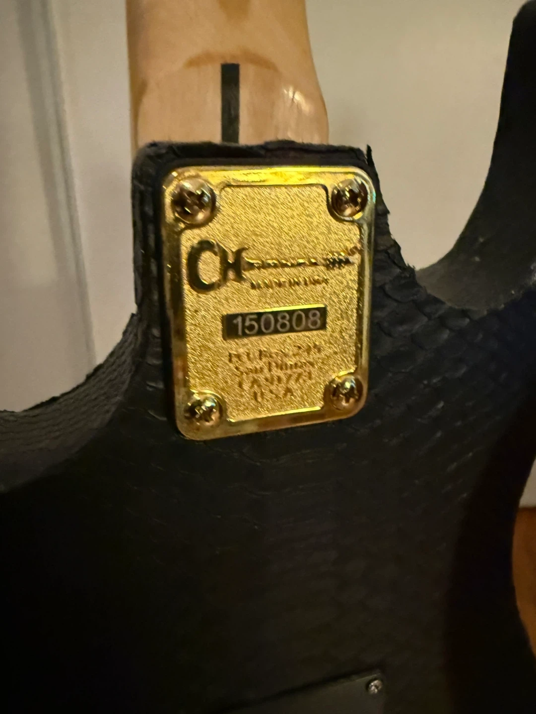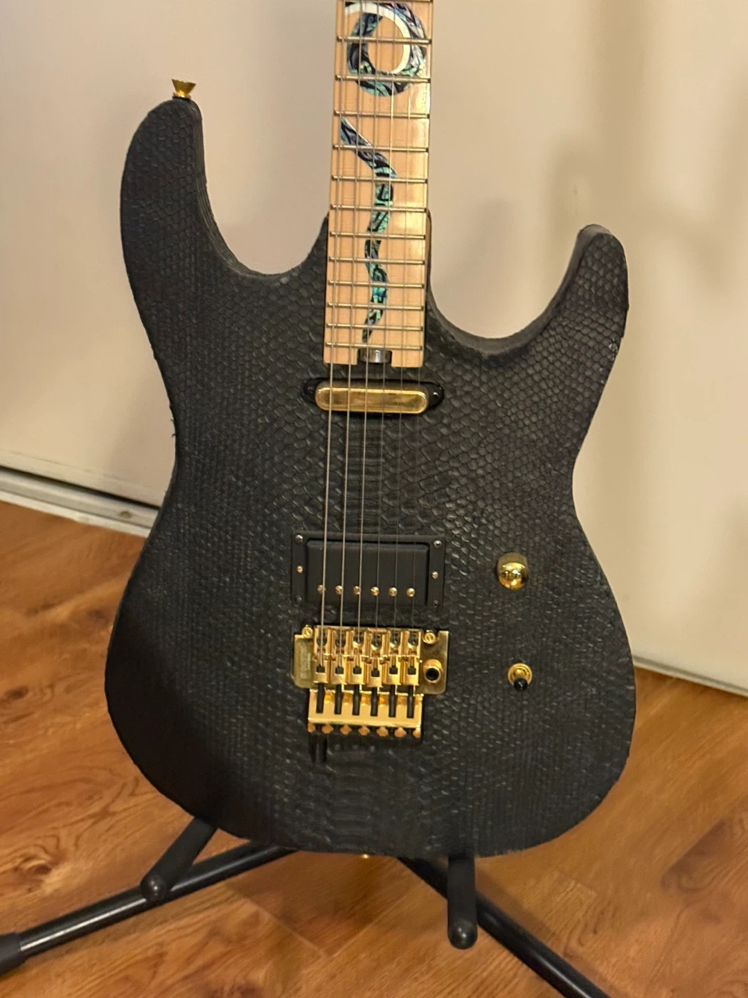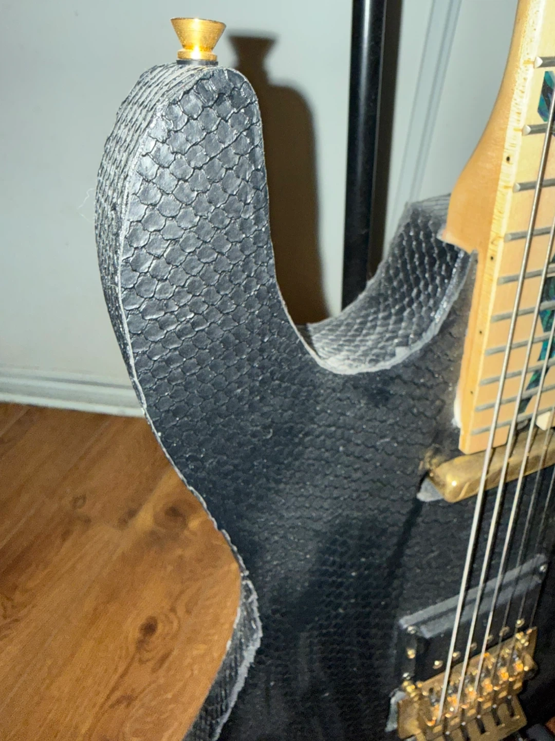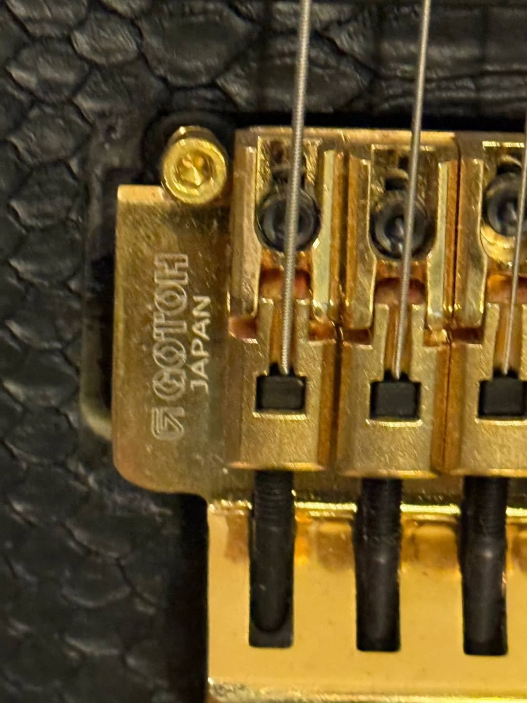 This guitar has a unique look with a black snakeskin and gold hardware! The bridge is a Gotoh Japan. It's in great condition for its age and plays well