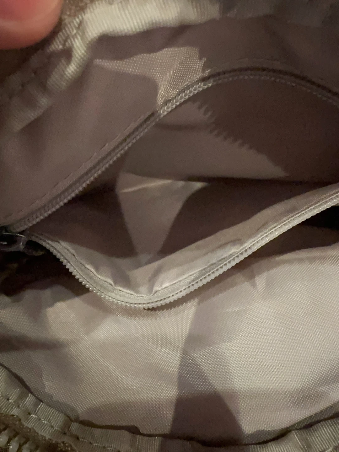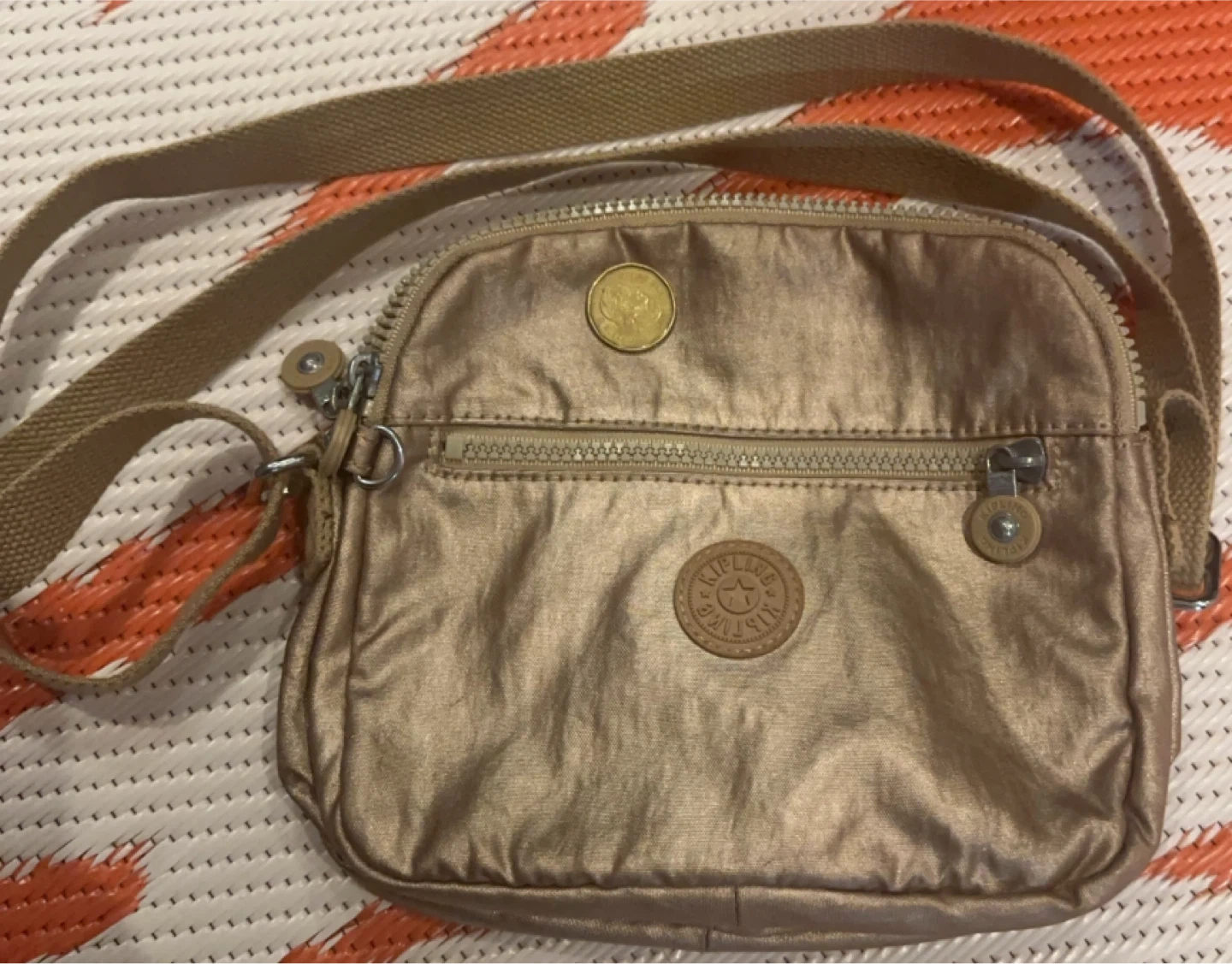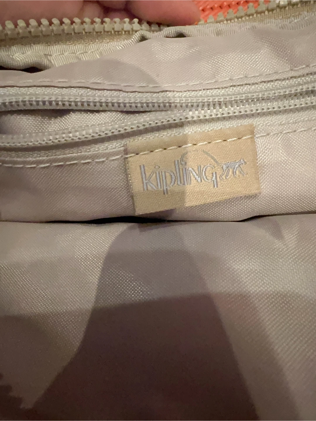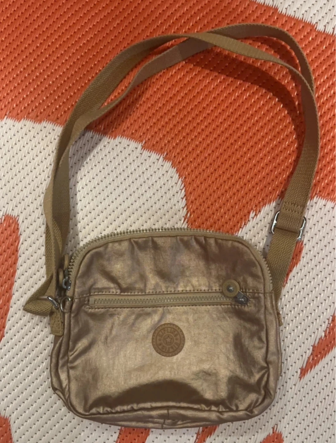 This is a Kipling crossbody bag in a neutral colour. It has a zipper closure and an adjustable strap. It's in good condition and ready for a new owner!