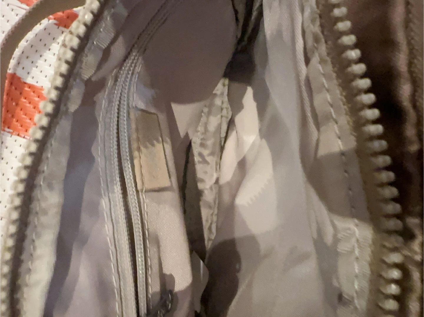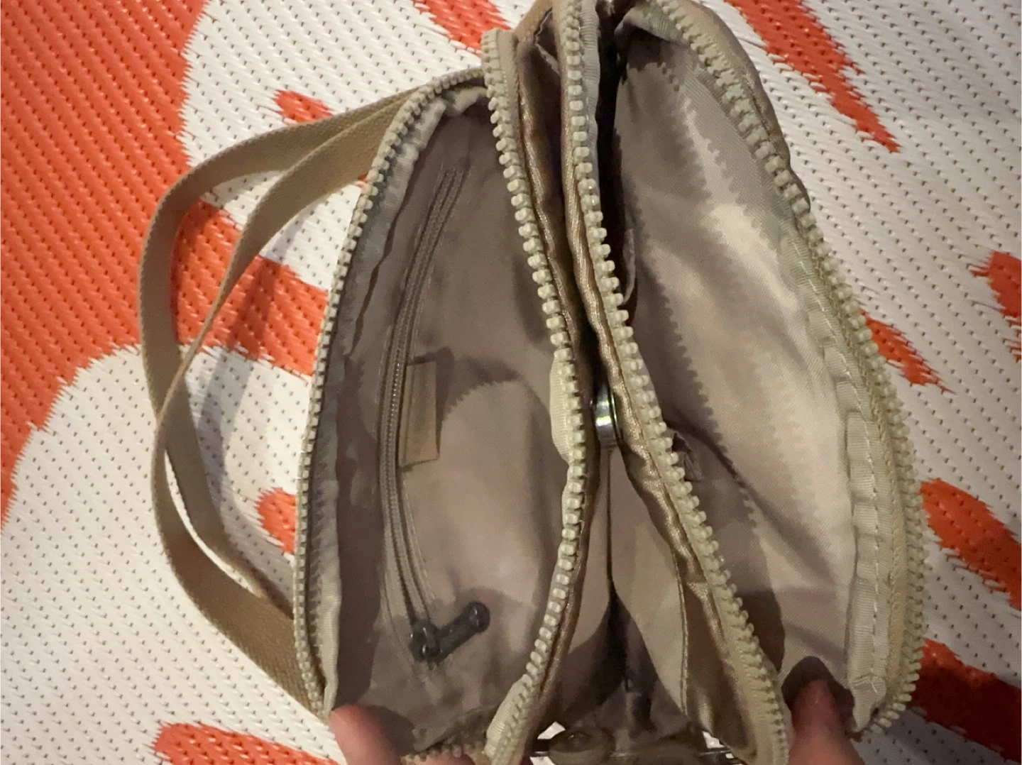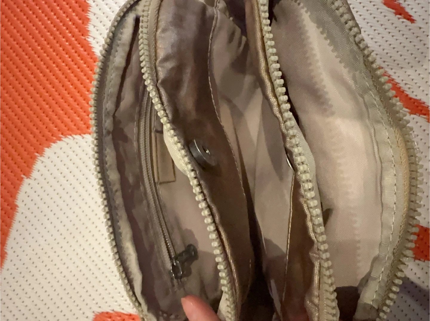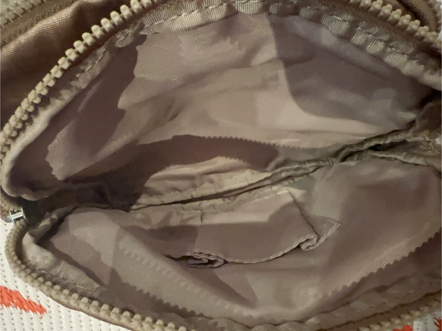This is a Kipling crossbody bag in a neutral colour. It has a zipper closure and an adjustable strap. It's in good condition and ready for a new owner!