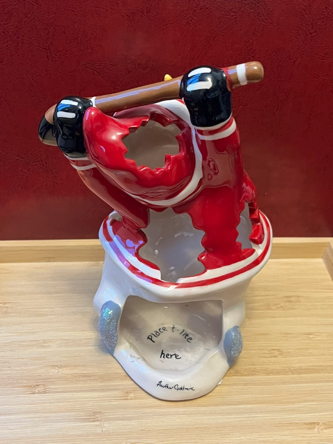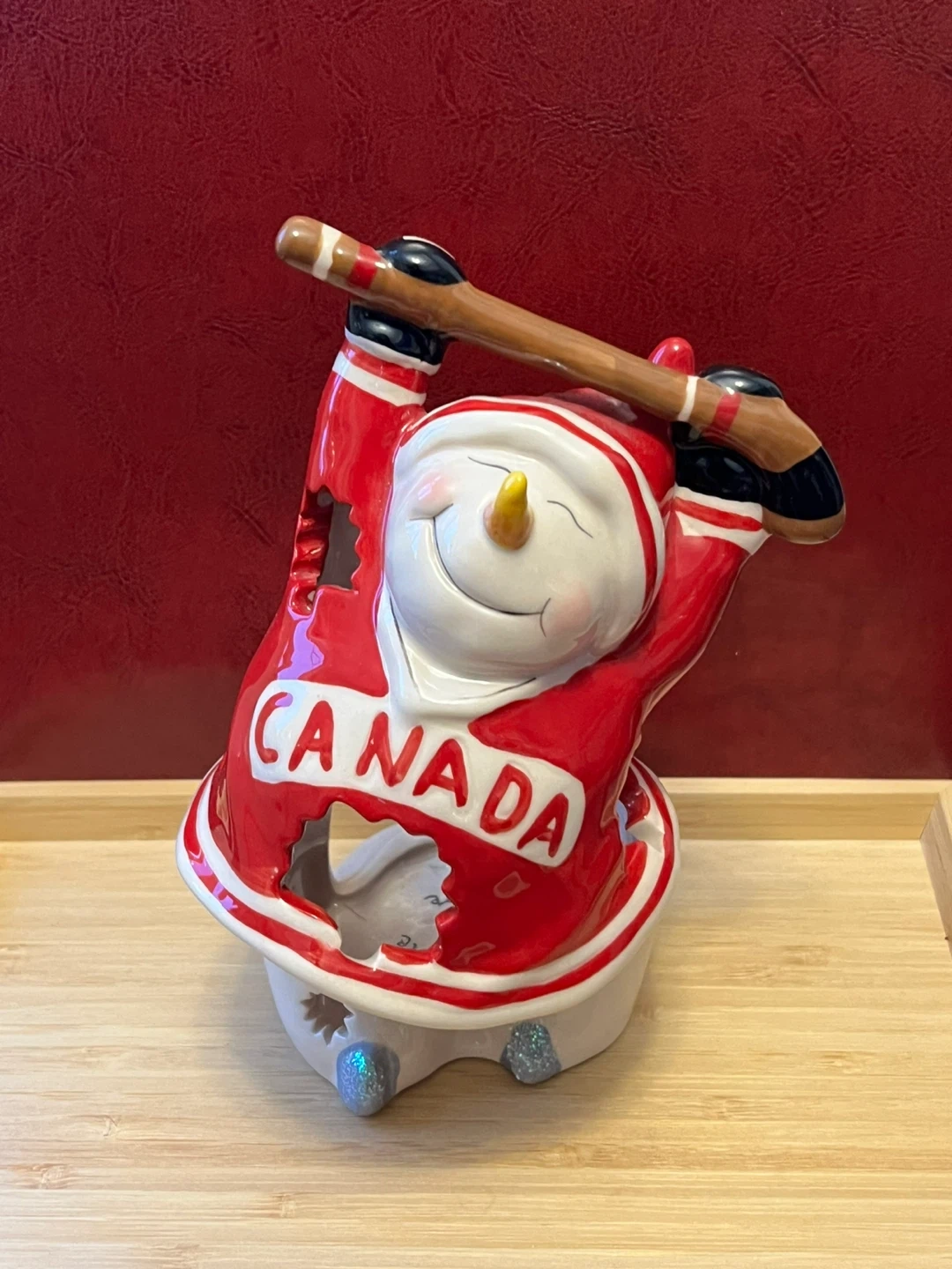 Here's a charming Canada-themed snowman candle holder figurine, perfect for adding a touch of Canadian pride to your decor! It's dressed in a red and white Canada hockey jersey and holding a hockey stick. The figurine is in great condition and ready to brighten up your space.