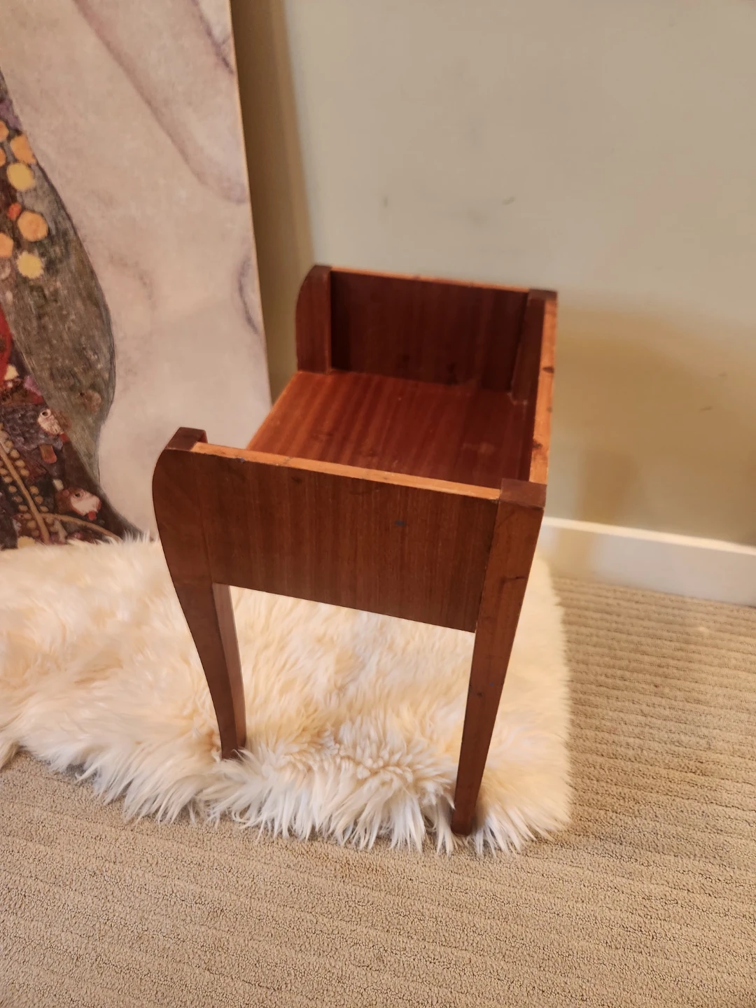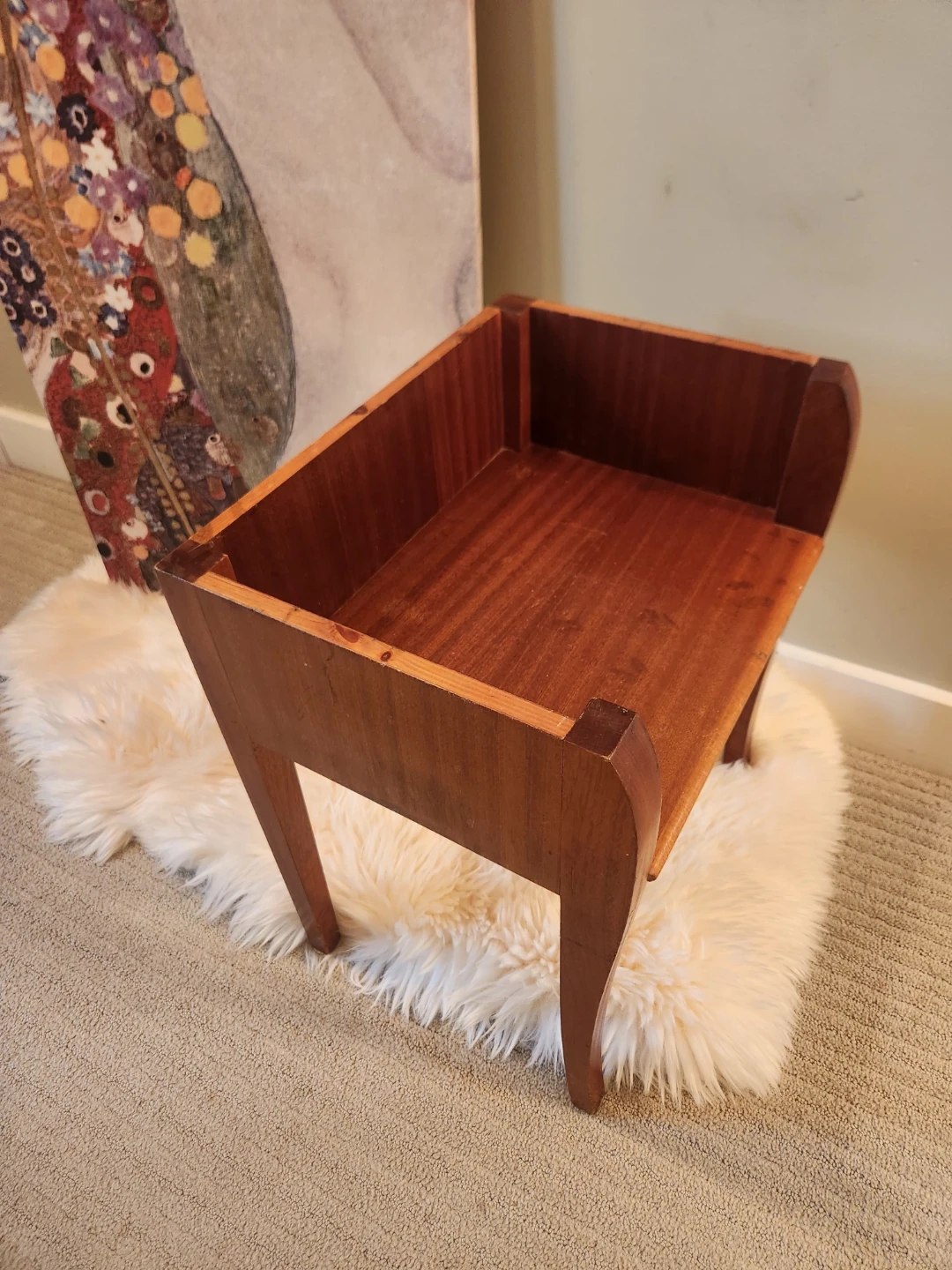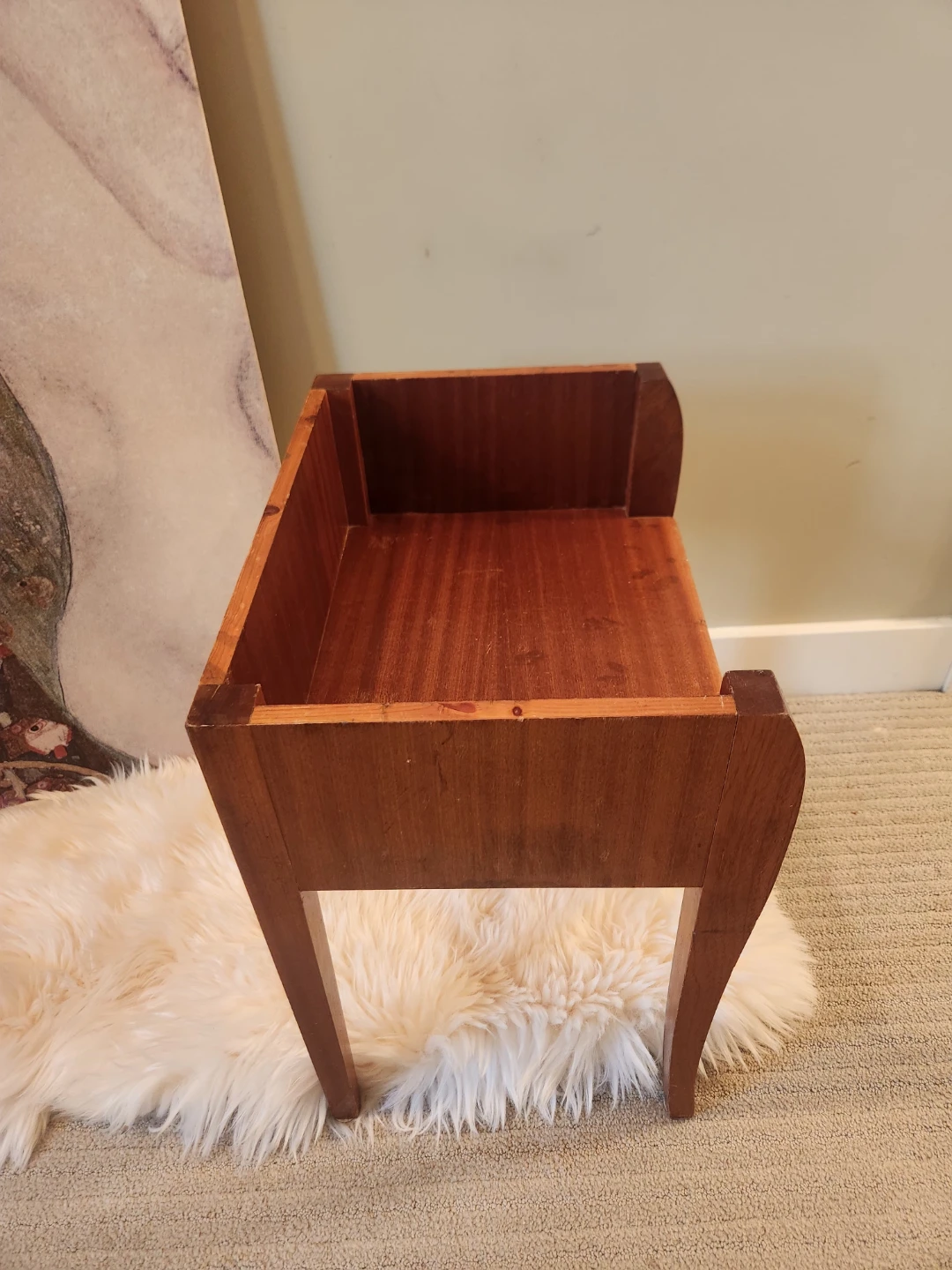 Eclectic Art Deco style piece. Solid wood plant stand, vanity seat, side or night table. Ready to display your favourite plants, books, lamps or other decorative items. Its warm wood tone would fit in well in any home! surface measures 13x17, top surround is 6 inches high, table is 20 inches high.