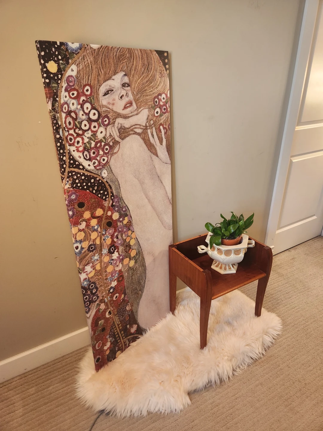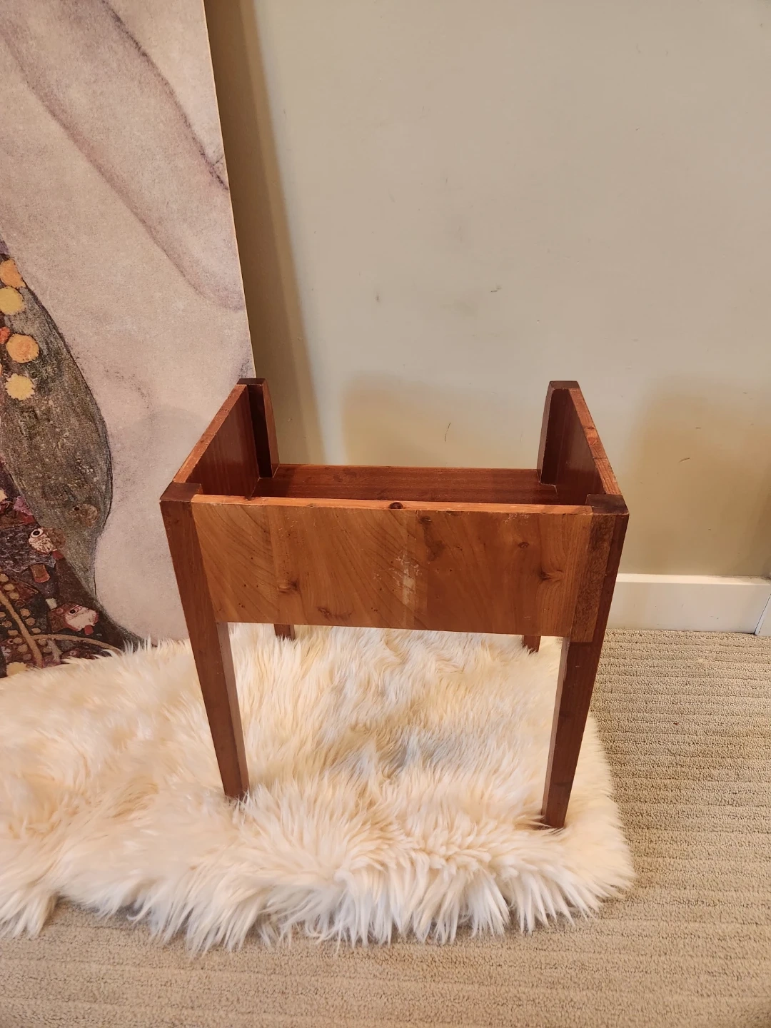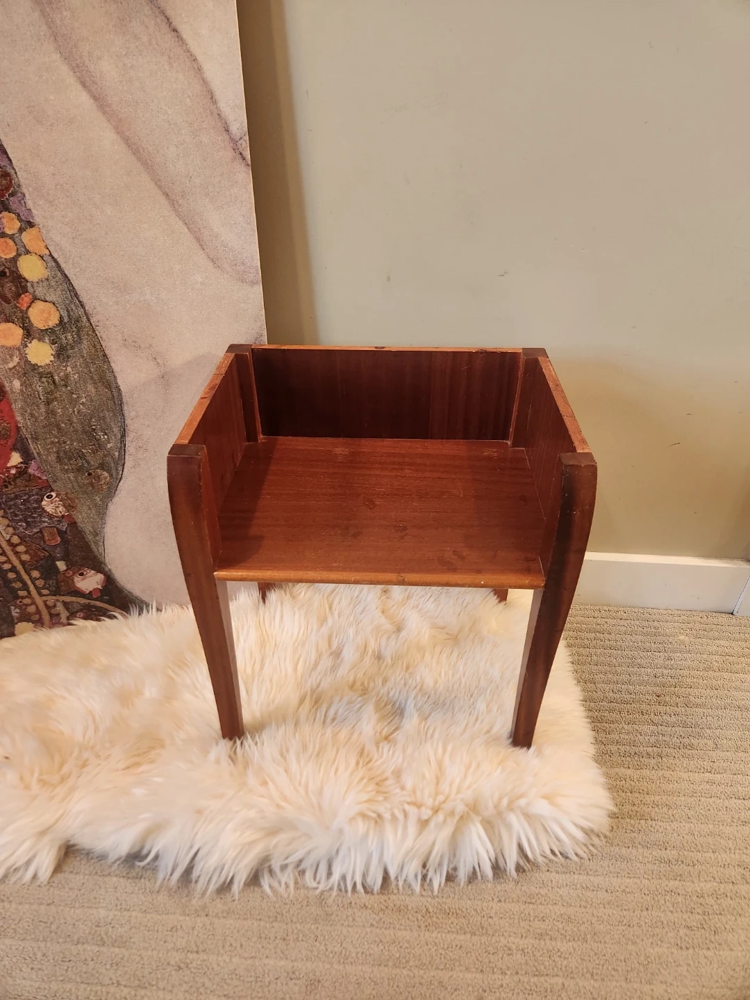 Eclectic Art Deco style piece. Solid wood plant stand, vanity seat, side or night table. Ready to display your favourite plants, books, lamps or other decorative items. Its warm wood tone would fit in well in any home! surface measures 13x17, top surround is 6 inches high, table is 20 inches high.